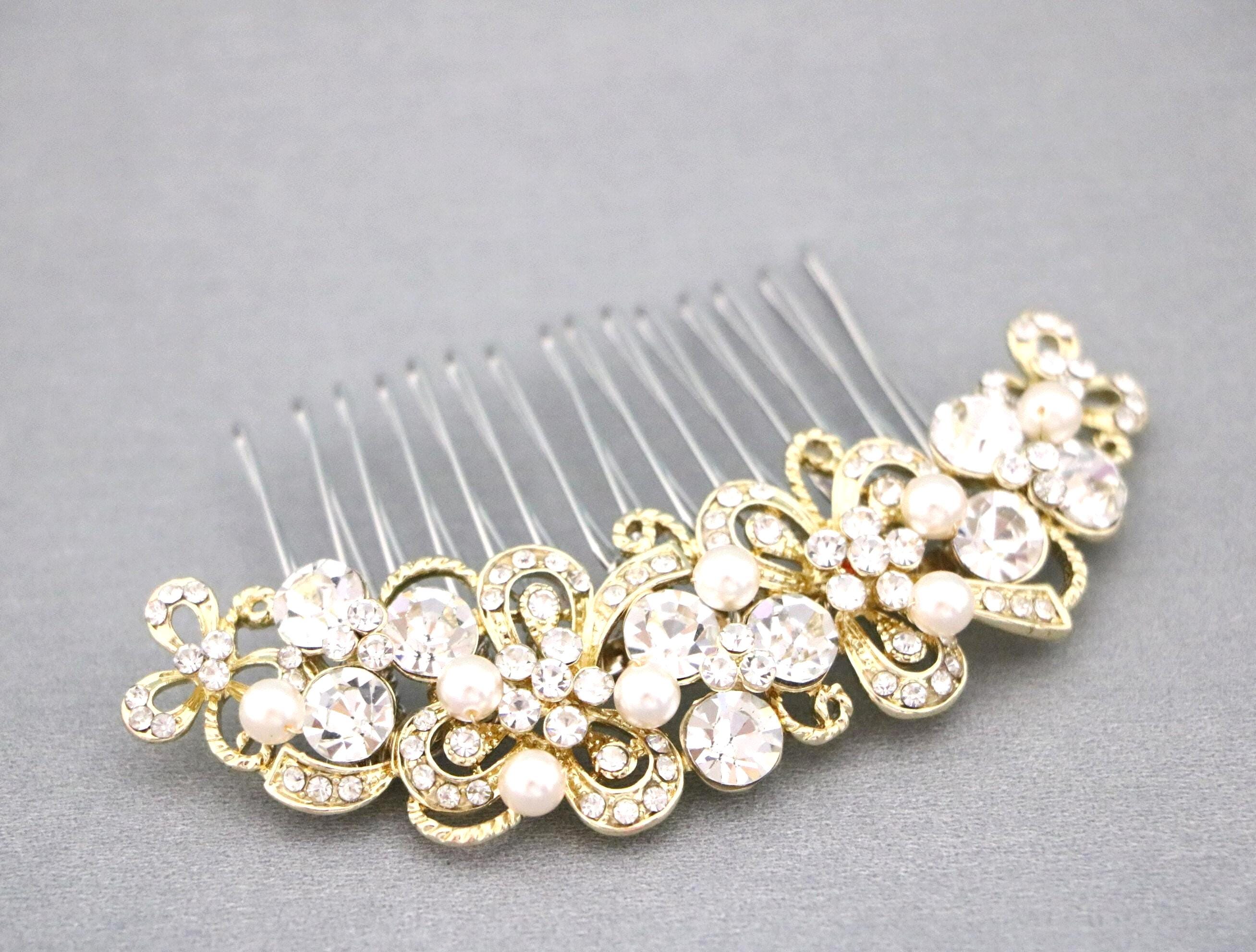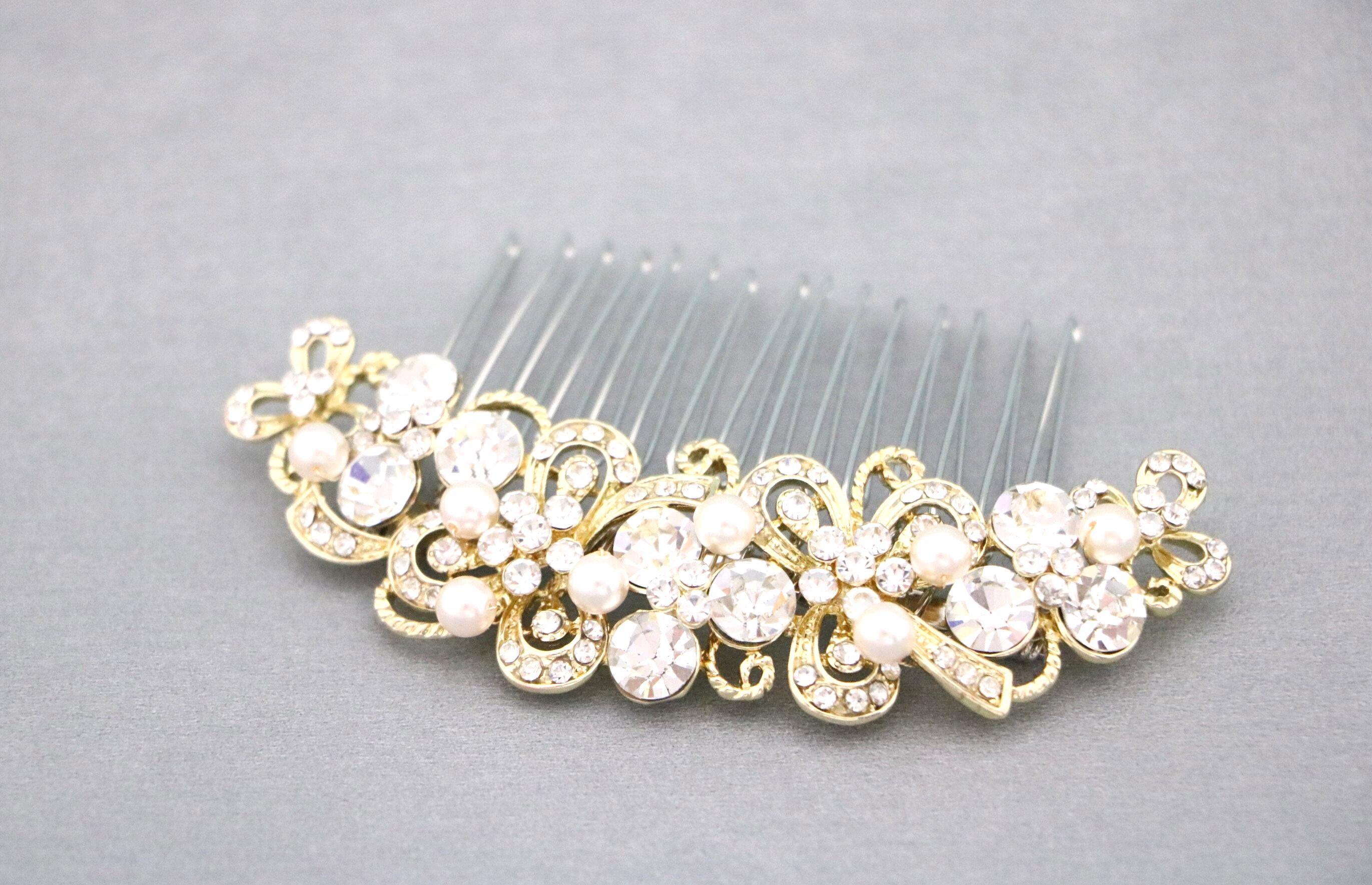 Pearl hair comb Gold Bridal hair piece Wedding hair jewelry Pearl drop Bridal earrings Rhinestone Wedding hair clip Crystal hair comb Bridal