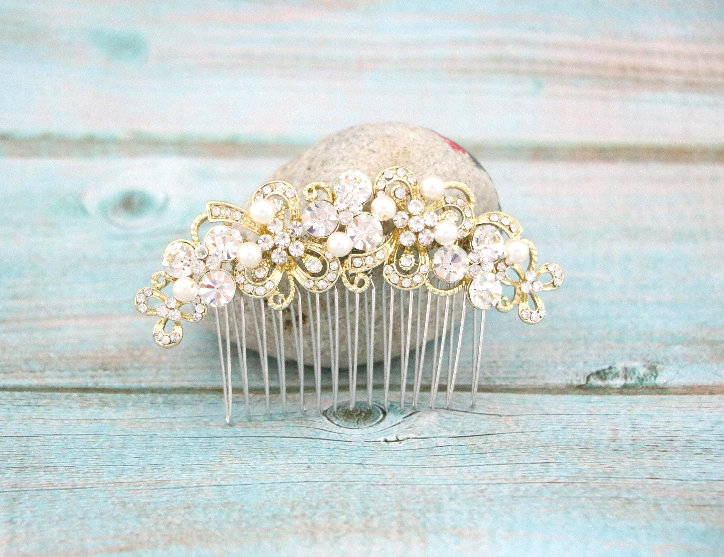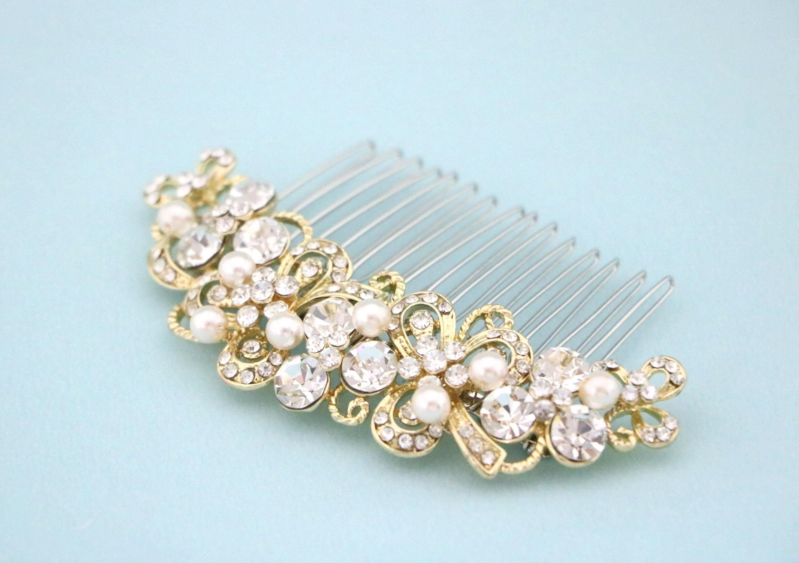This sparkle rhinestone hair comb features a very beautiful vintage style rhinestone piece and Swarovski ivory pearls. Rhinestone piece and pearls are wired on a silver tone metal comb.