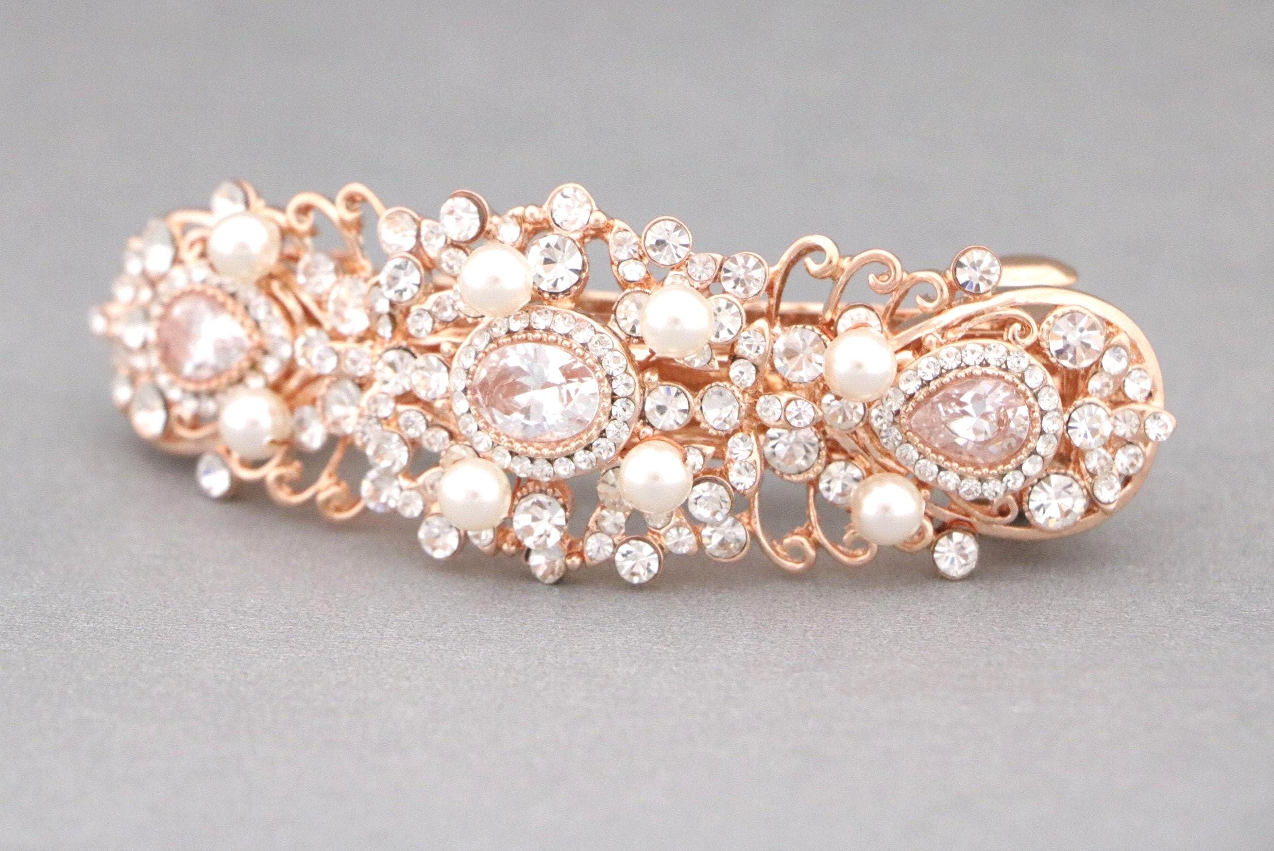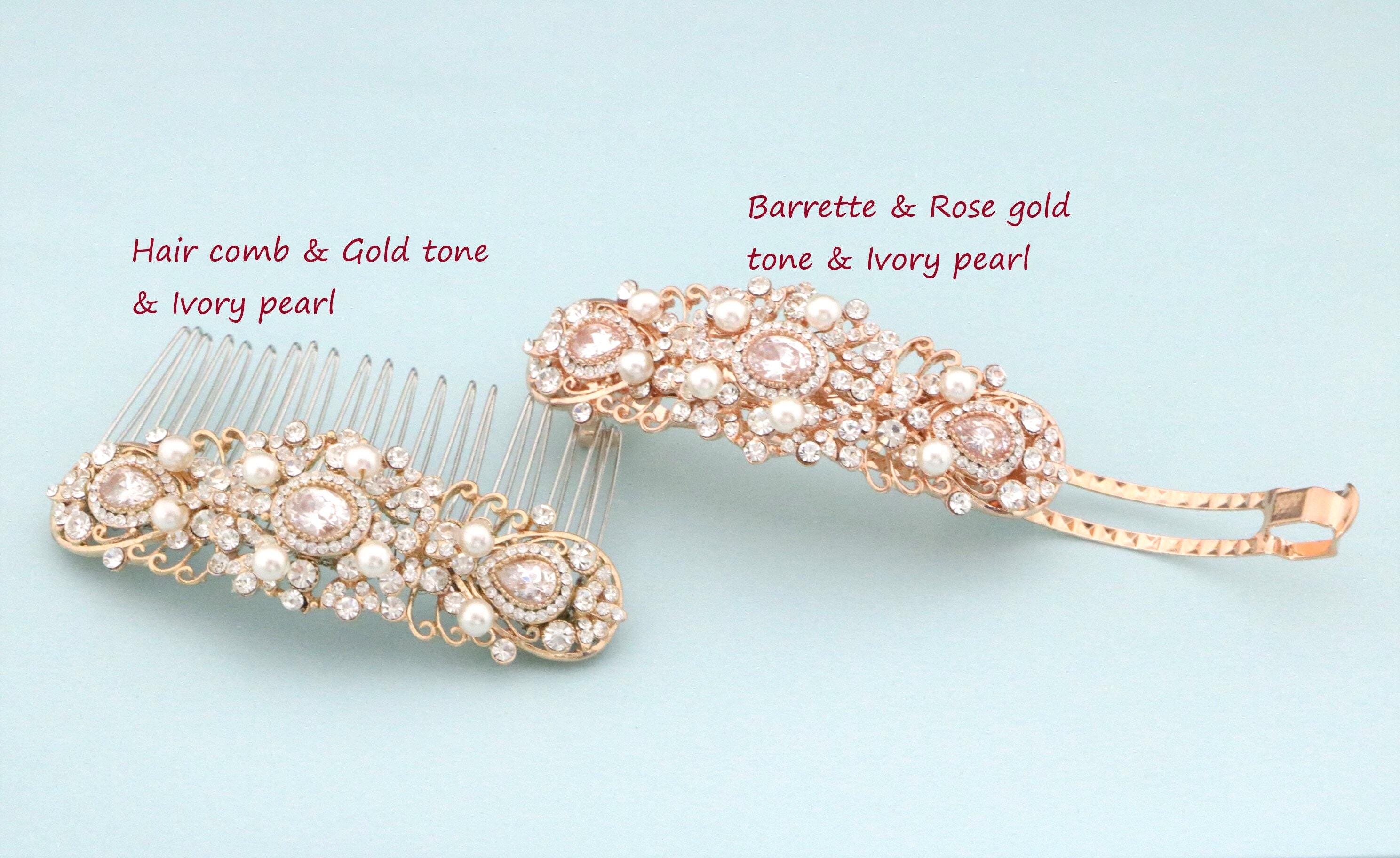This sparkle rhinestone hair comb features a very beautiful vintage style rhinestone piece and Swarovski ivory pearls. Rhinestone piece and pearls are set it on a metal barrette or on a metal hair comb. The rhinestone part measures approximately 3.75 X 1.25 inches.