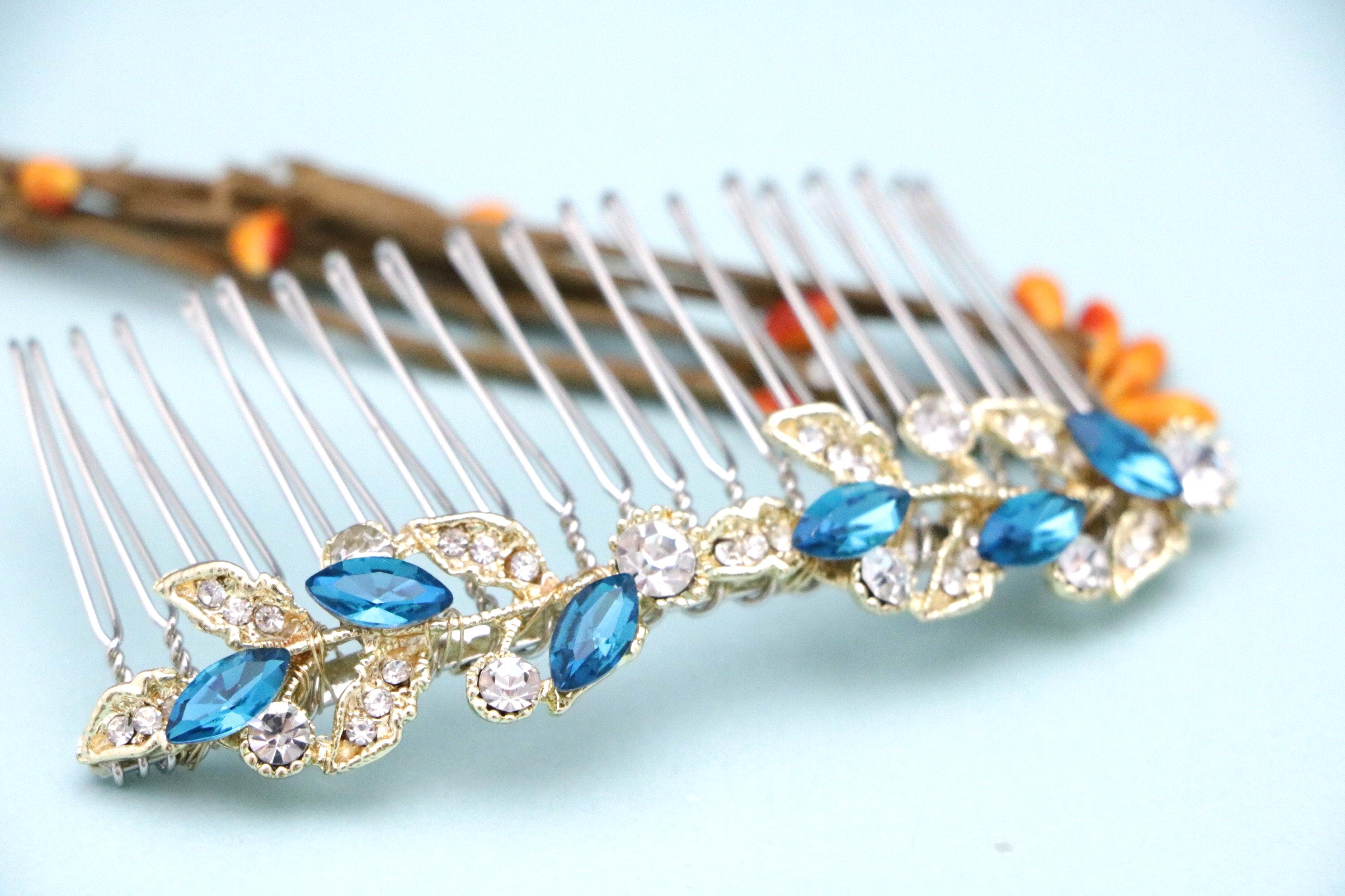 This beautiful Clear rhinestone and Montana Crystal hair comb is a perfect compliment for the wedding party and can easily fit into any hair style. The Rhinestone part measured approximately 3.5 X 0.75 inches.