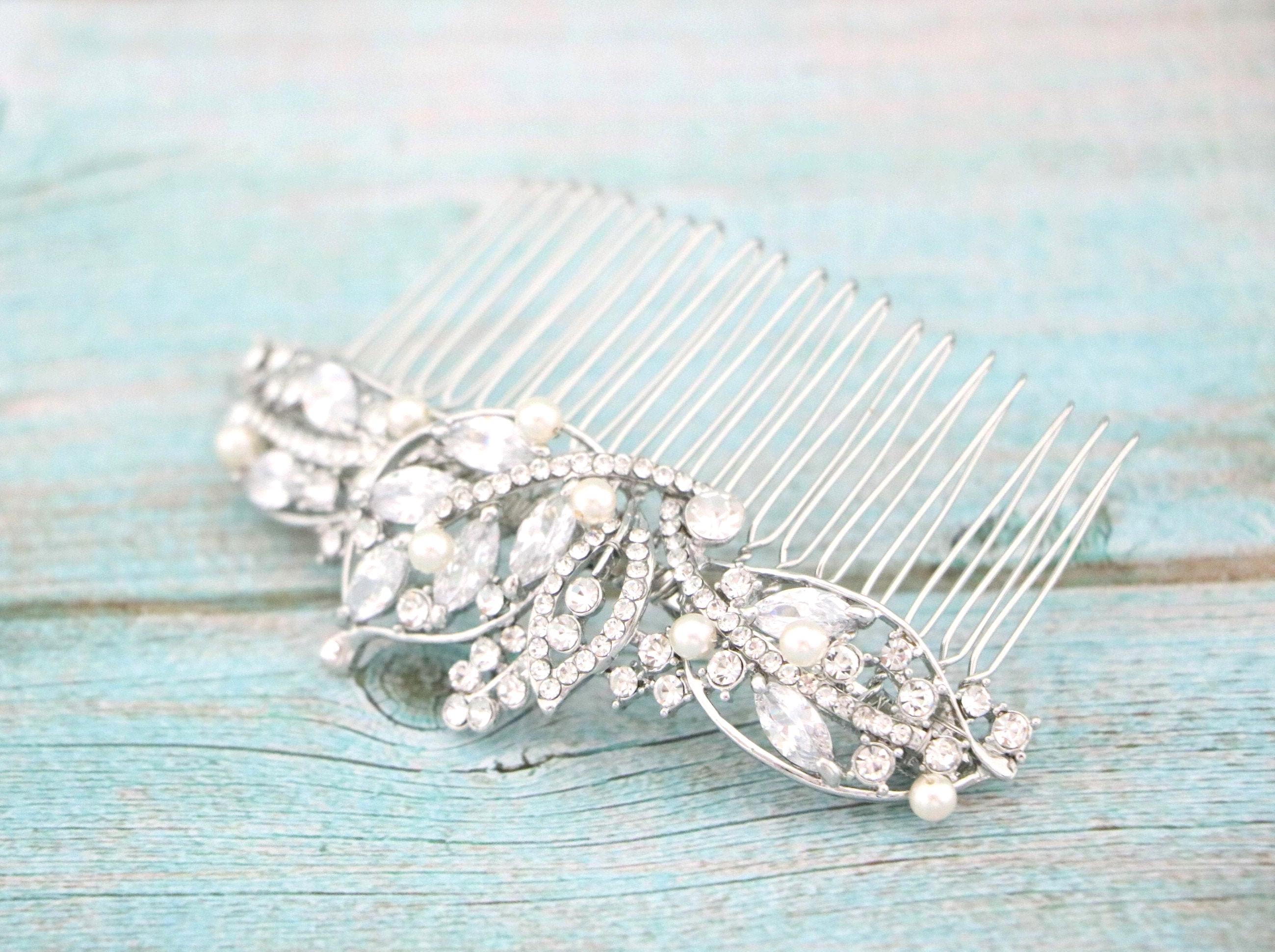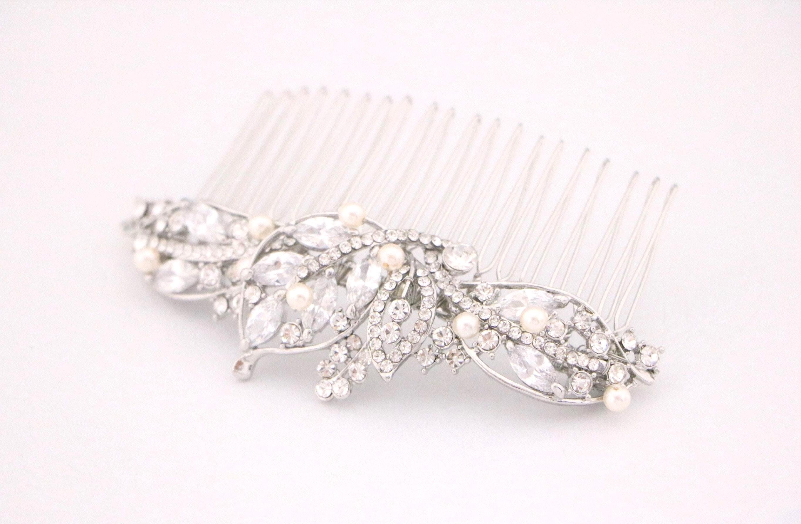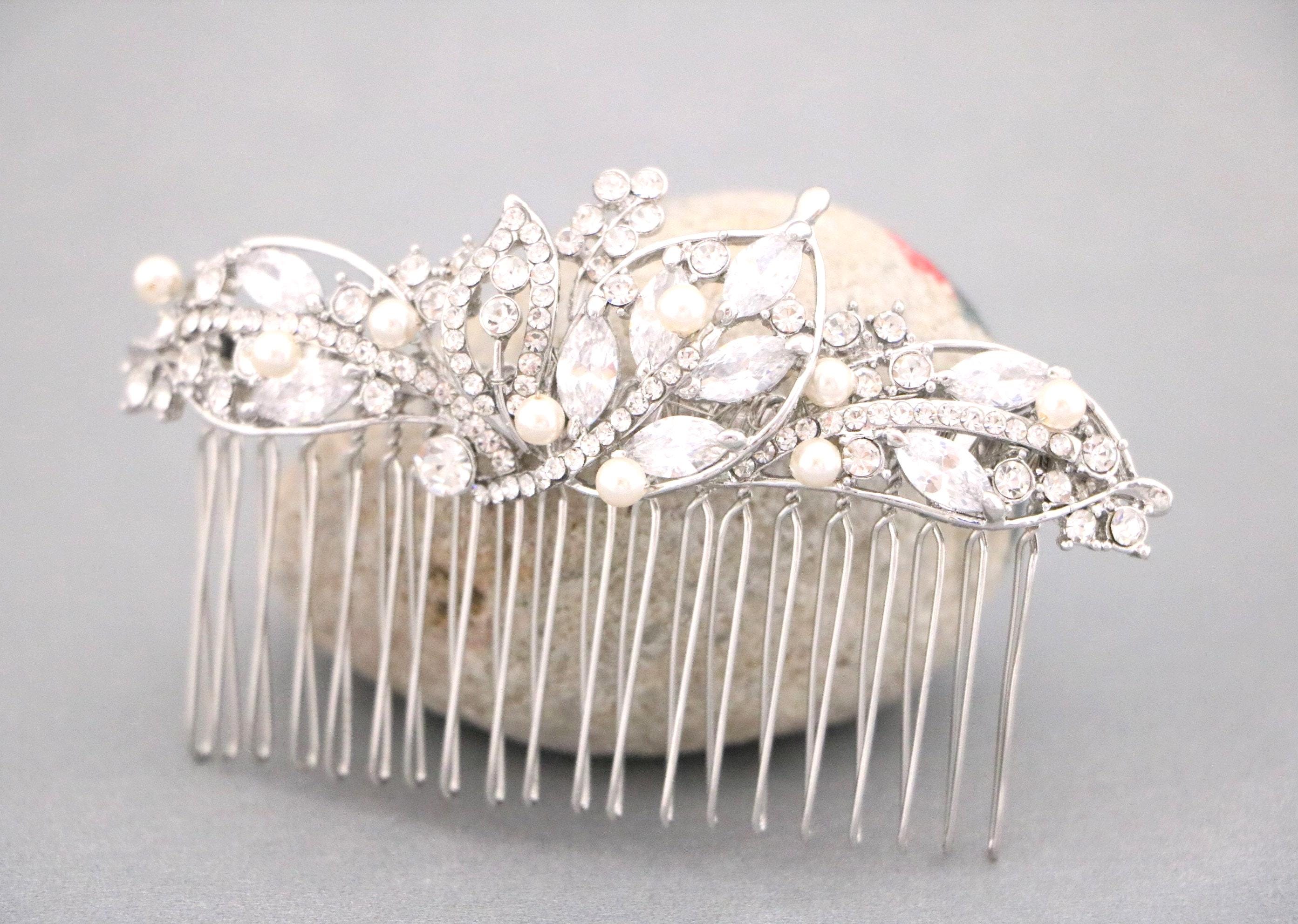 This sparkle rhinestone hair comb features a very beautiful vintage style rhinestone hair comb. Rhinestone piece are set it on a metal barrette or on a metal hair comb. The rhinestone part measures approximately 4.25 X 1.25 inches.
