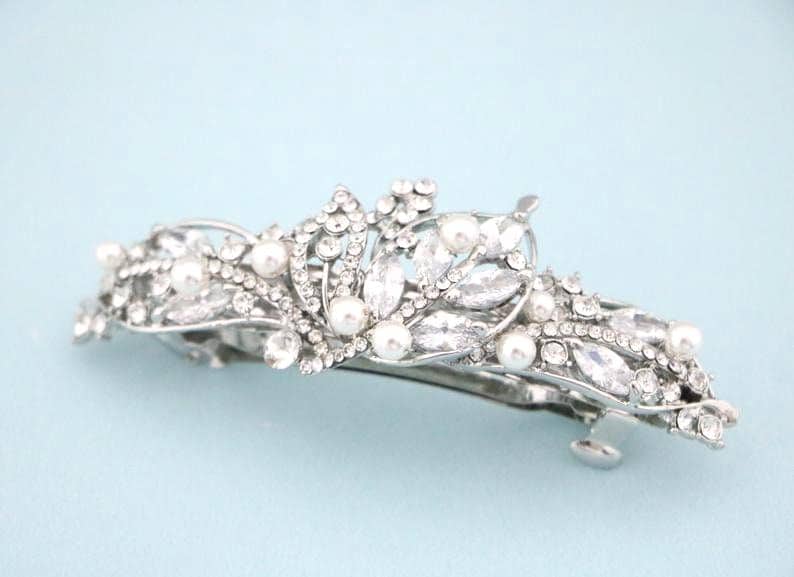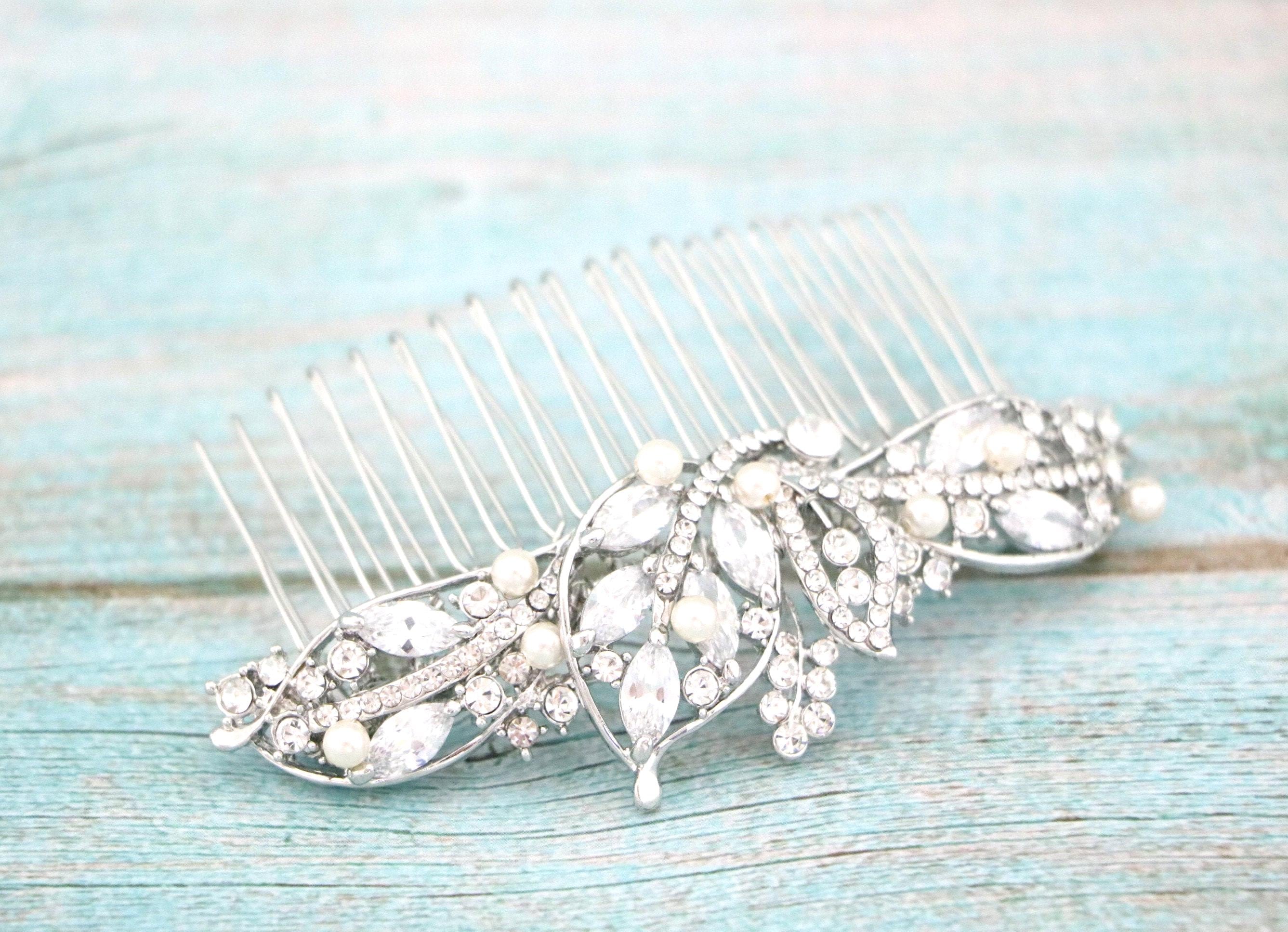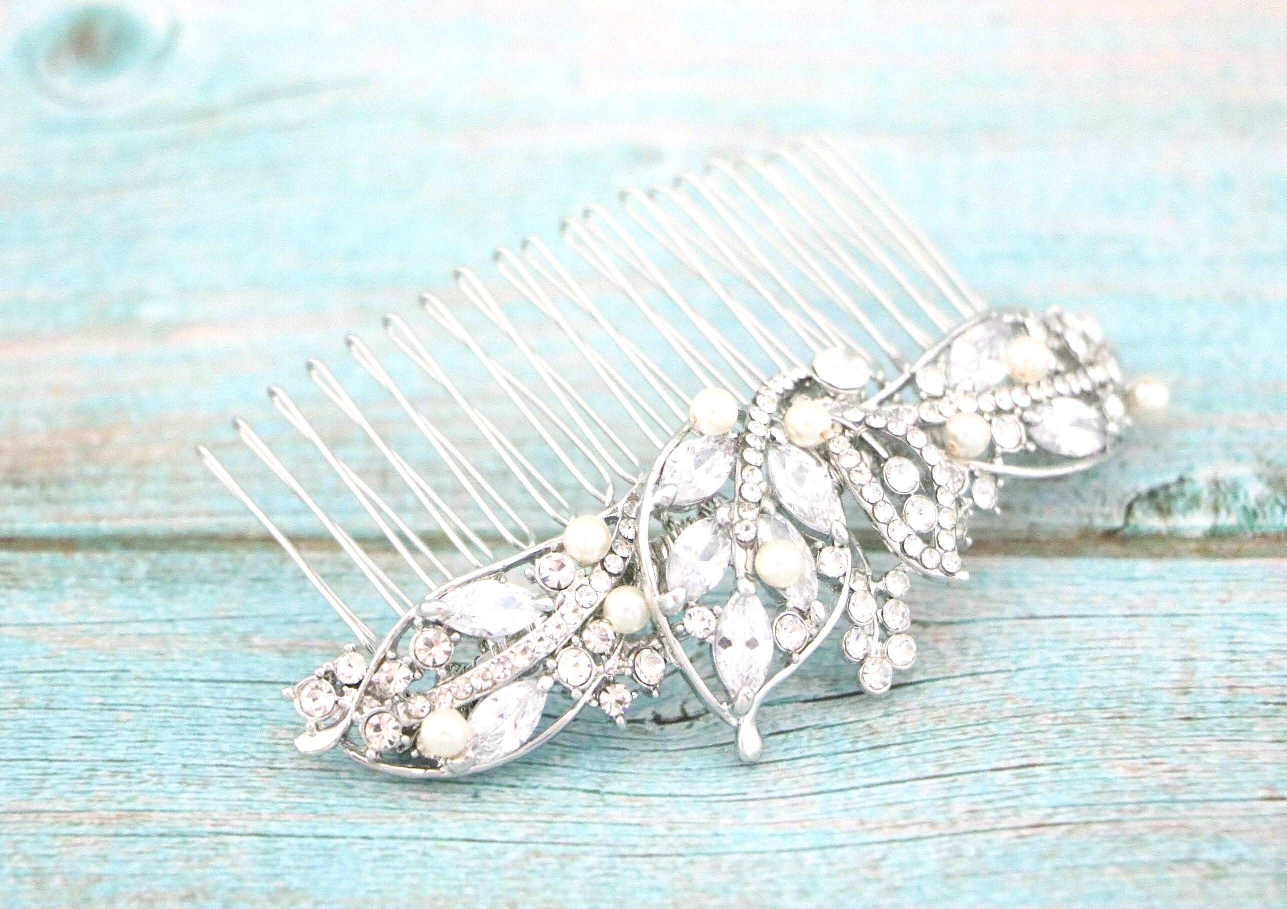 This sparkle rhinestone hair comb features a very beautiful vintage style rhinestone hair comb. Rhinestone piece are set it on a metal barrette or on a metal hair comb. The rhinestone part measures approximately 4.25 X 1.25 inches.