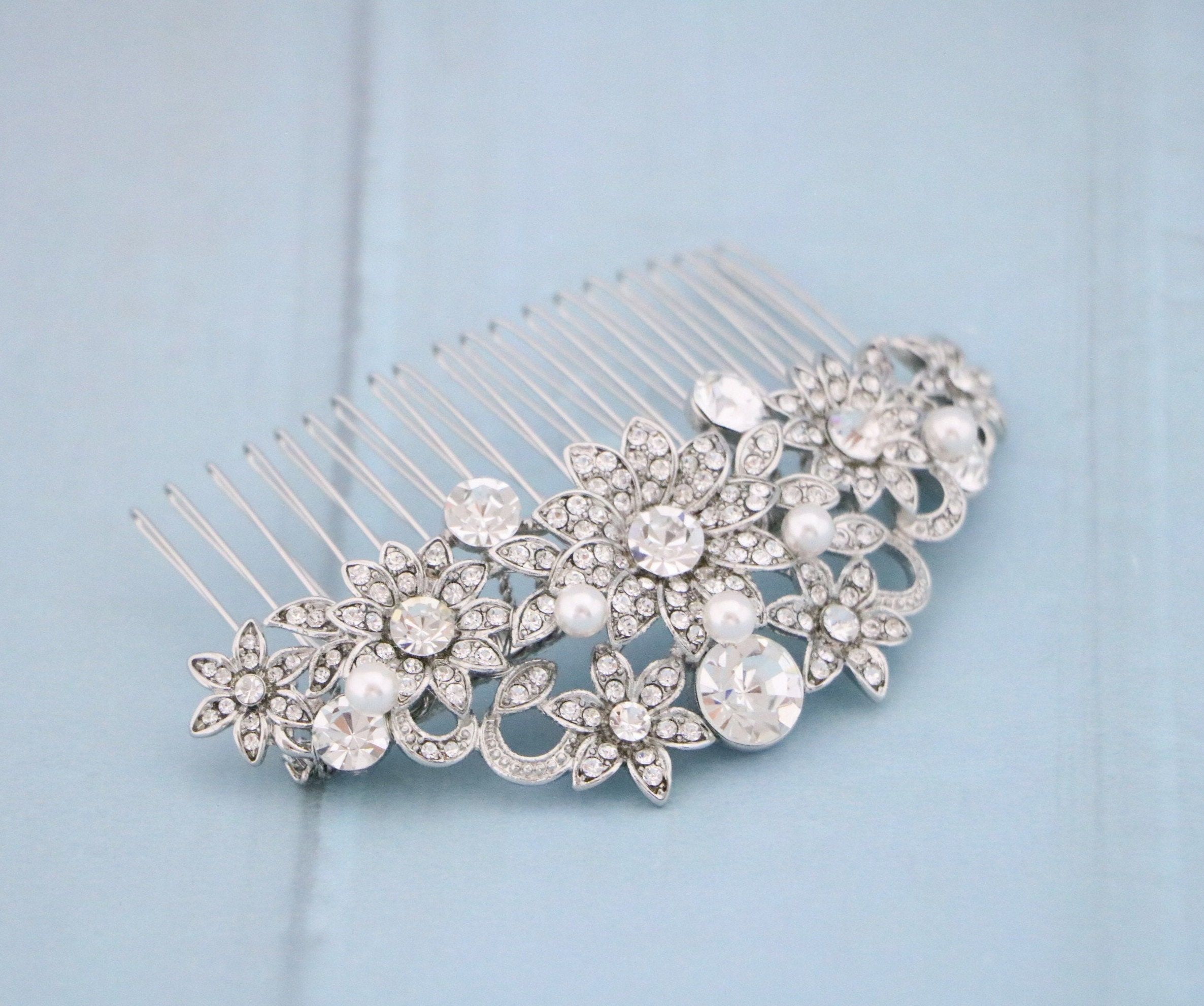 This beautiful Clear rhinestone Swarovski white pearl hair comb is a perfect compliment for the wedding party and can easily fit into any hair style. The Rhinestone part is measured approx. 3.75 X 1.25 inches.