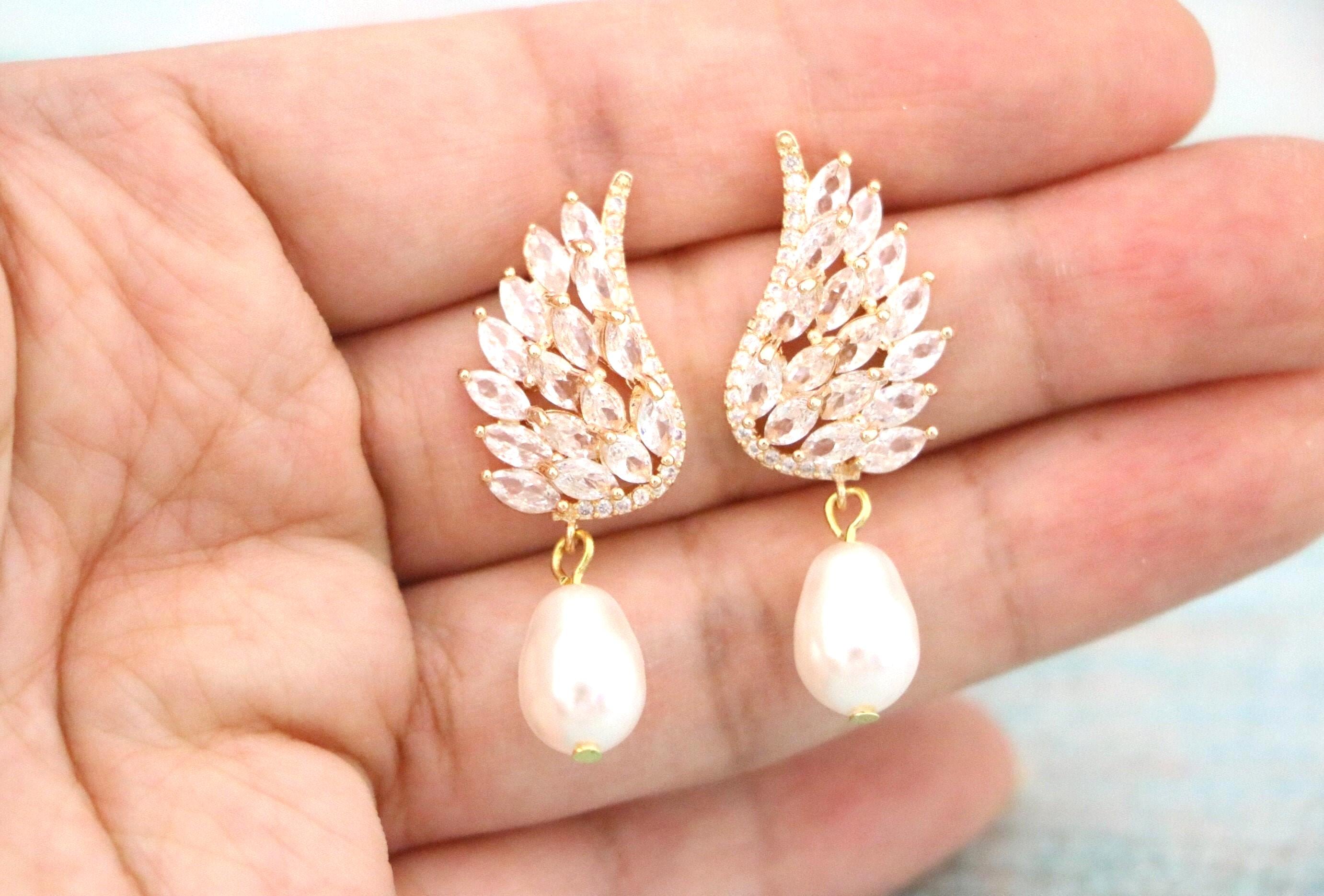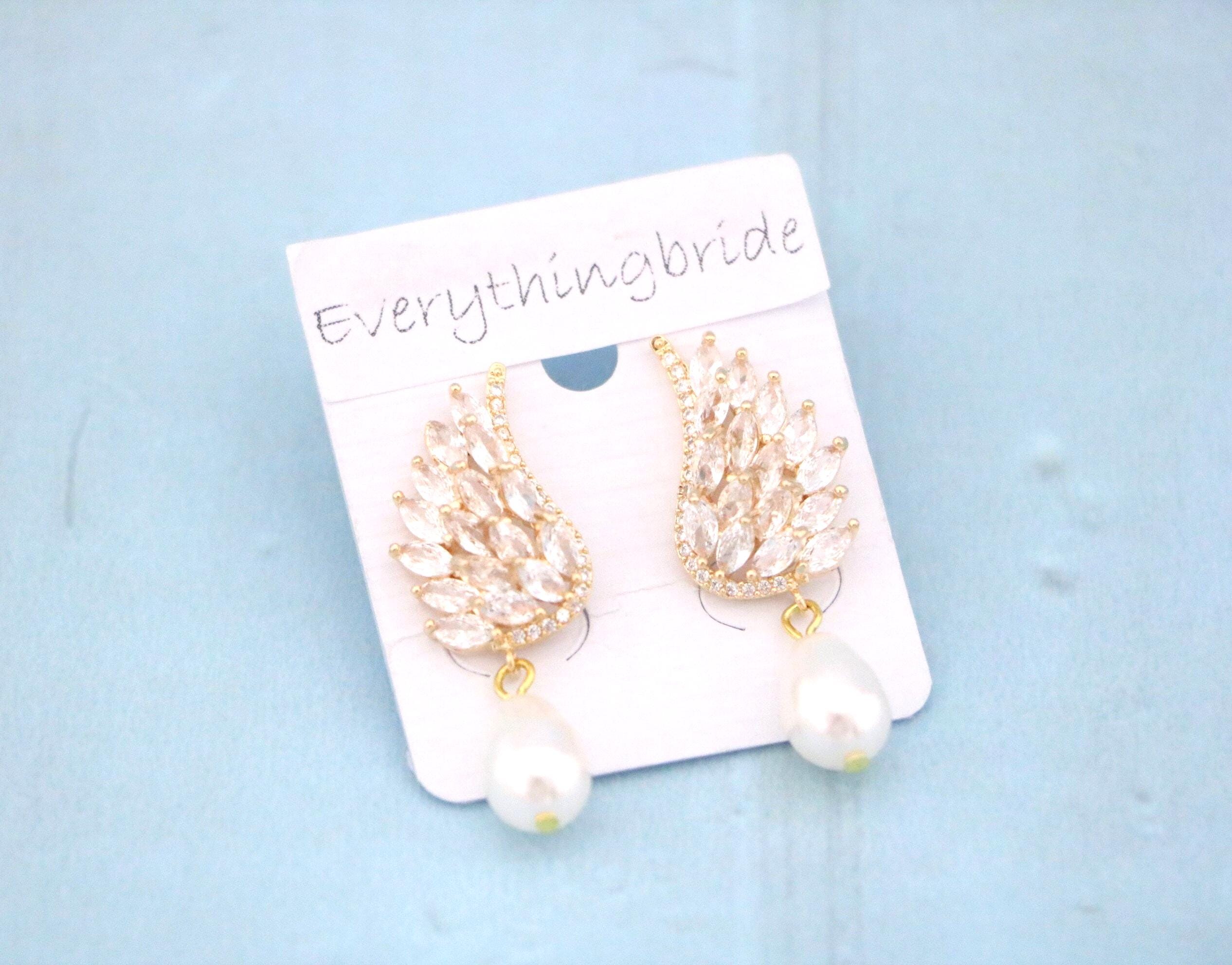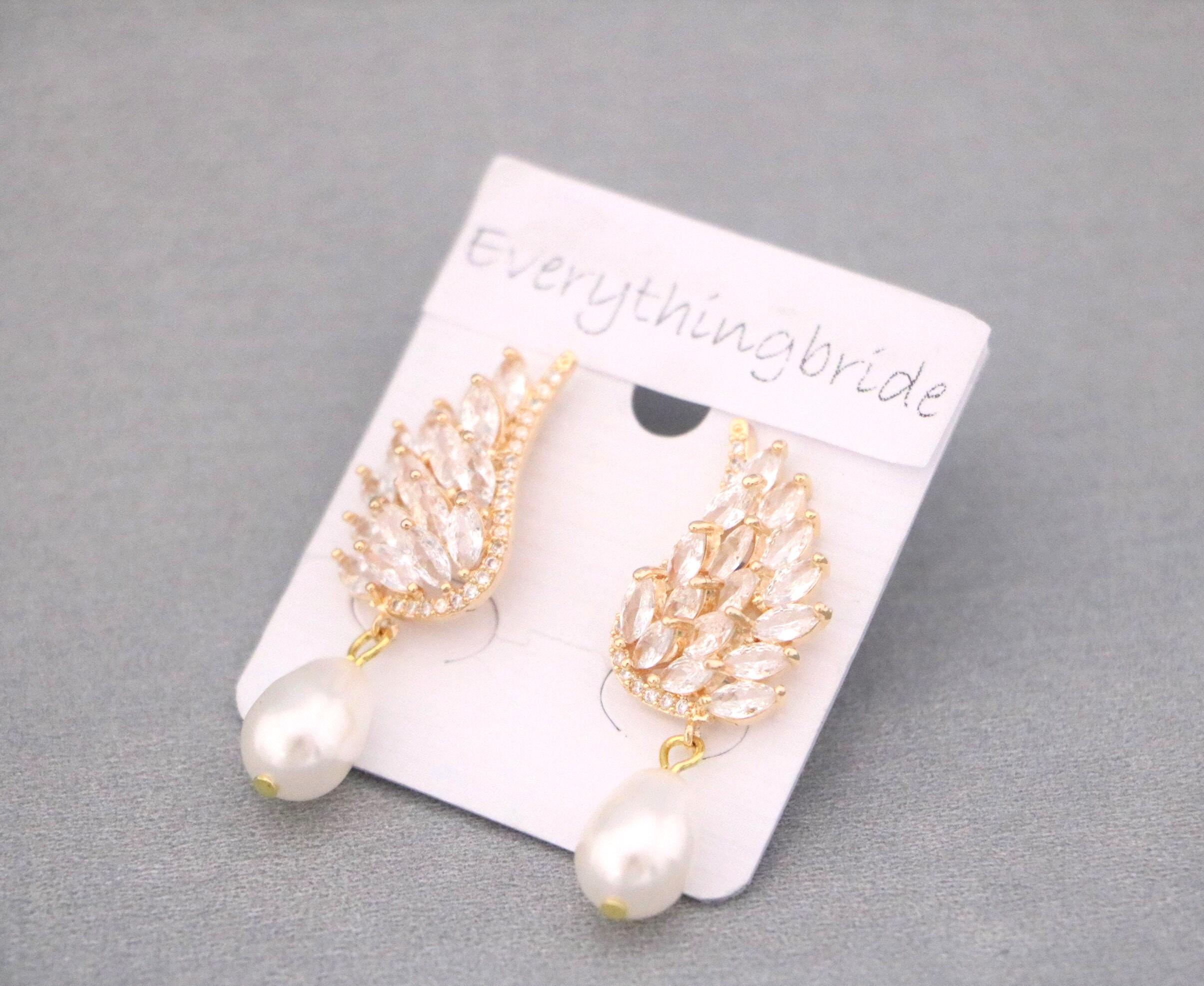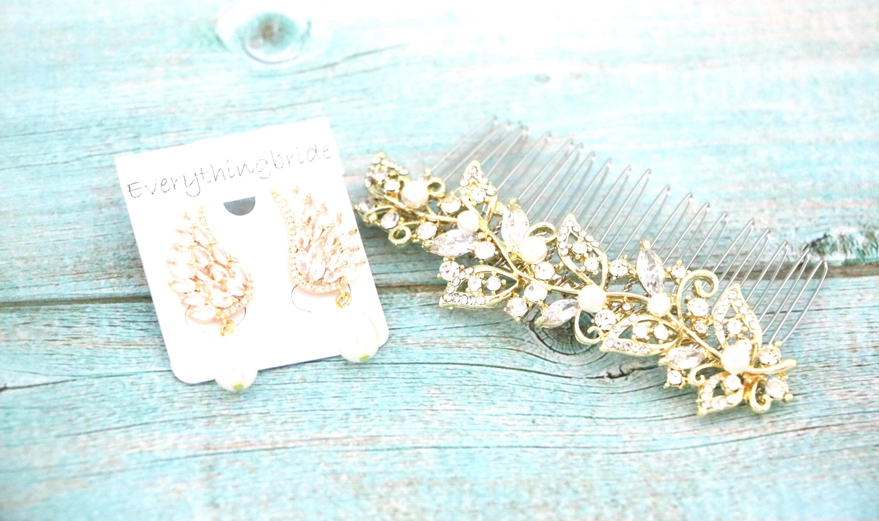 gold pearl simple Wedding Earrings Gold Cubic Zirconia Bride Earrings CZ earrings, bridesmaid earrings, pearl simple jewelry Wedding hair comb Gold Bridal hair comb