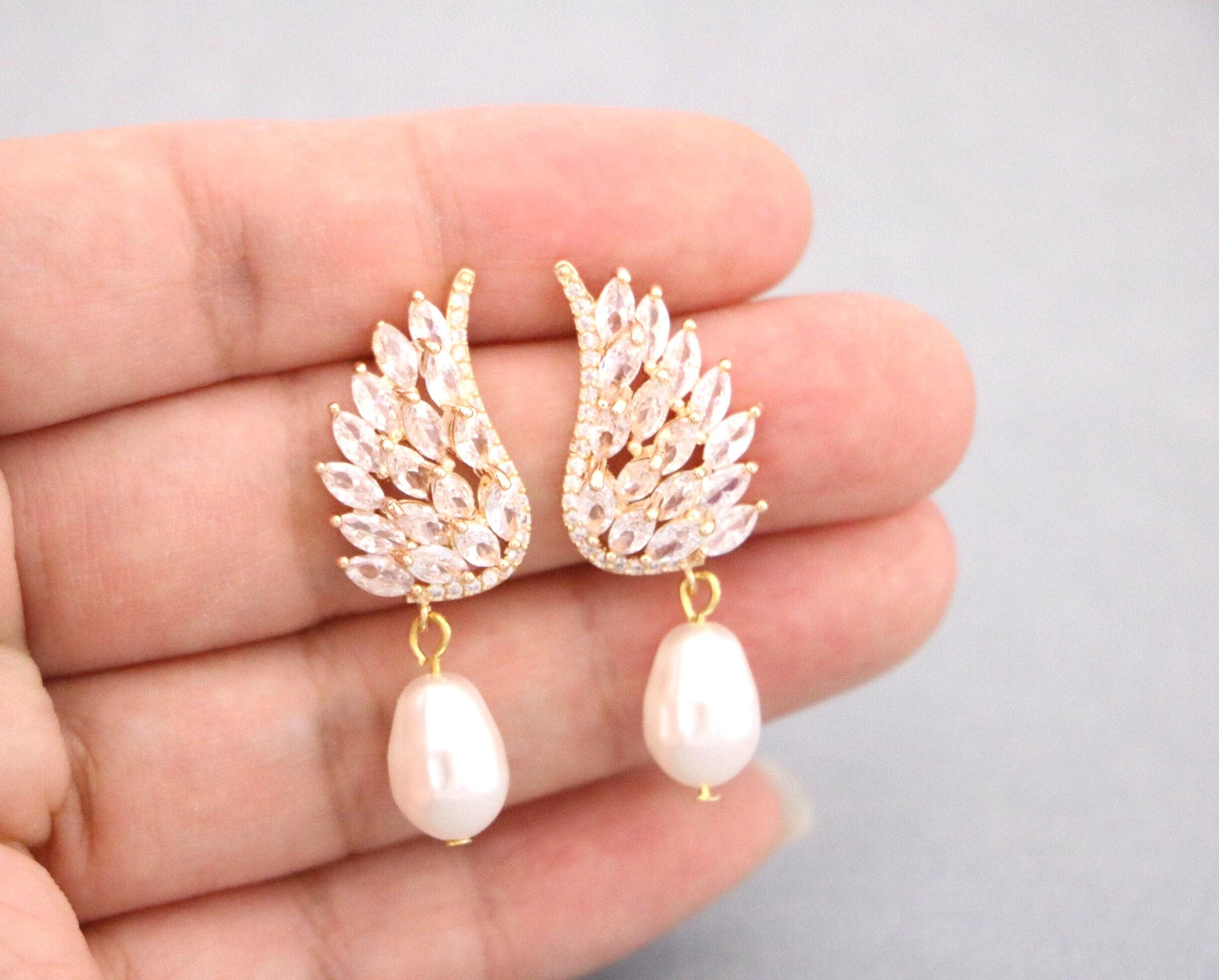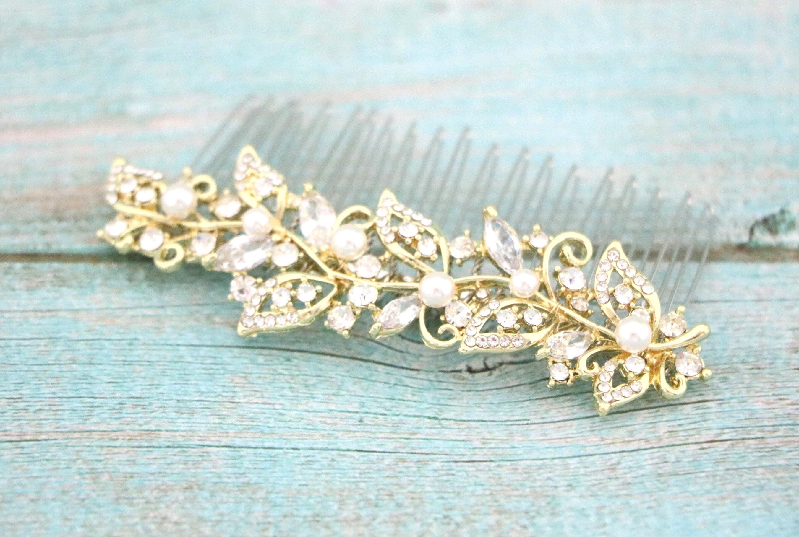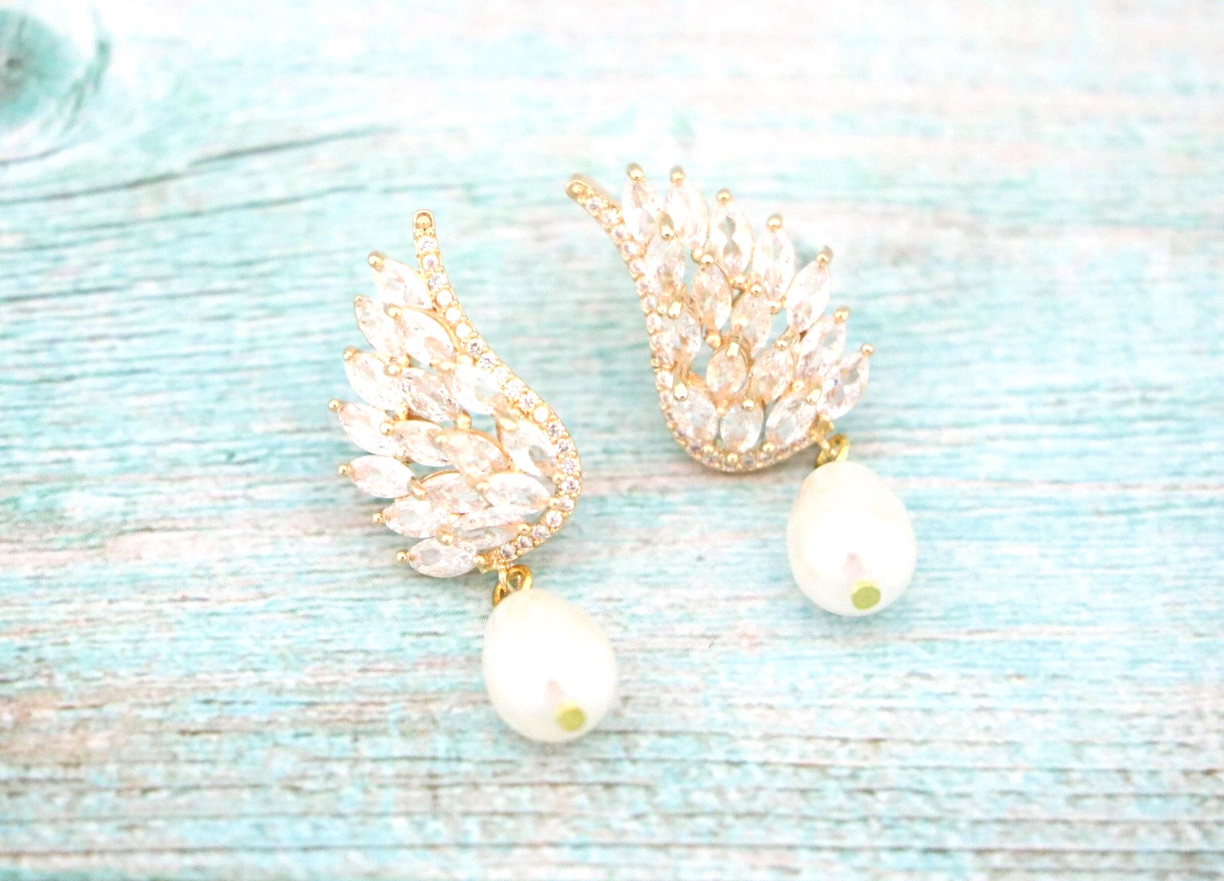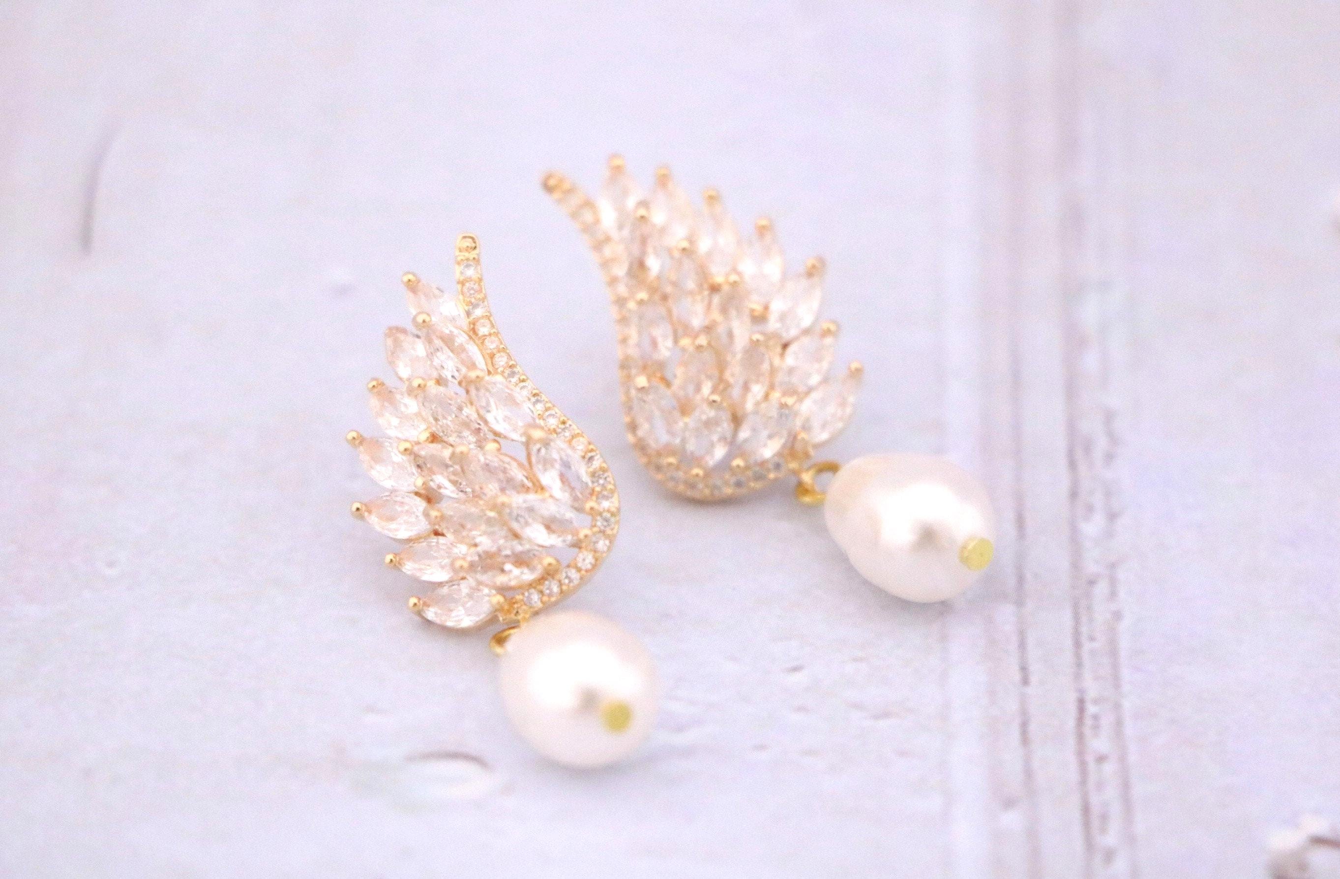 gold pearl simple Wedding Earrings Gold Cubic Zirconia Bride Earrings CZ earrings, bridesmaid earrings, pearl simple jewelry Wedding hair comb Gold Bridal hair comb
