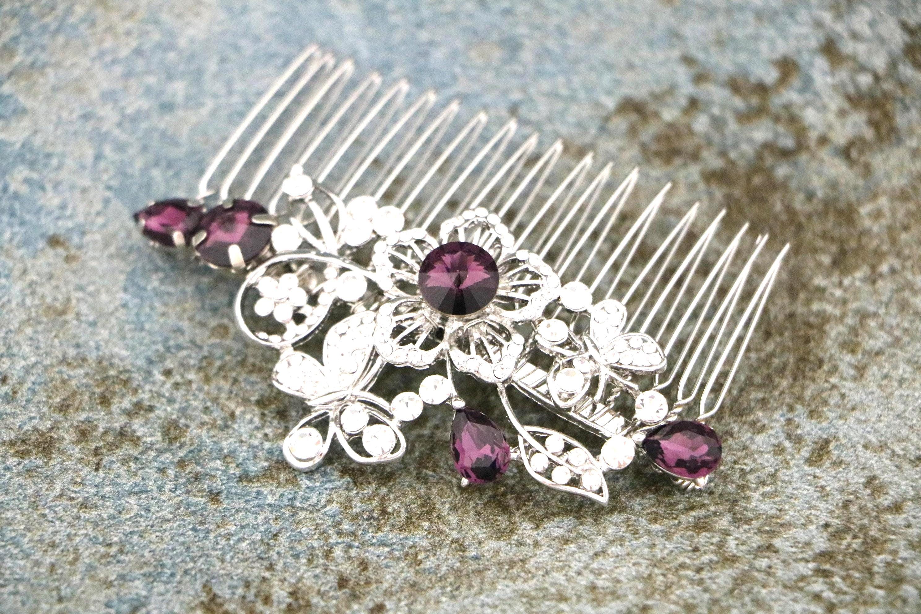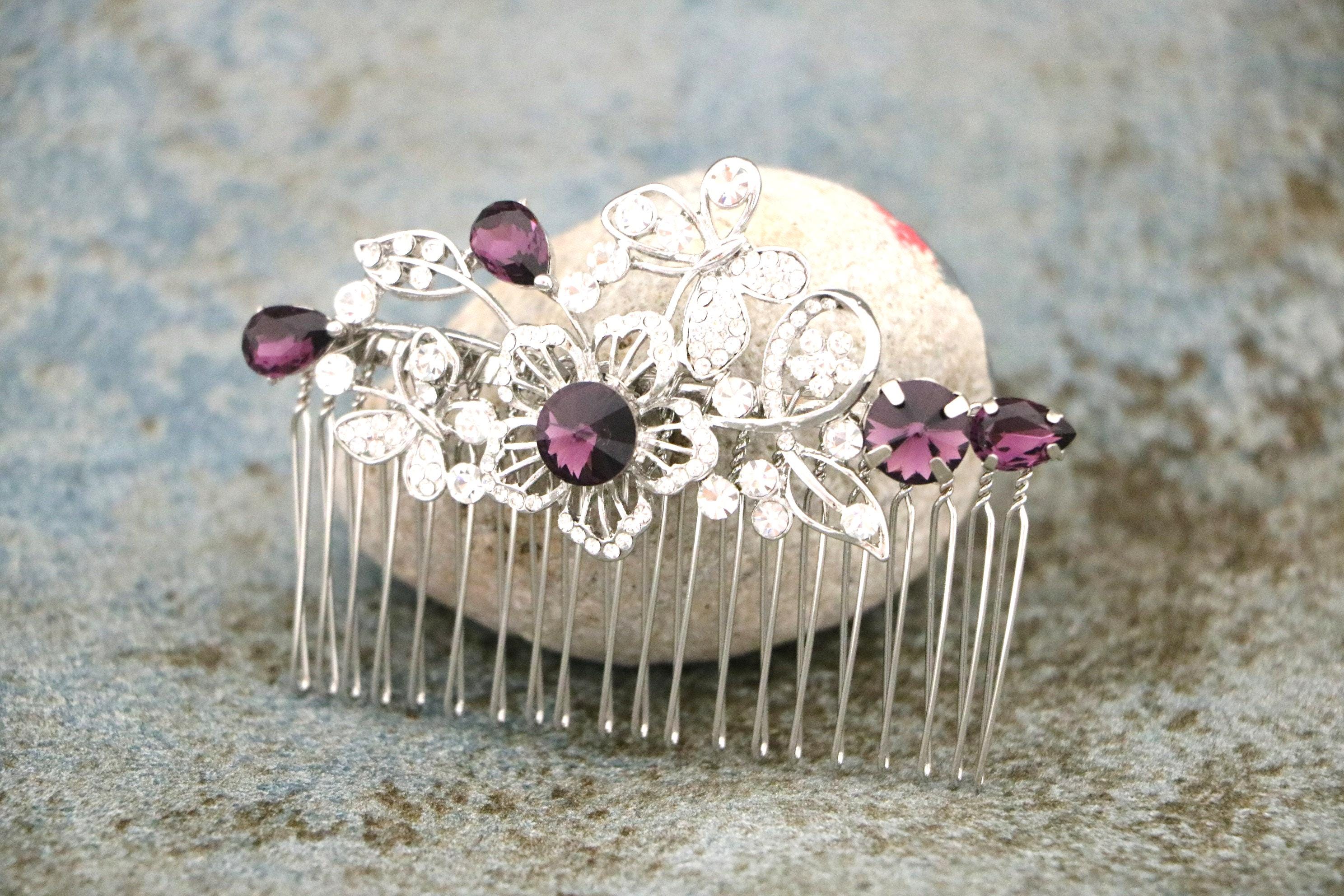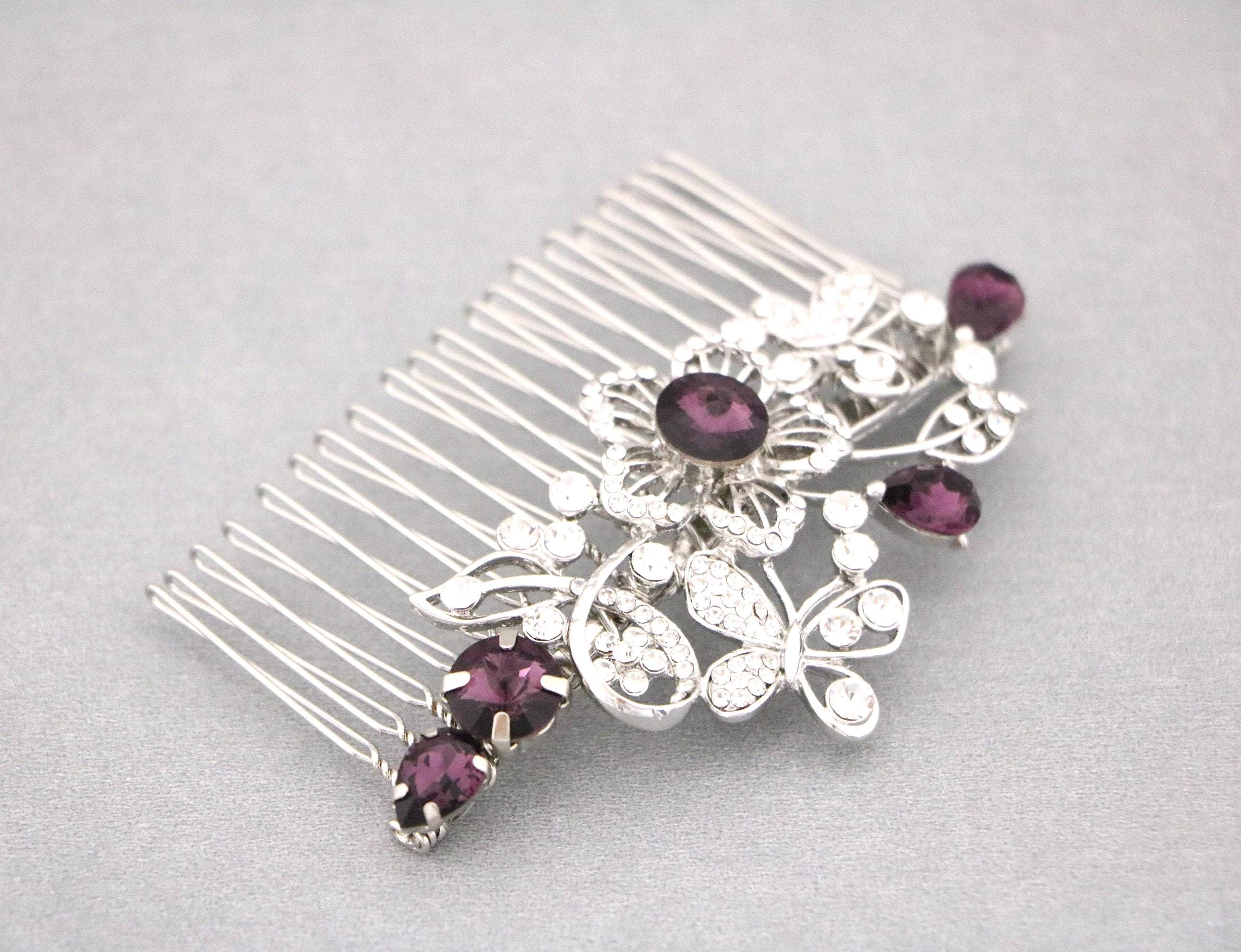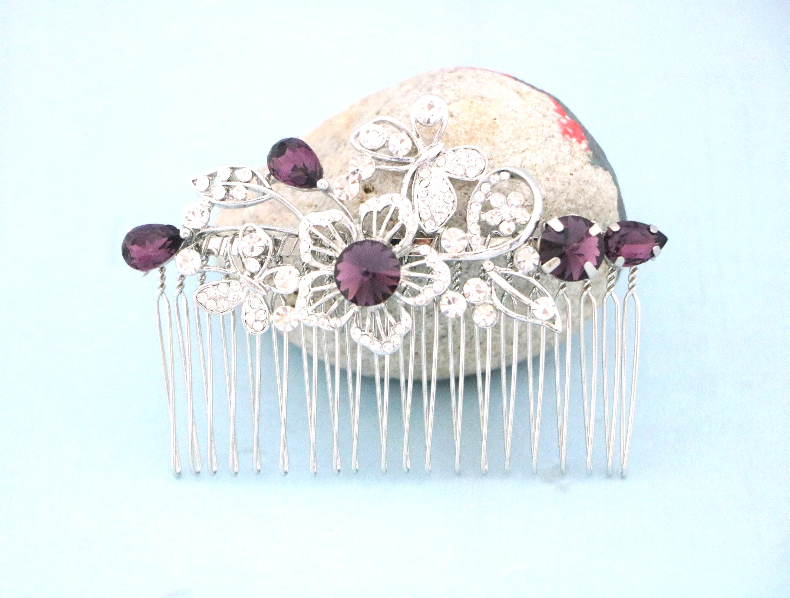 This beautiful Clear rhinestone and Amethyst crystal hair comb is a perfect compliment for the wedding party and can easily fit into any hair style. The Rhinestone part measured approximately 3.5 X 1.75 inches.