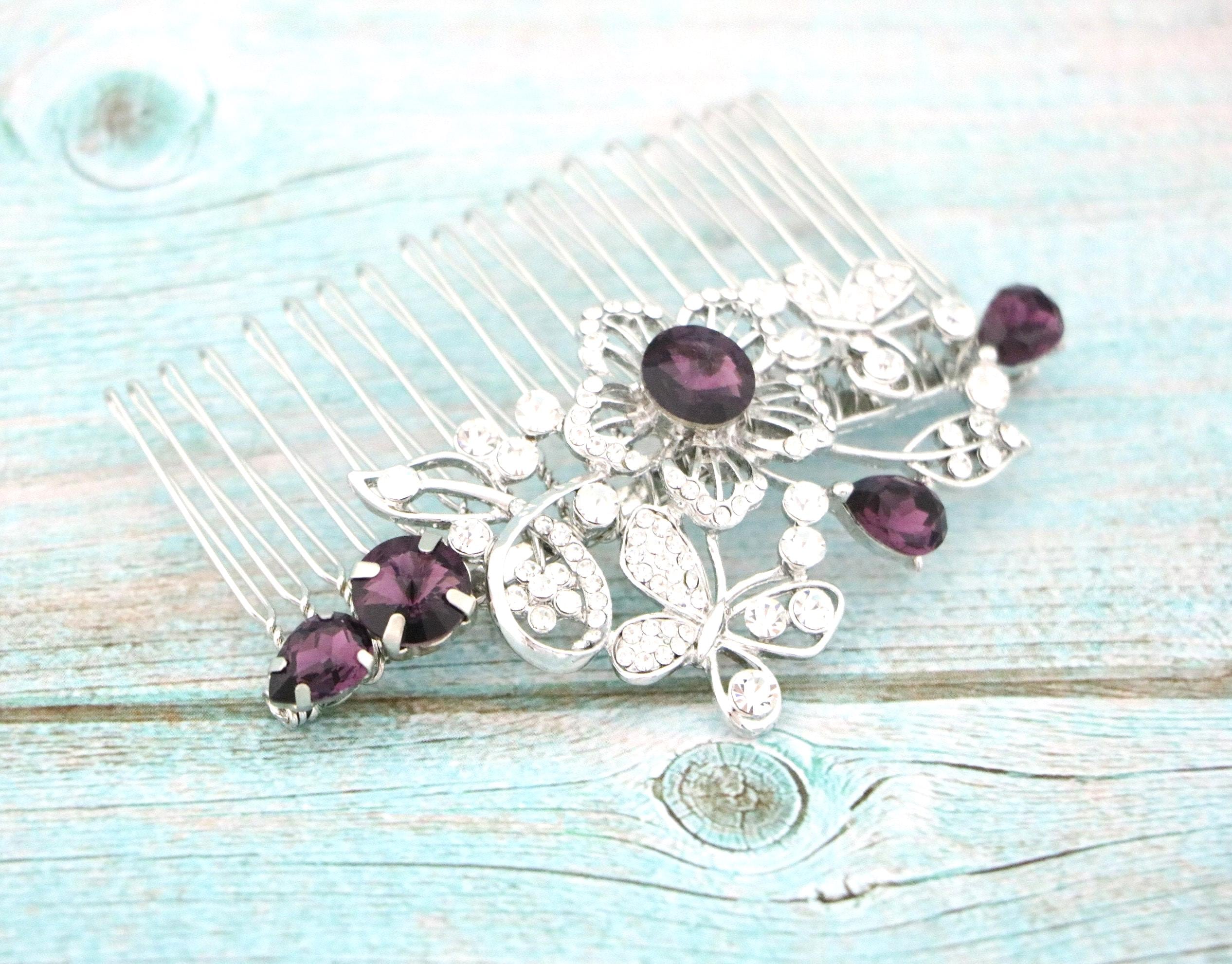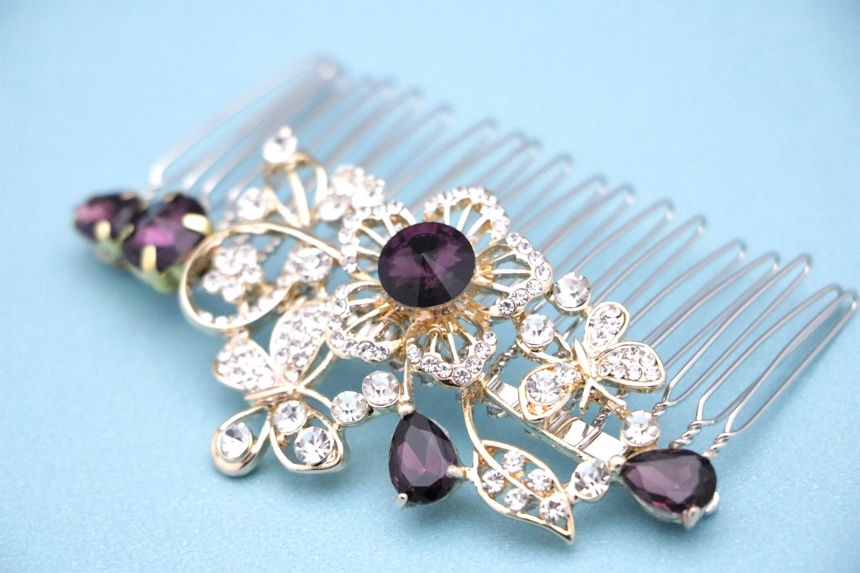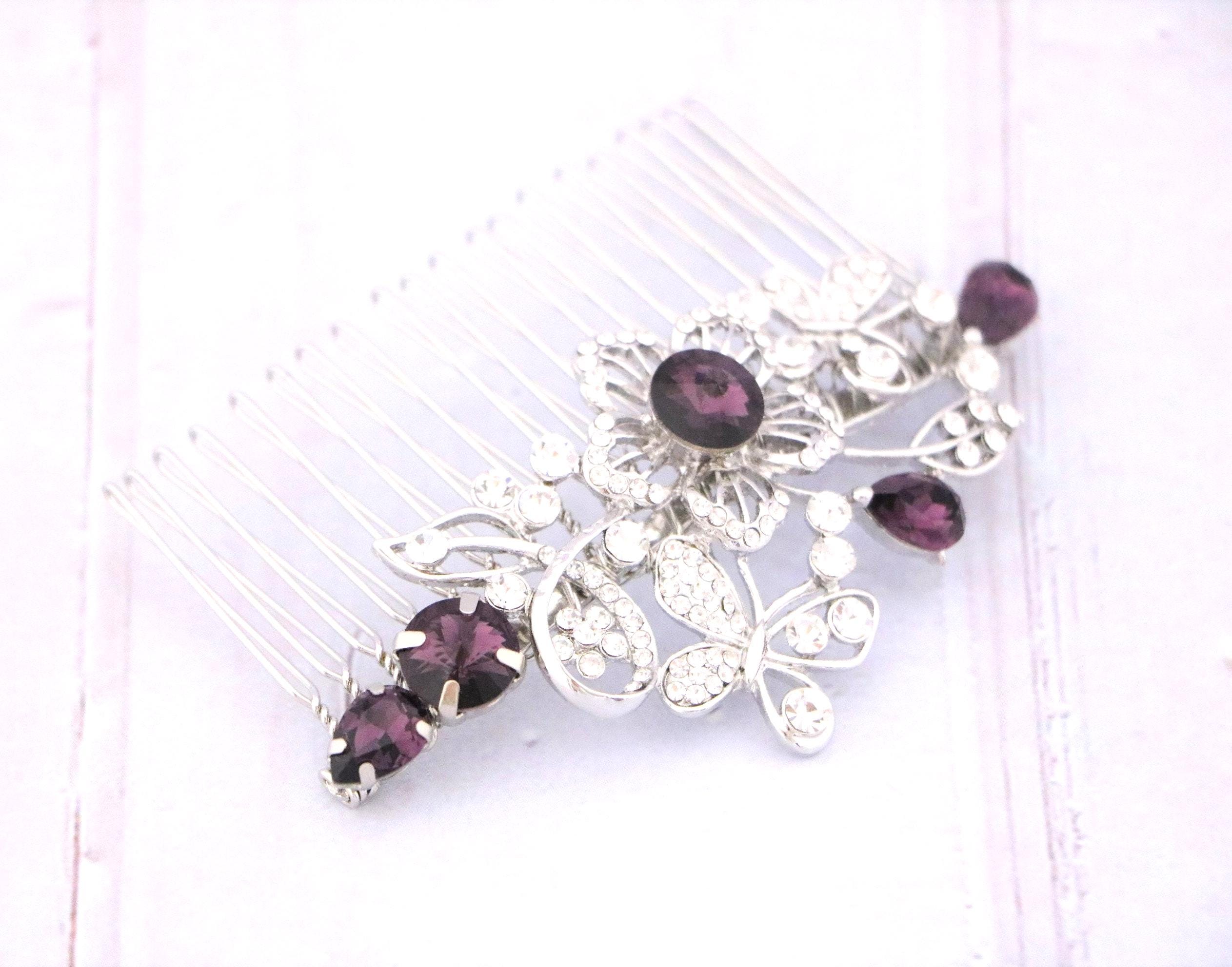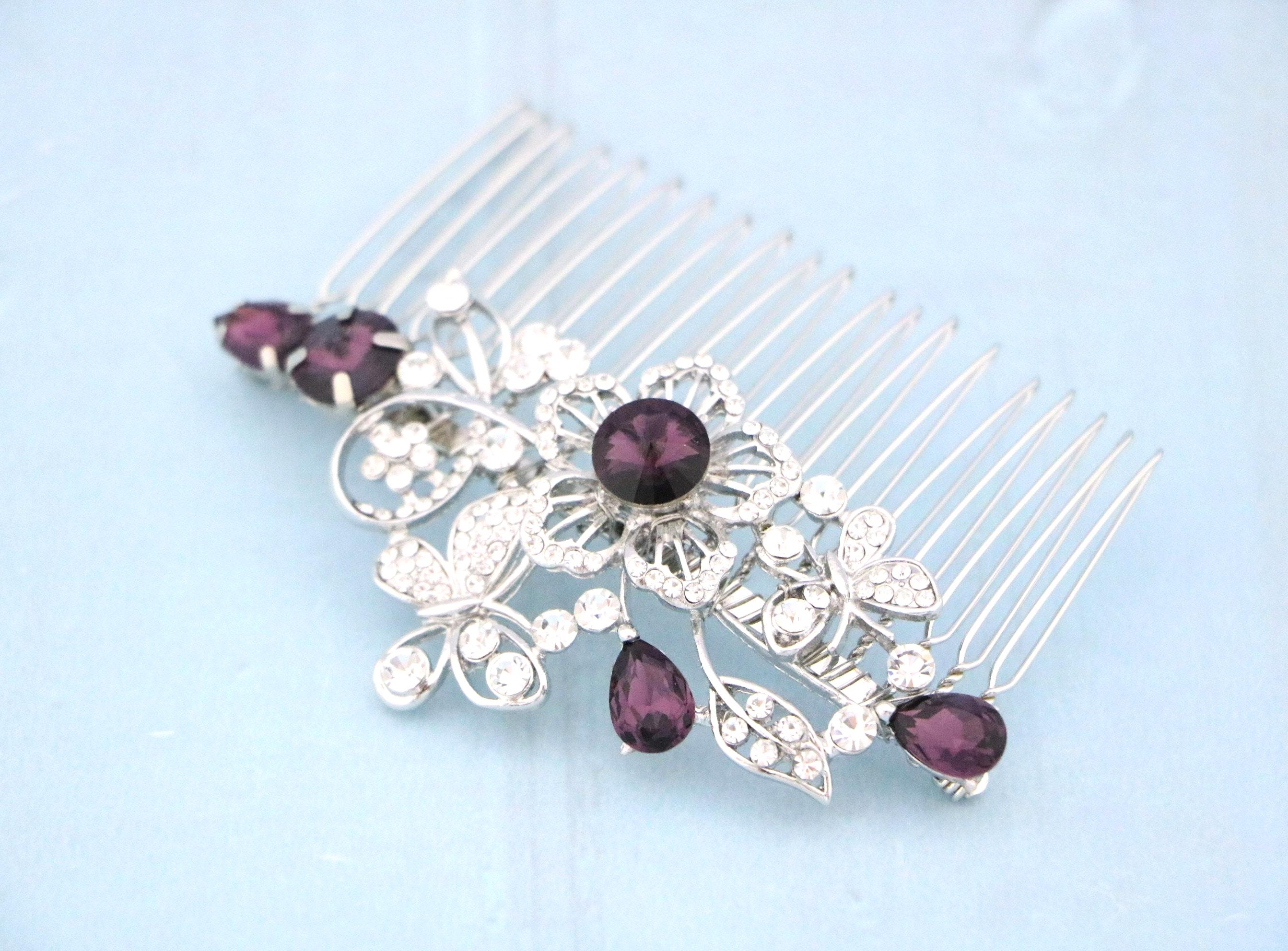 This beautiful Clear rhinestone and Amethyst crystal hair comb is a perfect compliment for the wedding party and can easily fit into any hair style. The Rhinestone part measured approximately 3.5 X 1.75 inches.