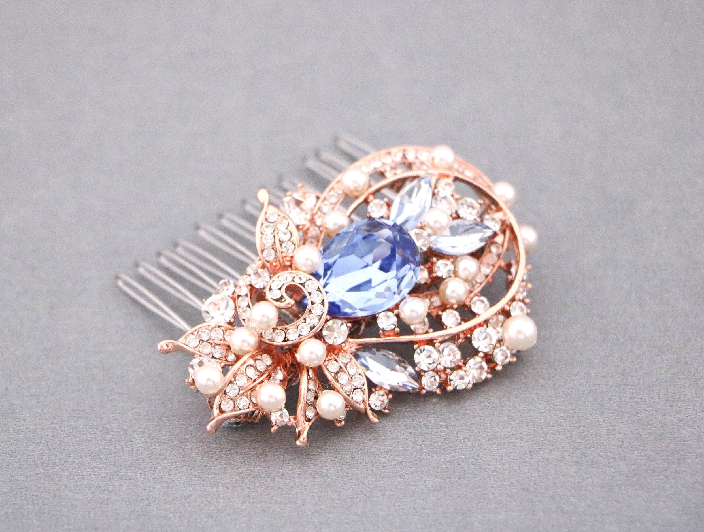 This beautiful Clear rhinestone and Sapphire Crystal Pearl hair comb is a perfect compliment for the wedding party and can easily fit into any hair style. The Rhinestone part measured approximately 2.75 X 1.75 inches.