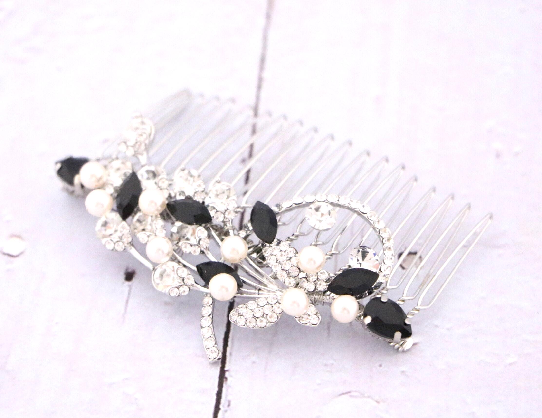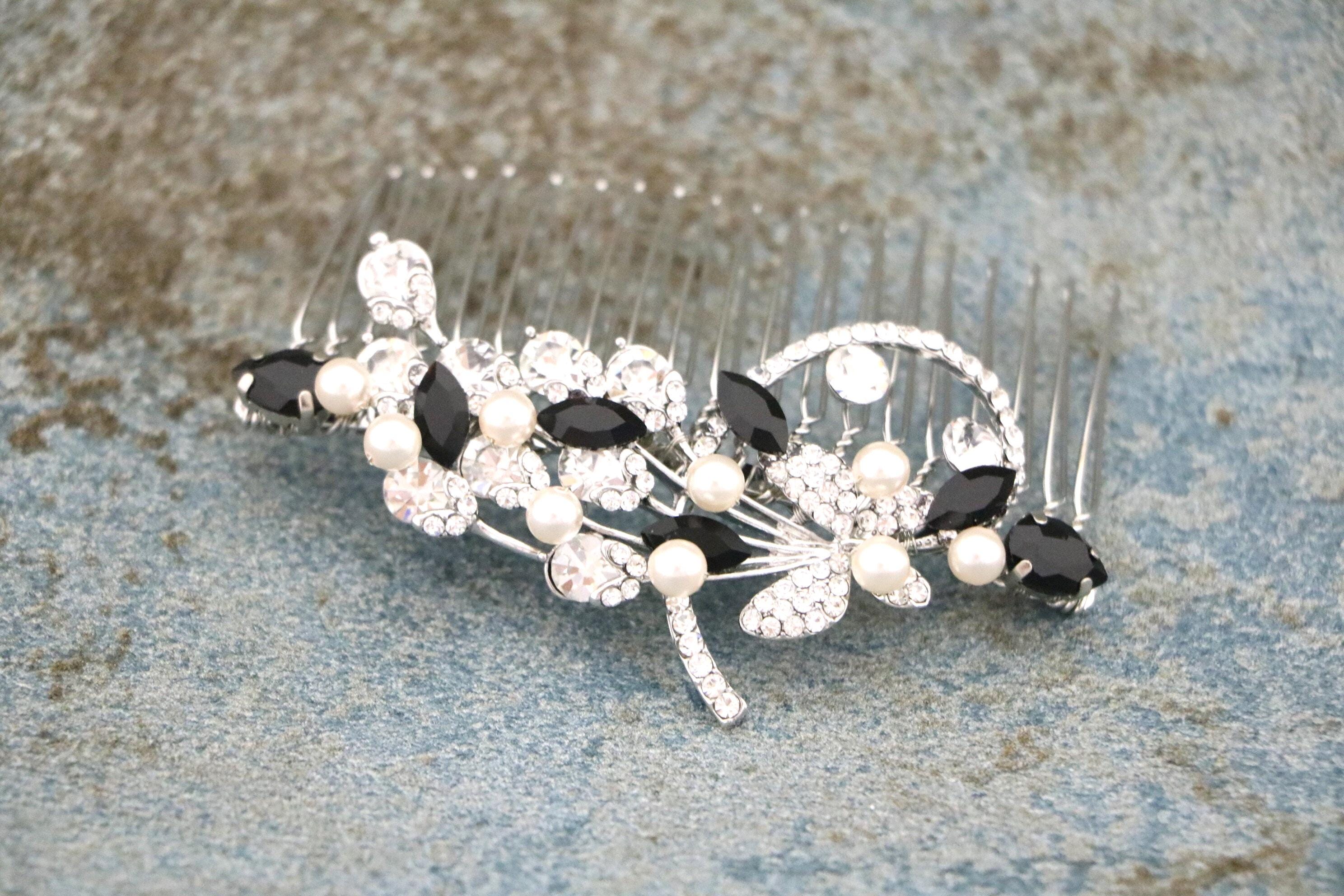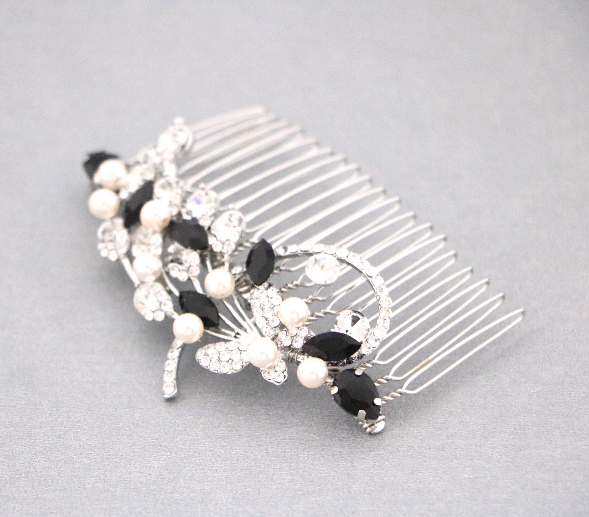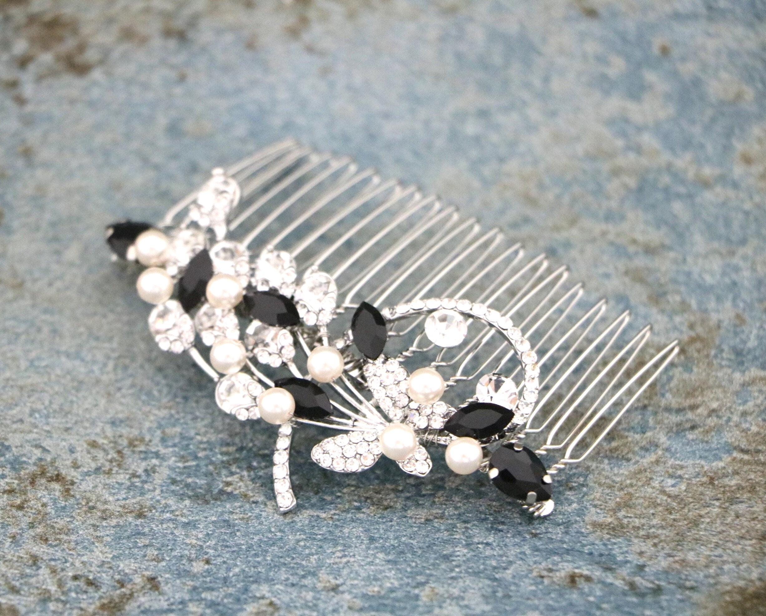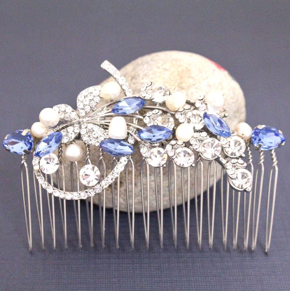 This beautiful Clear rhinestone and Sapphire Crystal hair comb is a perfect compliment for the wedding party and can easily fit into any hair style. The Rhinestone part measured approximately 3.5 X 1.25 inches. and the comb is approximately 3 inches wide.
