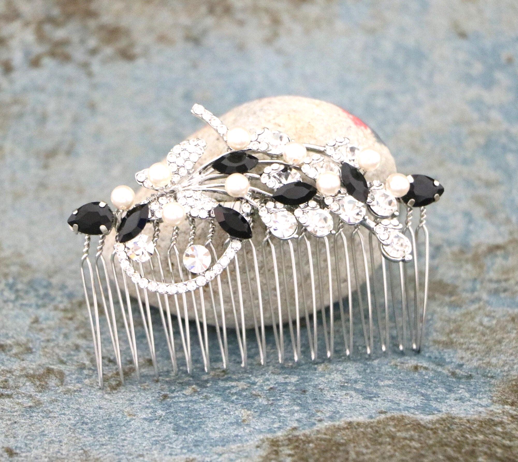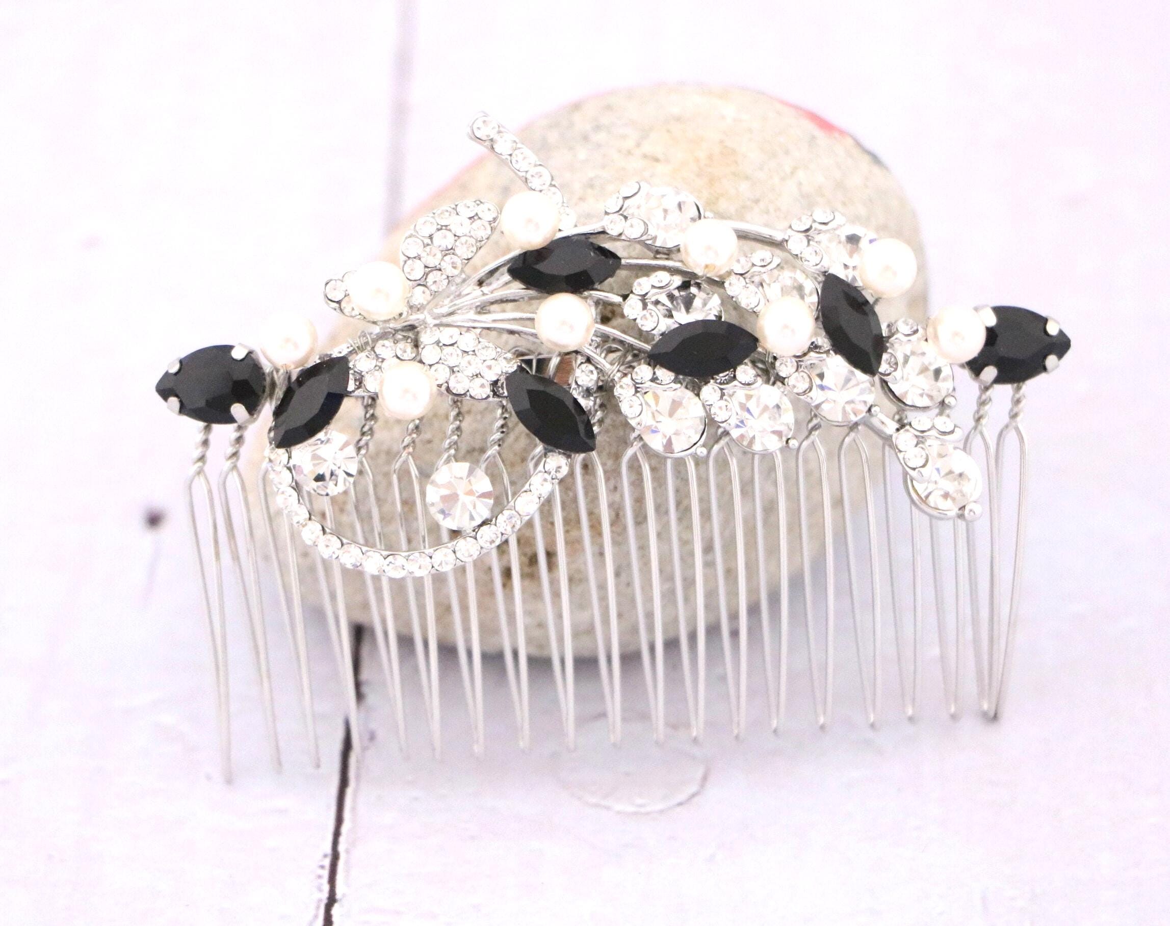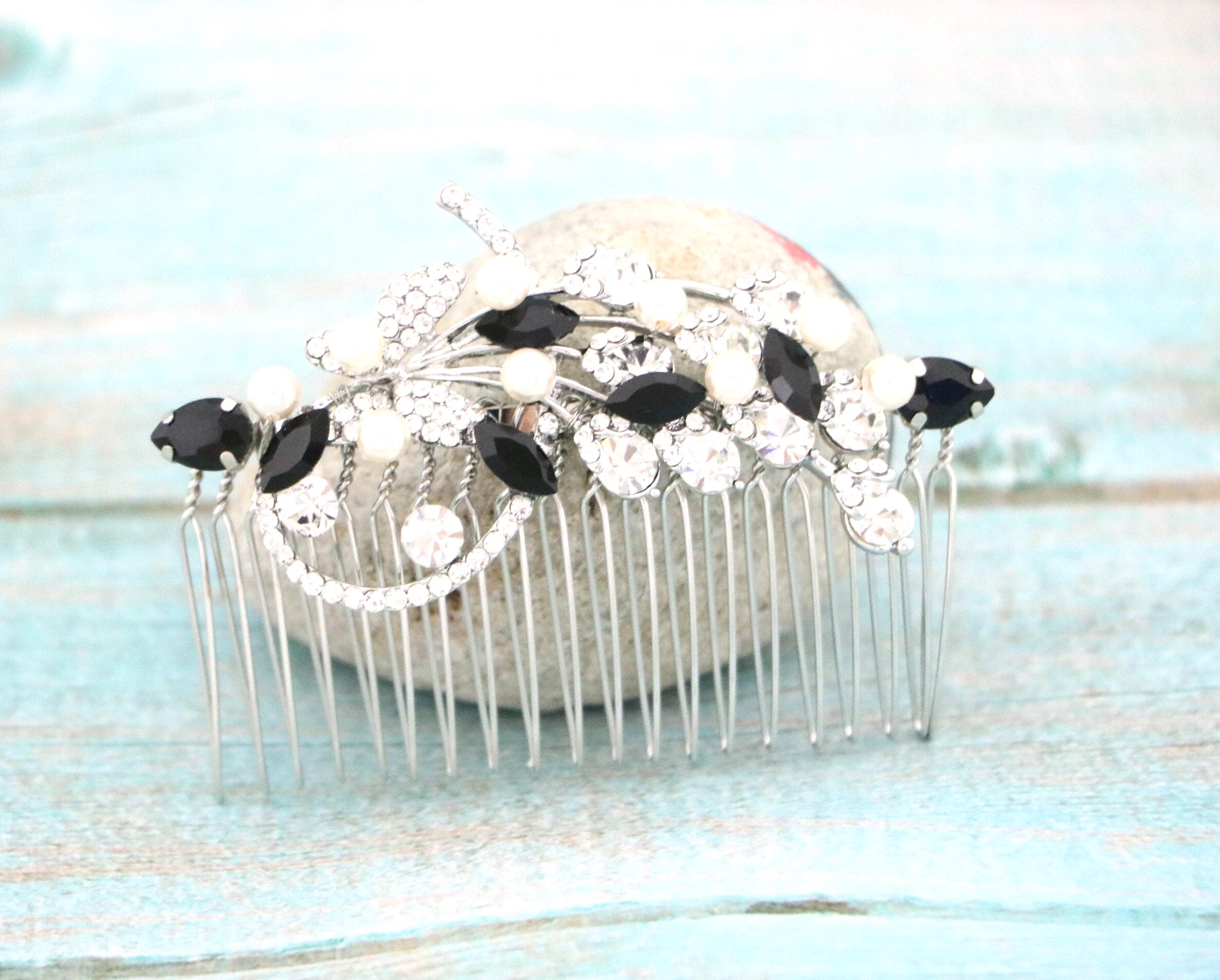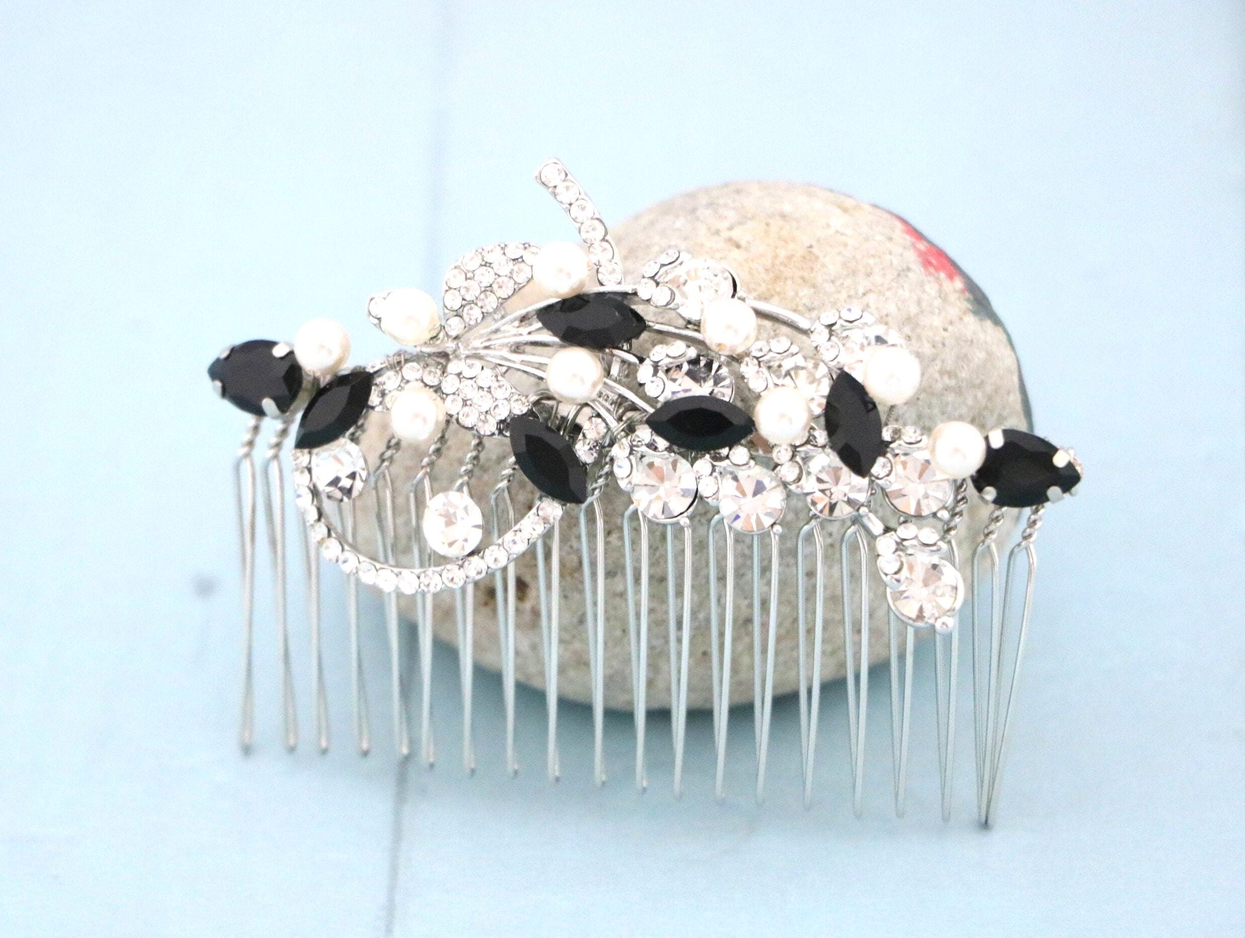 This beautiful Clear rhinestone and Sapphire Crystal hair comb is a perfect compliment for the wedding party and can easily fit into any hair style. The Rhinestone part measured approximately 3.5 X 1.25 inches. and the comb is approximately 3 inches wide.