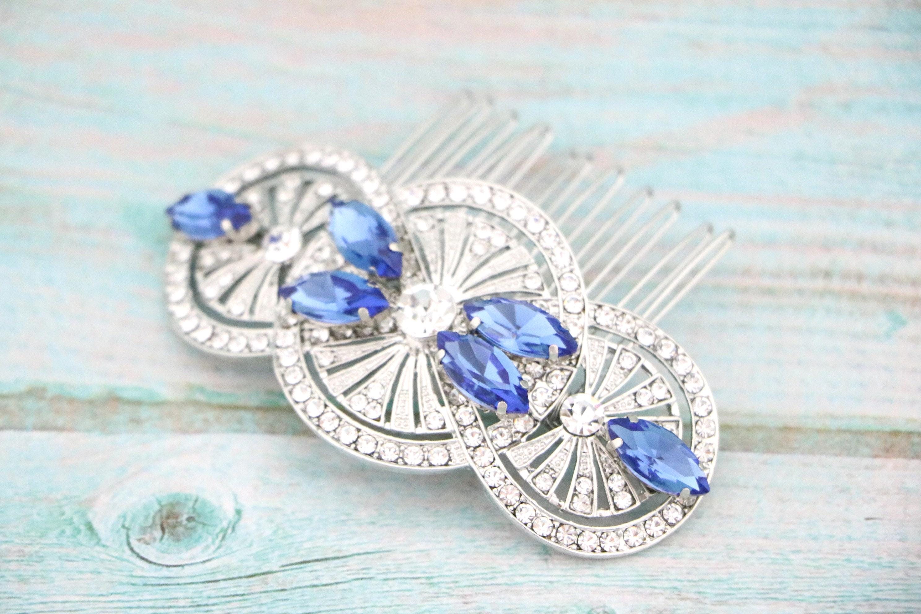 This beautiful Clear rhinestone and Montana Crystal hair comb is a perfect compliment for the wedding party and can easily fit into any hair style. The Rhinestone part measured approximately 3.25 X 1.25 inches.
