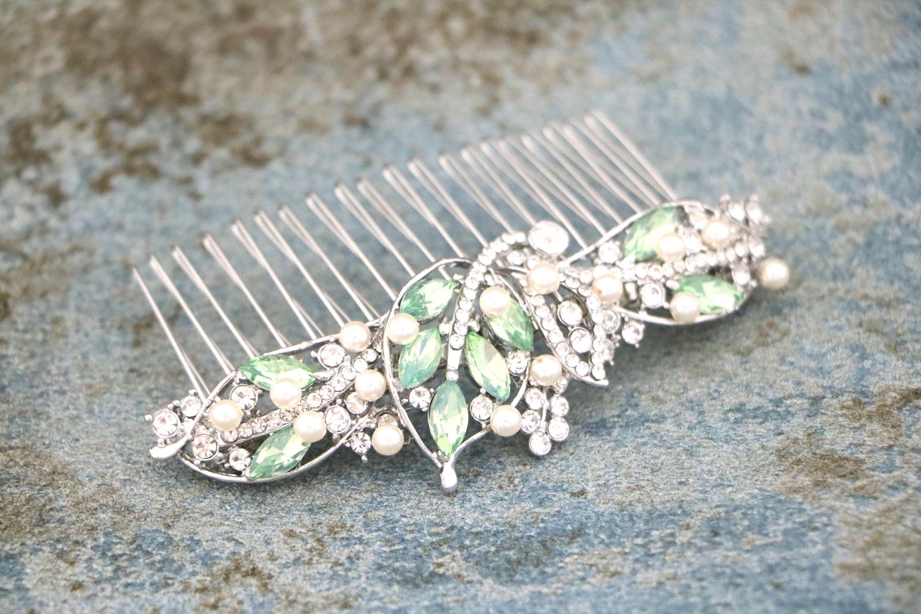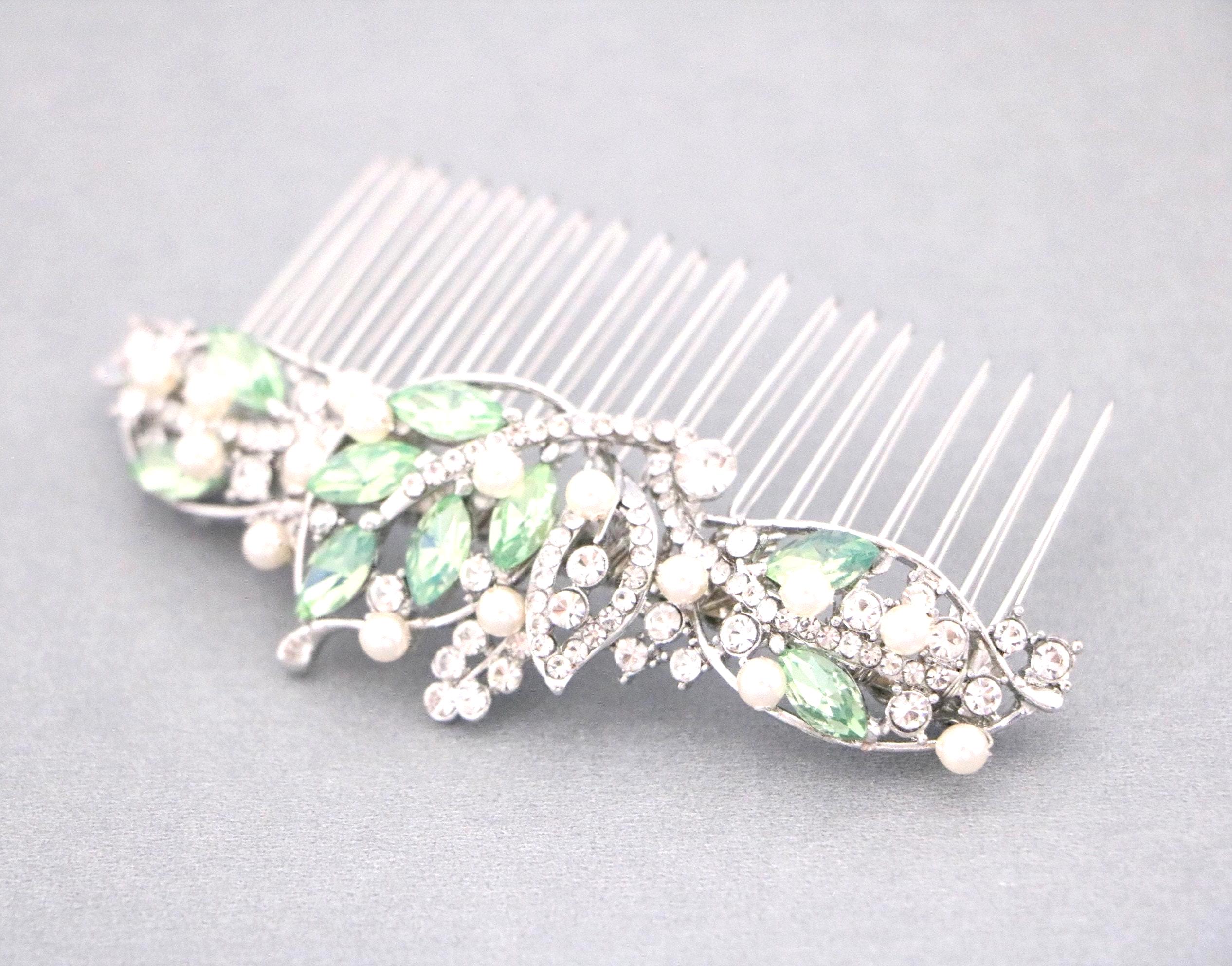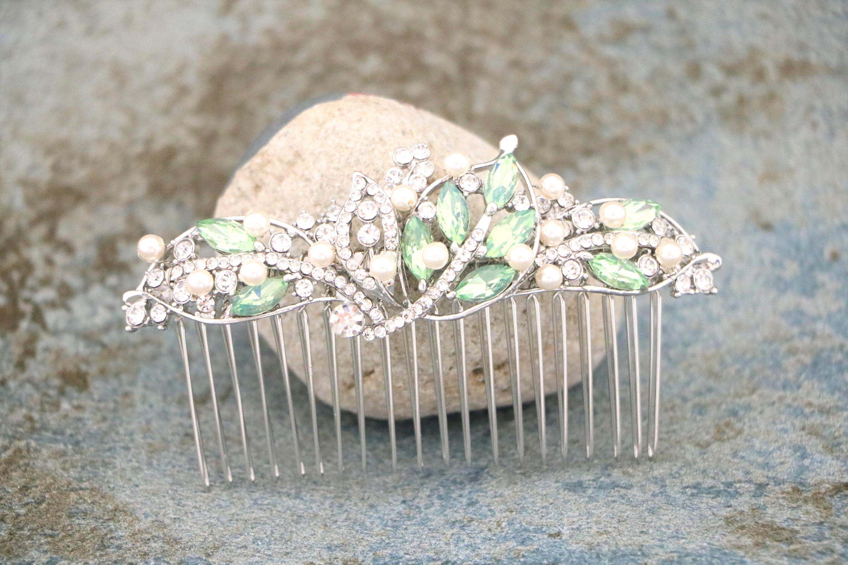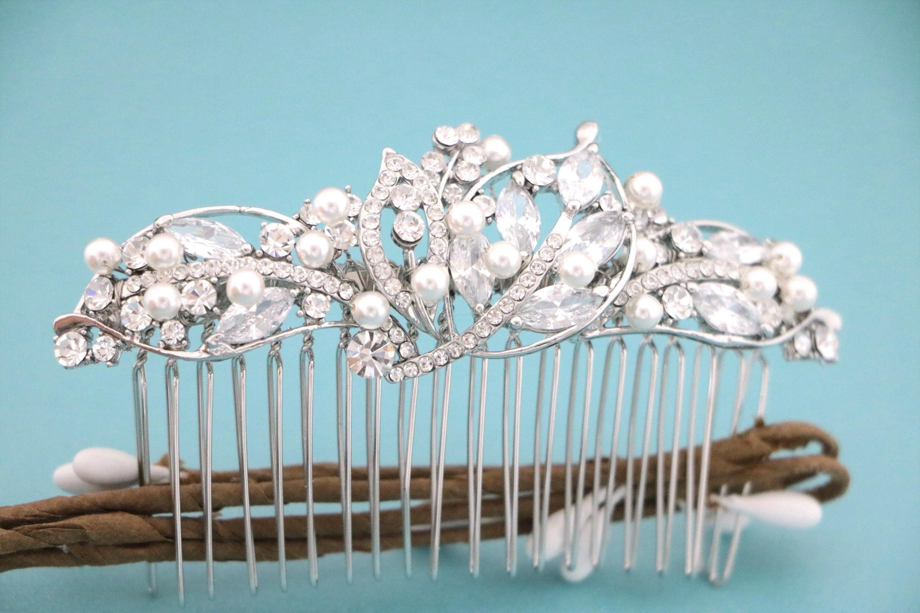This beautiful Vintage Silver tone Clear rhinestone and Pacific opal Crystal Pearl hair comb is a perfect compliment for the wedding party and can easily fit into any hairstyle. The Rhinestone part measured approximately 4 X 1.5 inches. and the comb is approximately 3 inches wide.