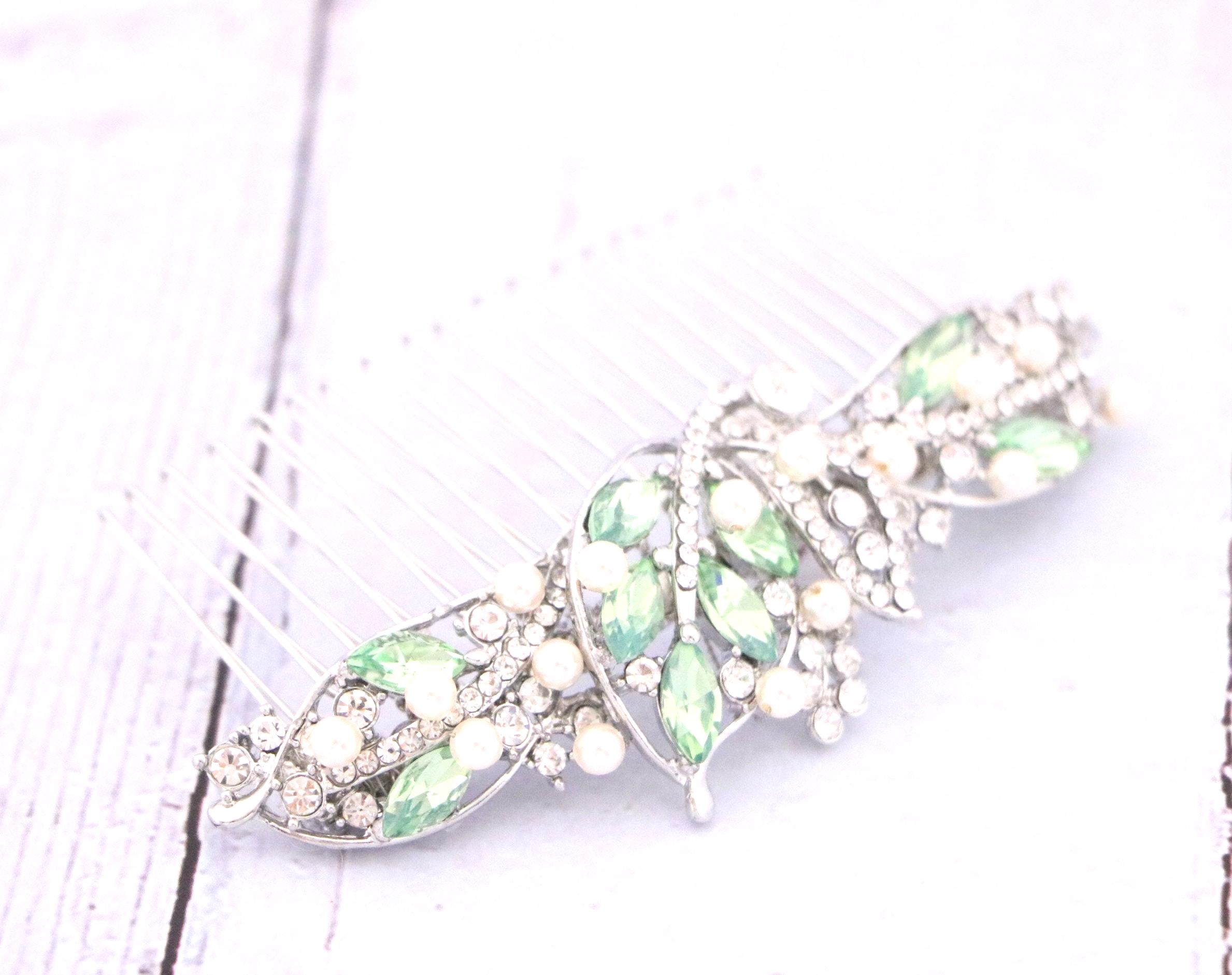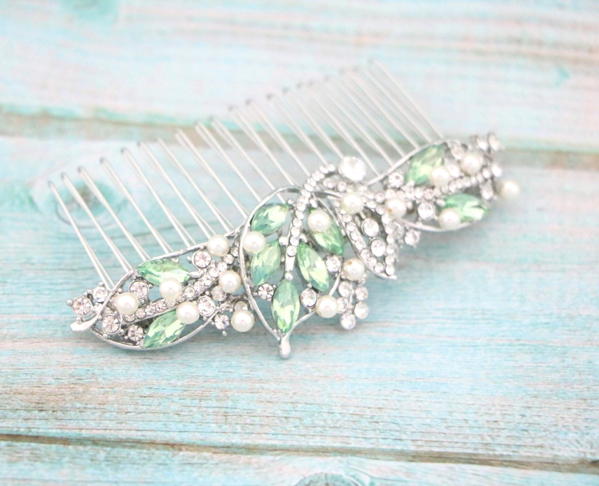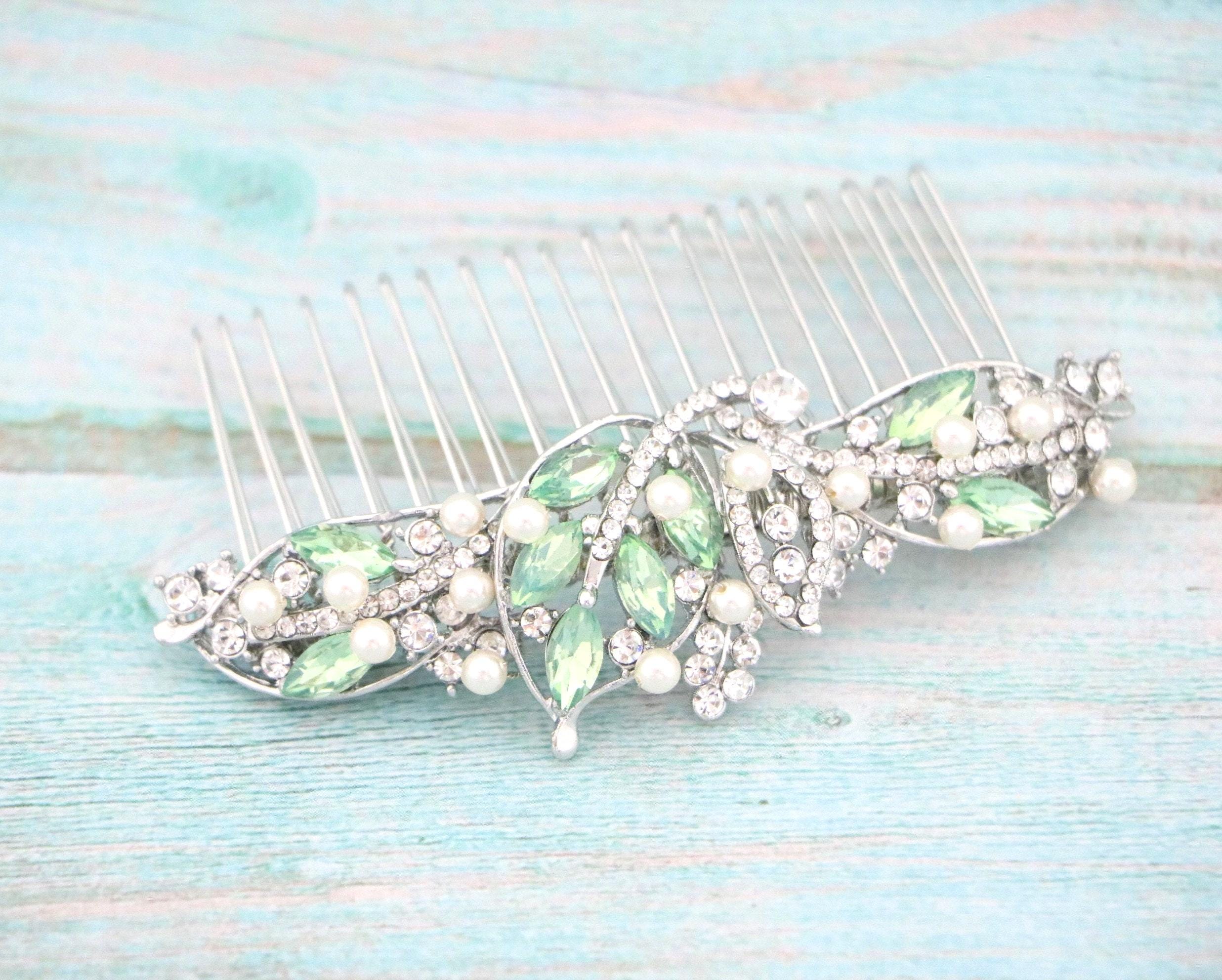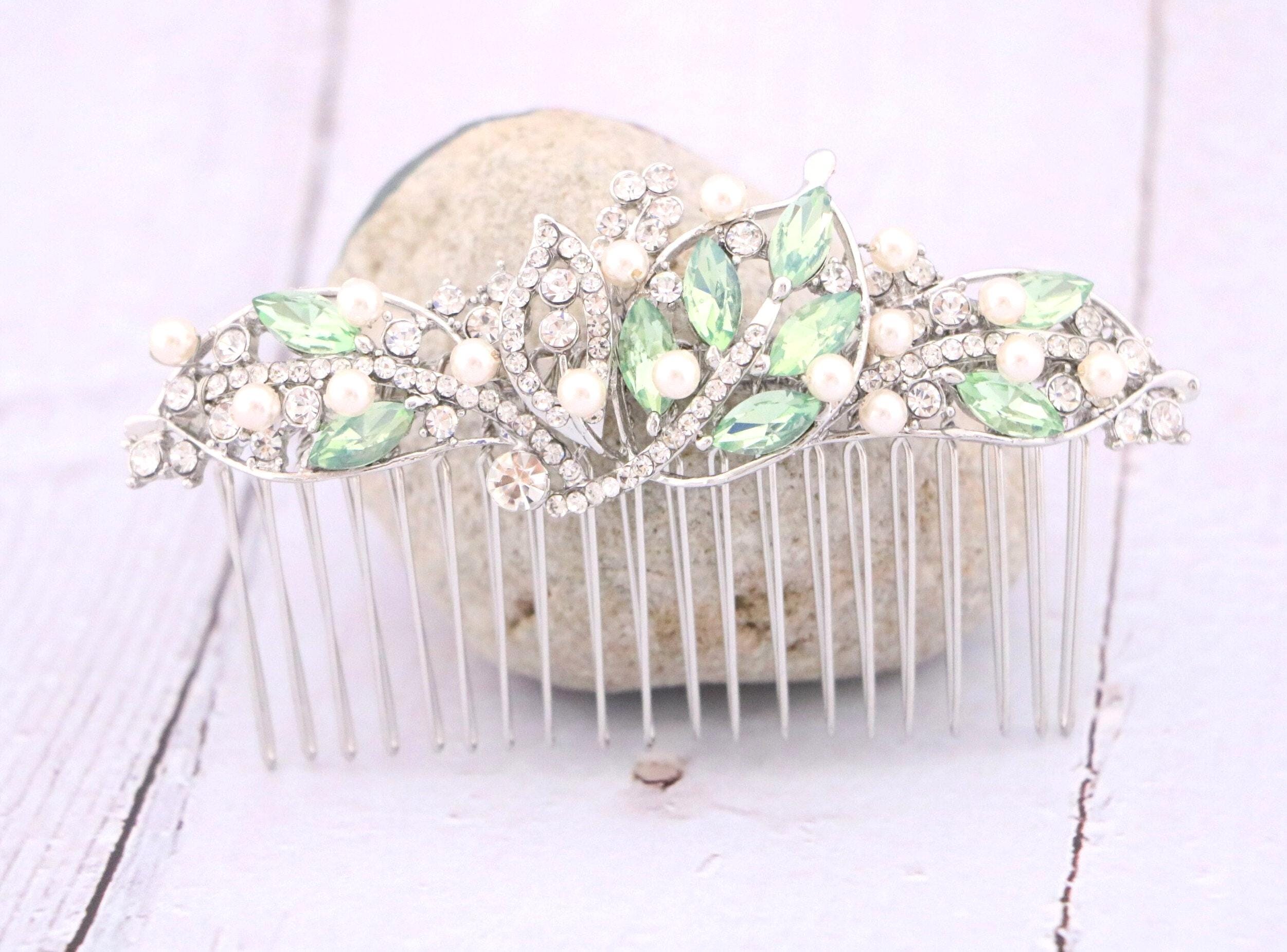 This beautiful Vintage Silver tone Clear rhinestone and Pacific opal Crystal Pearl hair comb is a perfect compliment for the wedding party and can easily fit into any hairstyle. The Rhinestone part measured approximately 4 X 1.5 inches. and the comb is approximately 3 inches wide.