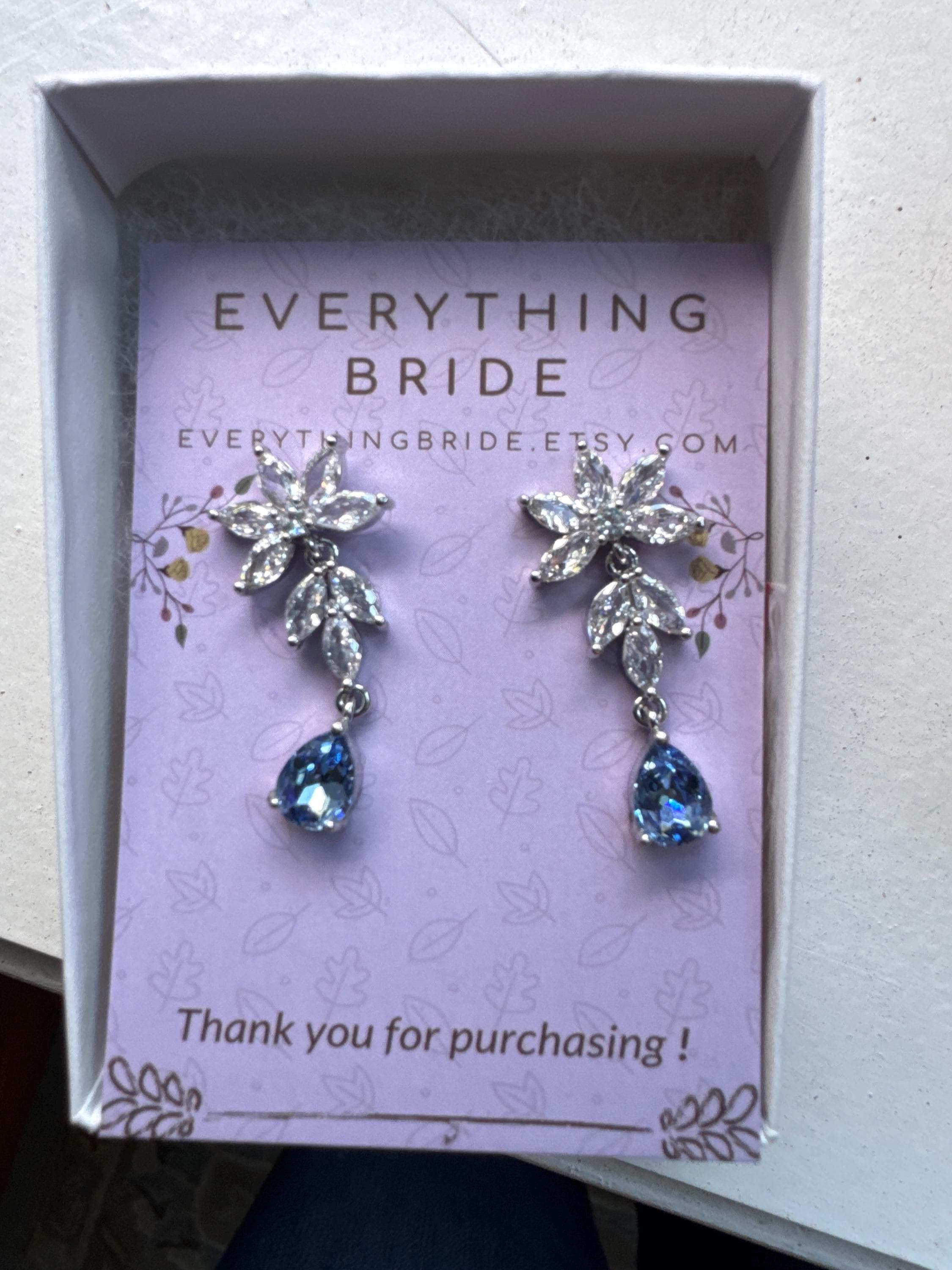 Blue Sapphire Wedding Crystal Earrings Bridal Cubic Zirconia Silver Drop Earrings Wedding Teardrop Rhodium Earrings Sapphire Bridal Earrings