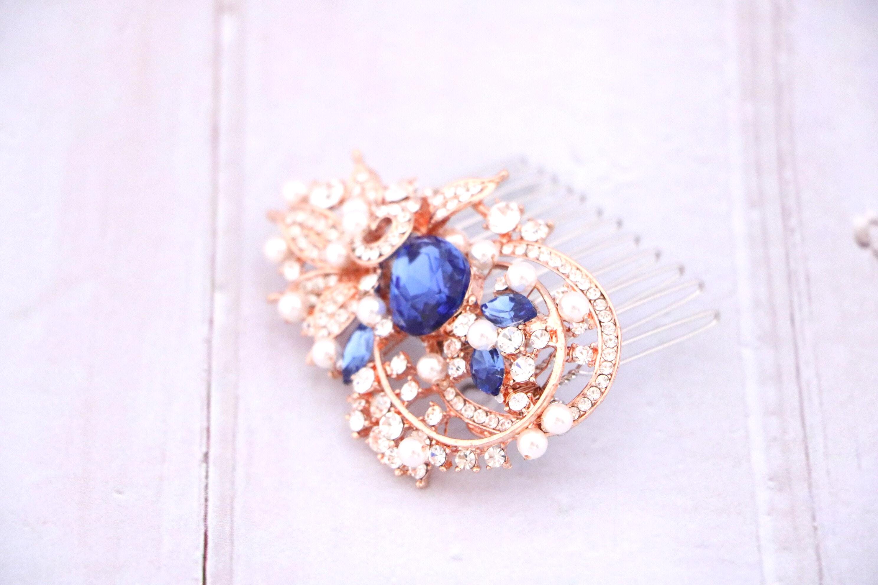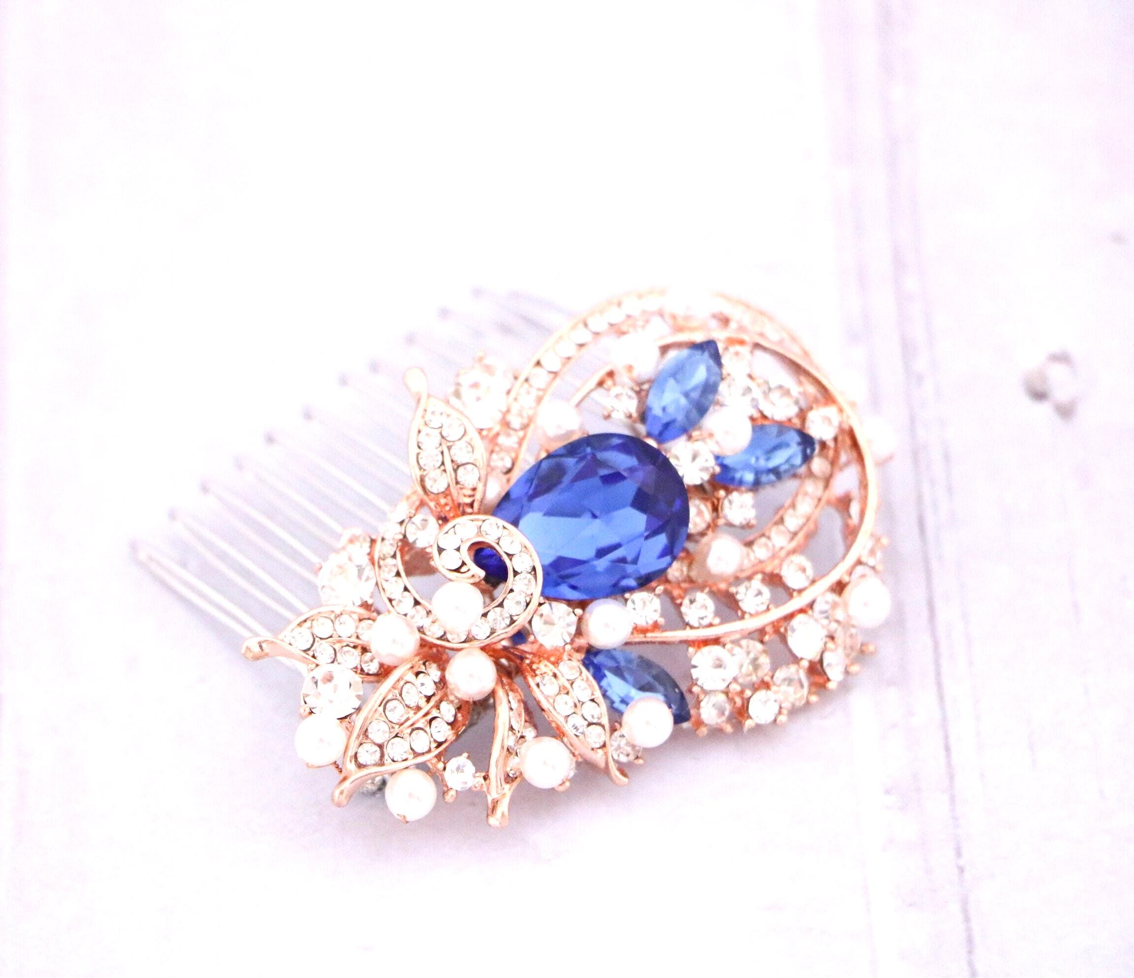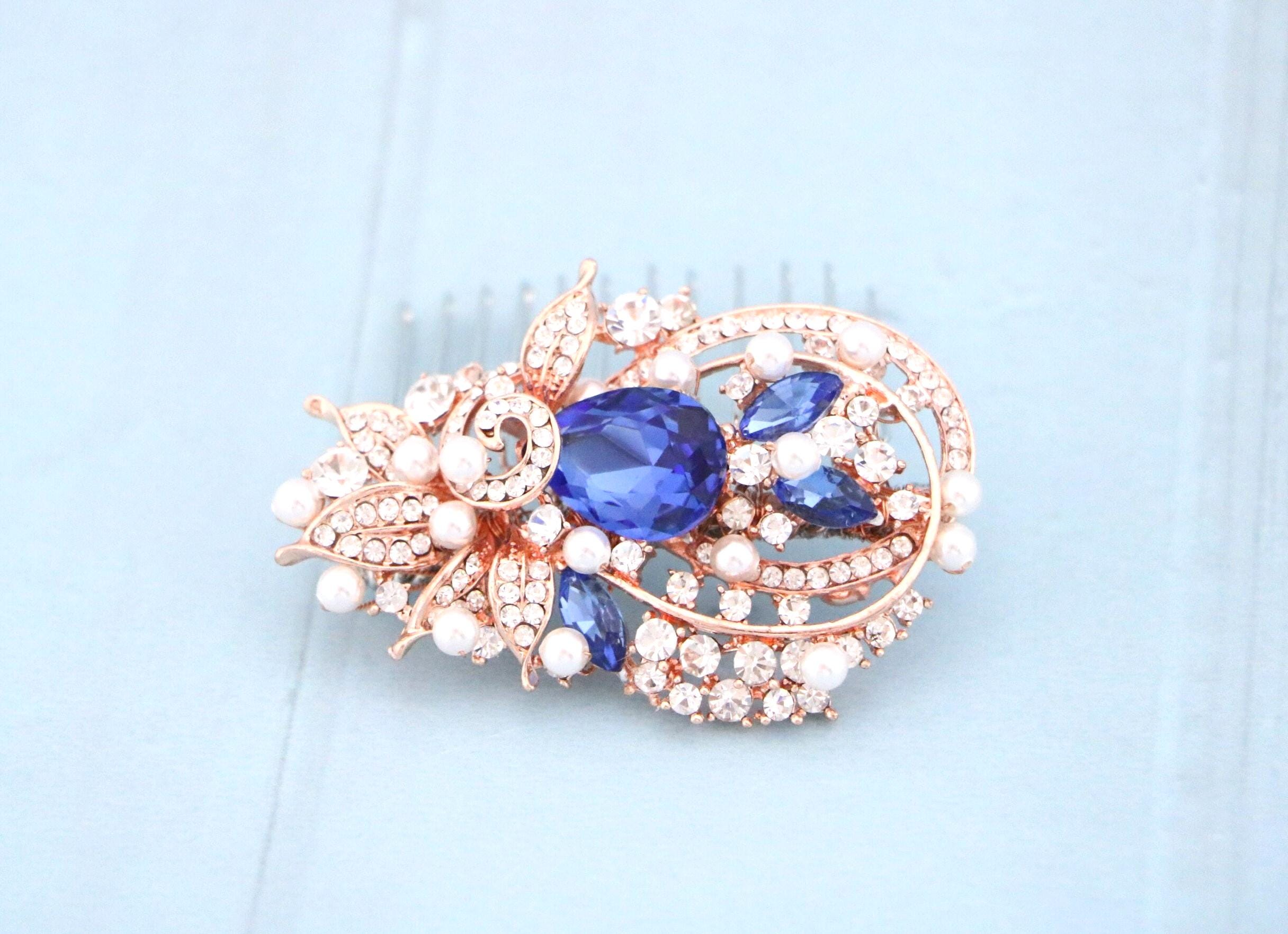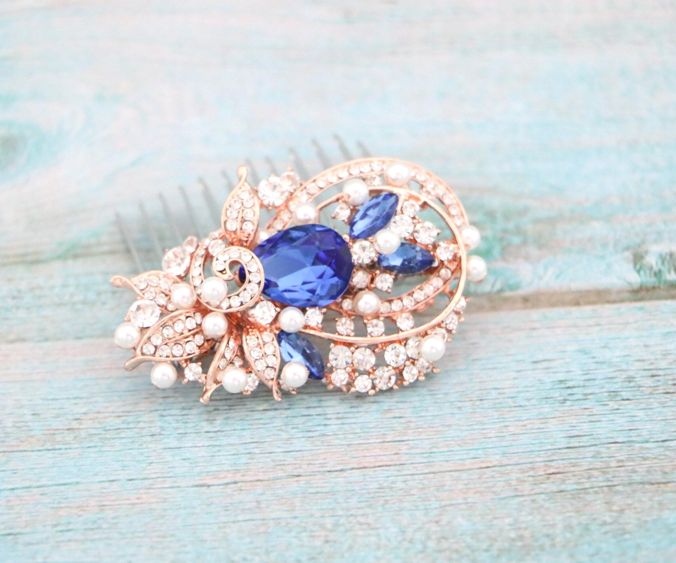 This beautiful Clear rhinestone and Sapphire Crystal Pearl hair comb is a perfect compliment for the wedding party and can easily fit into any hair style.