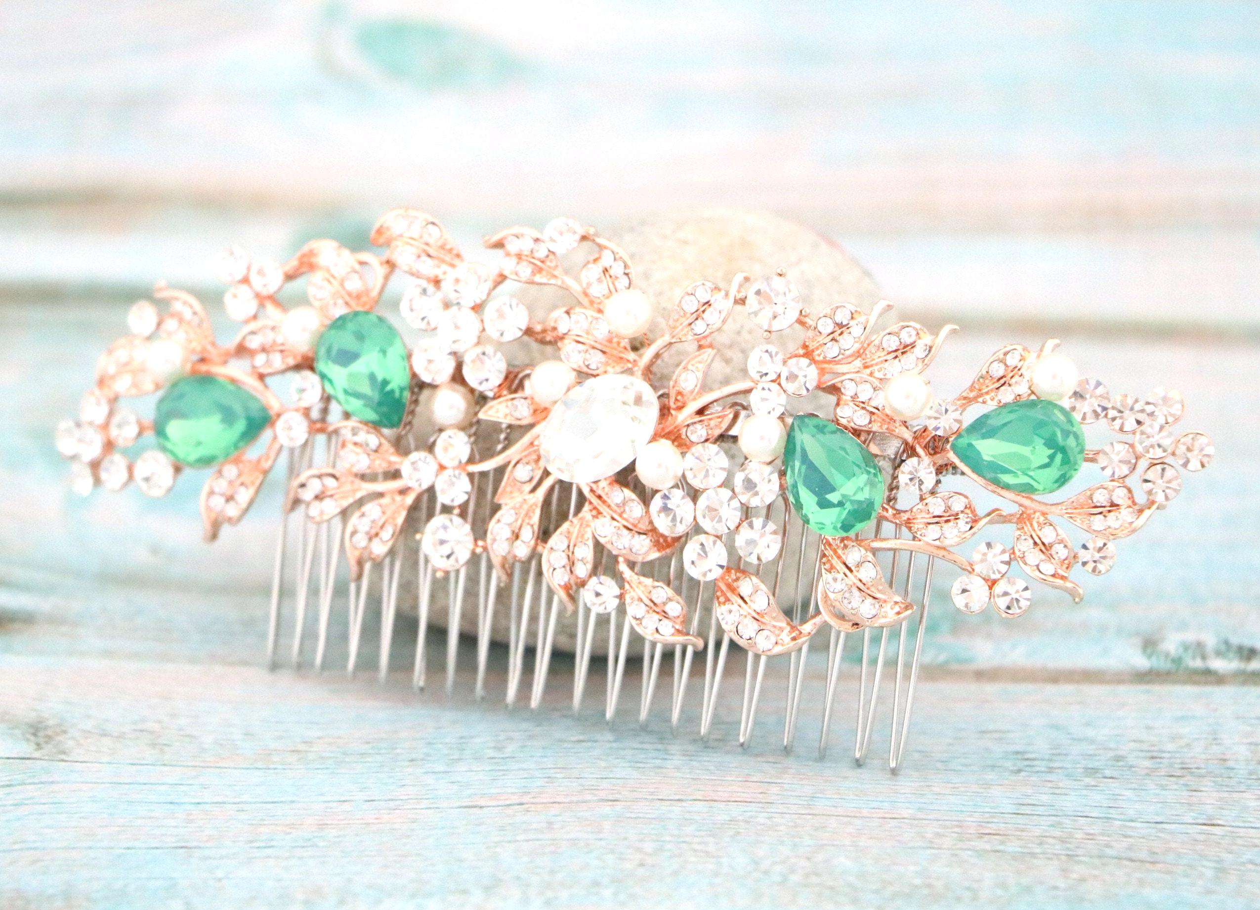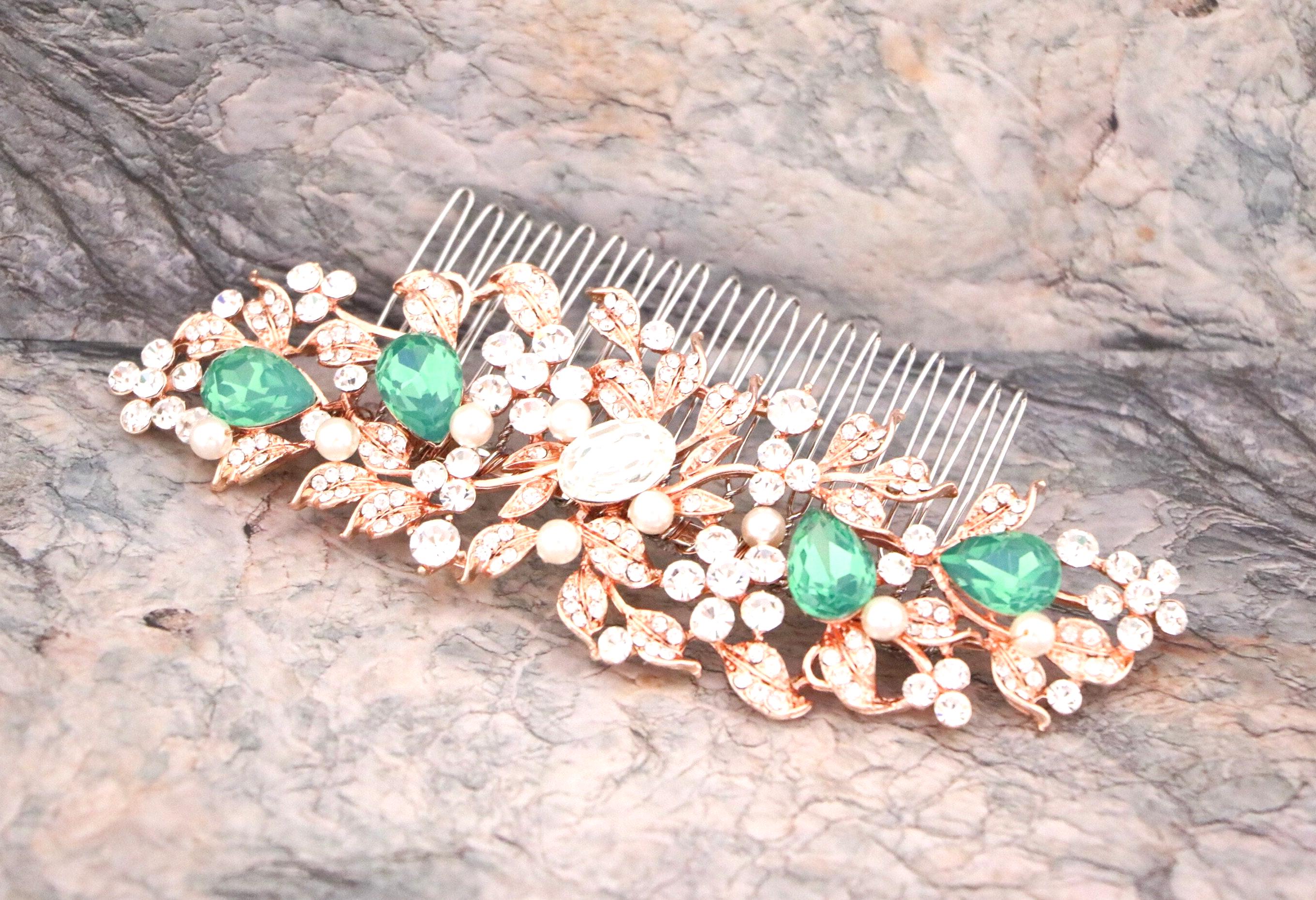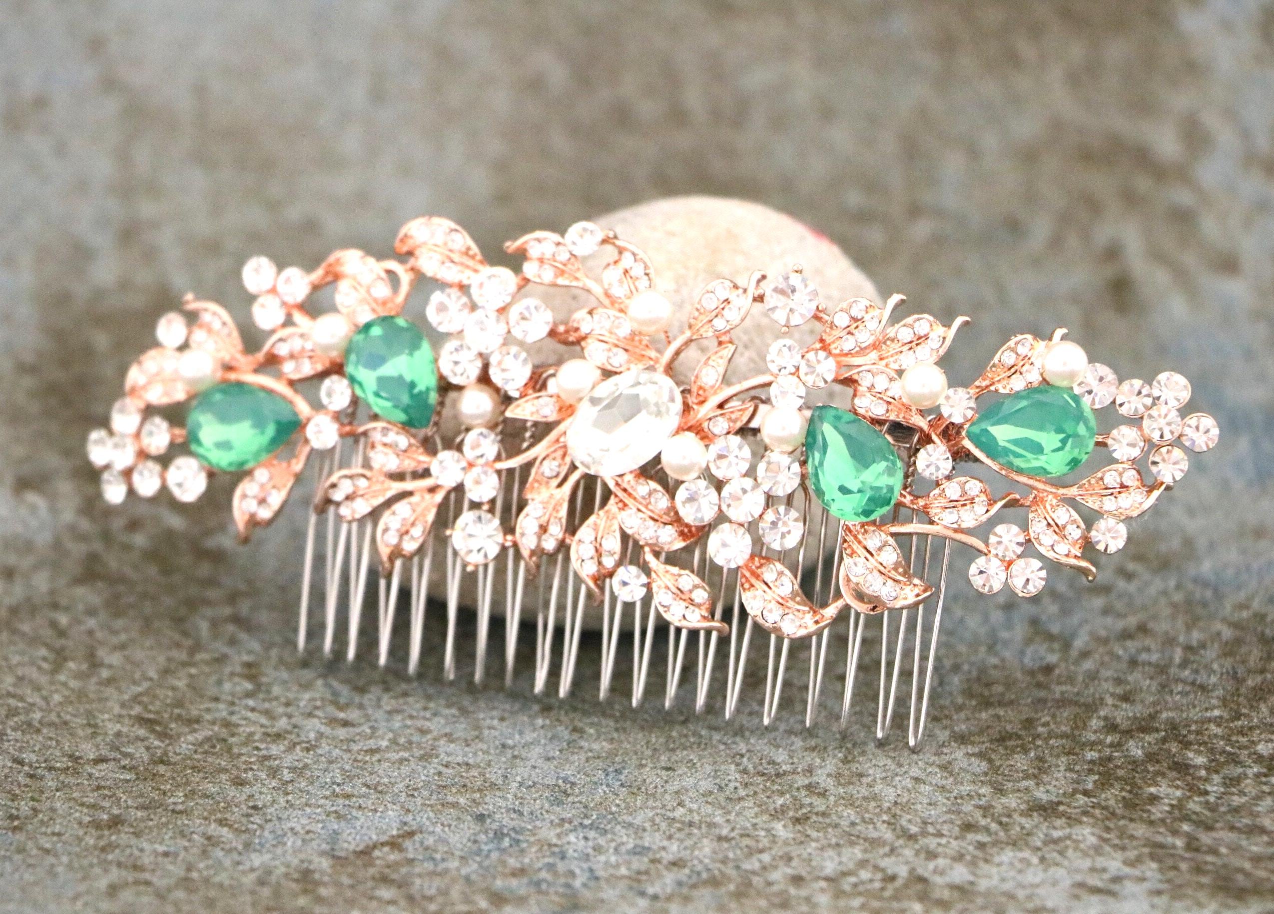 Bridal Hair Comb, Emerald Green Bridal Hair Comb, Dark Green Hair Comb, Bridal Hair Accessories, Emerald Green Rose Gold Hair Comb