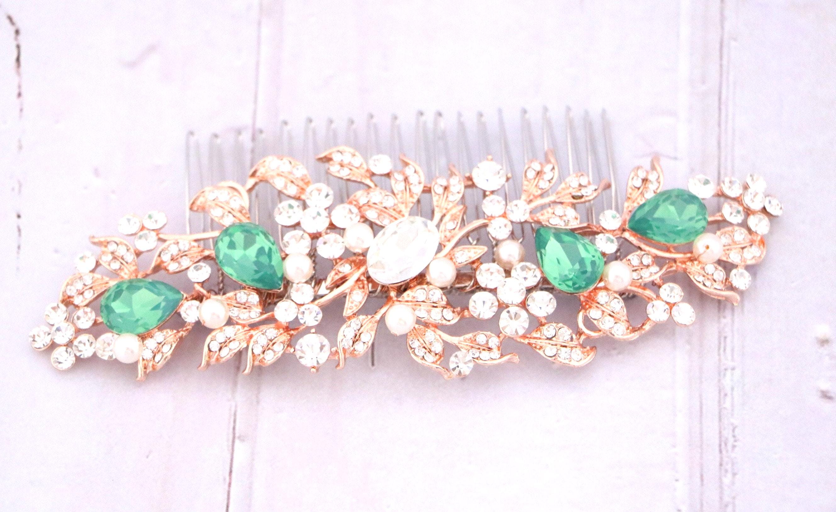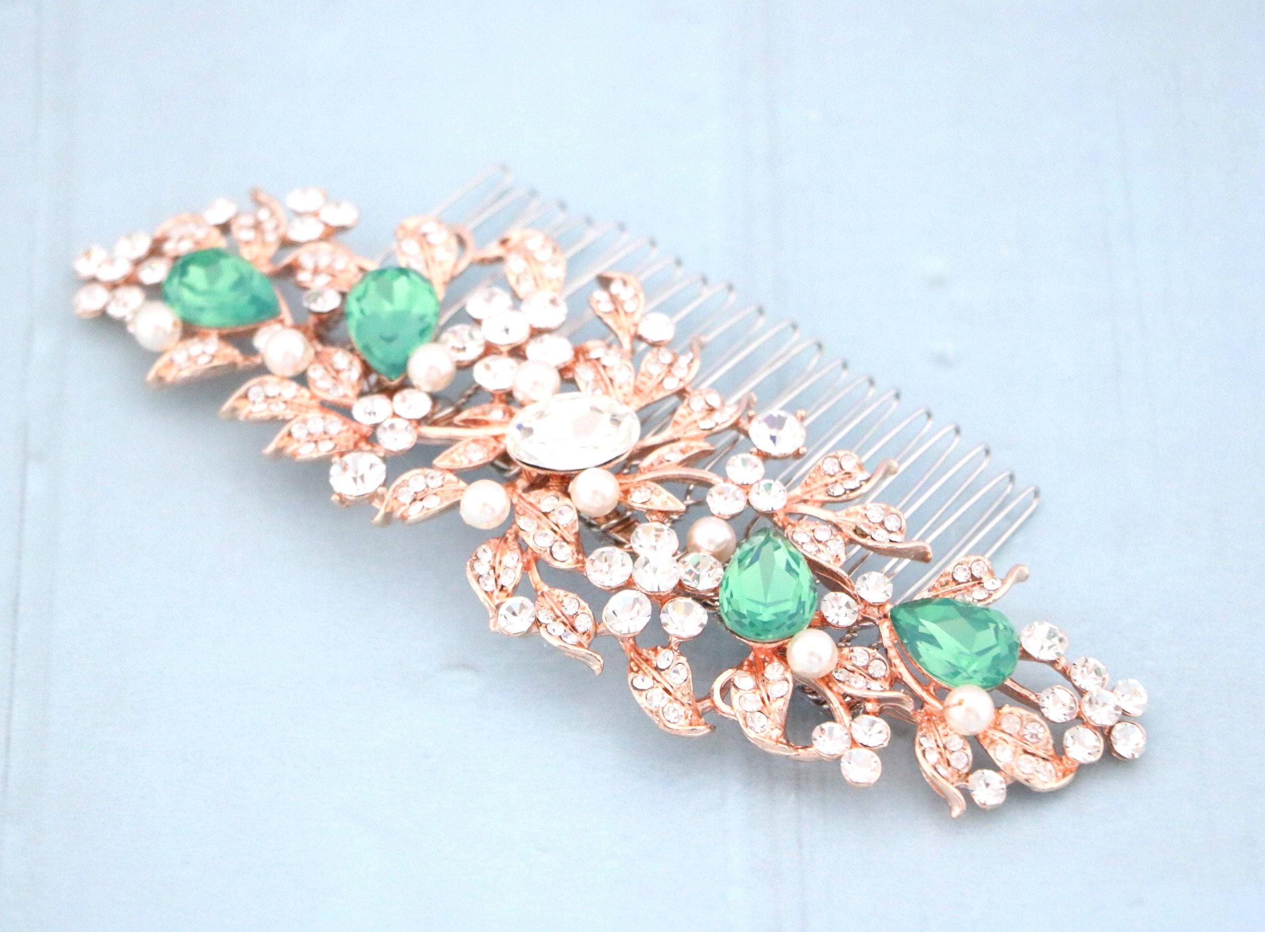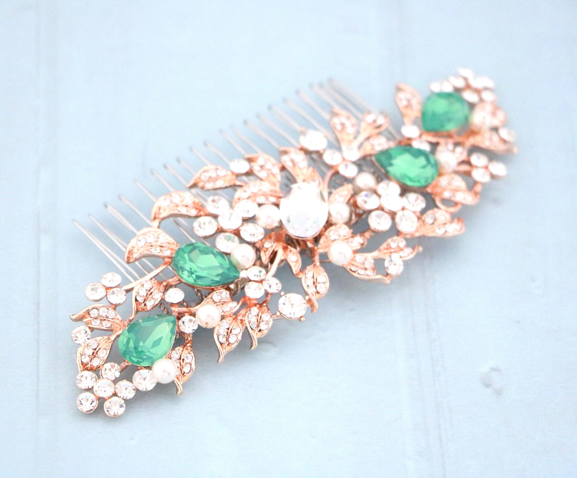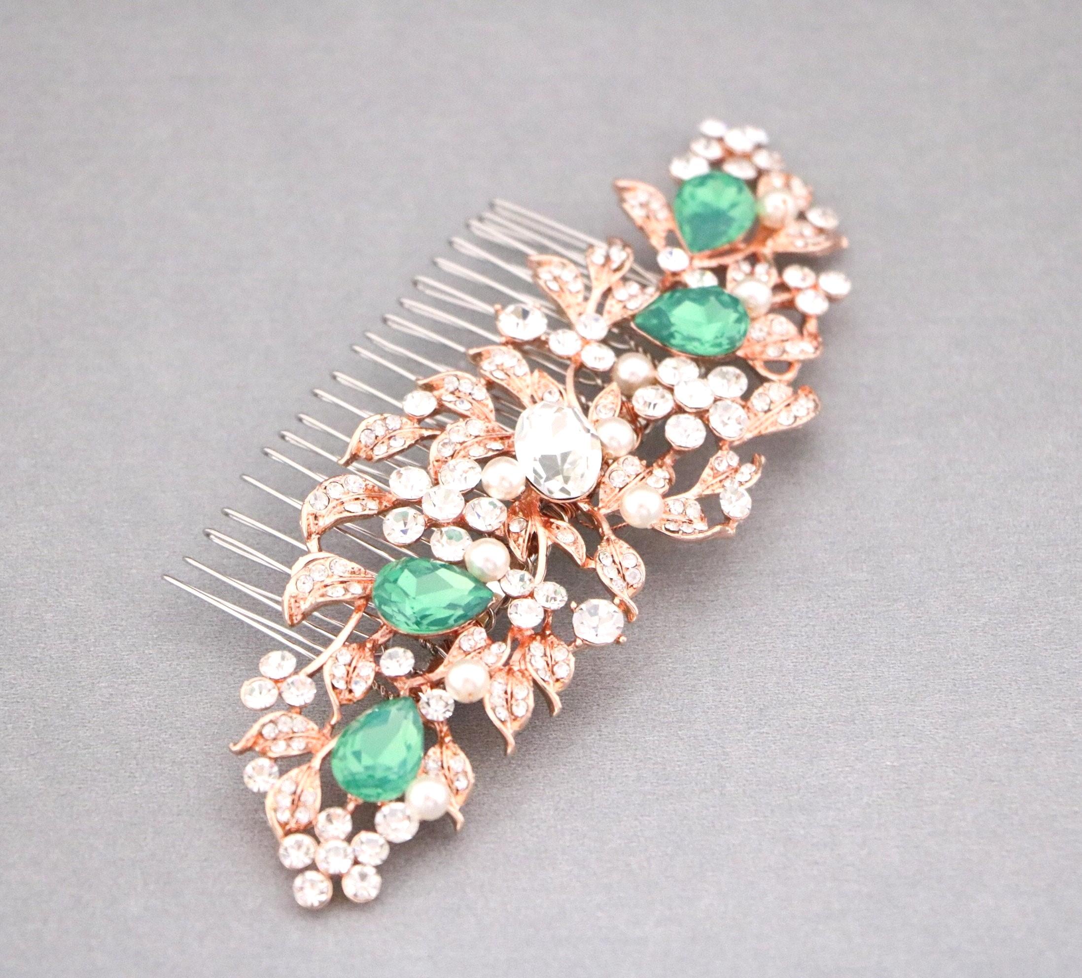 Bridal Hair Comb, Emerald Green Bridal Hair Comb, Dark Green Hair Comb, Bridal Hair Accessories, Emerald Green Rose Gold Hair Comb