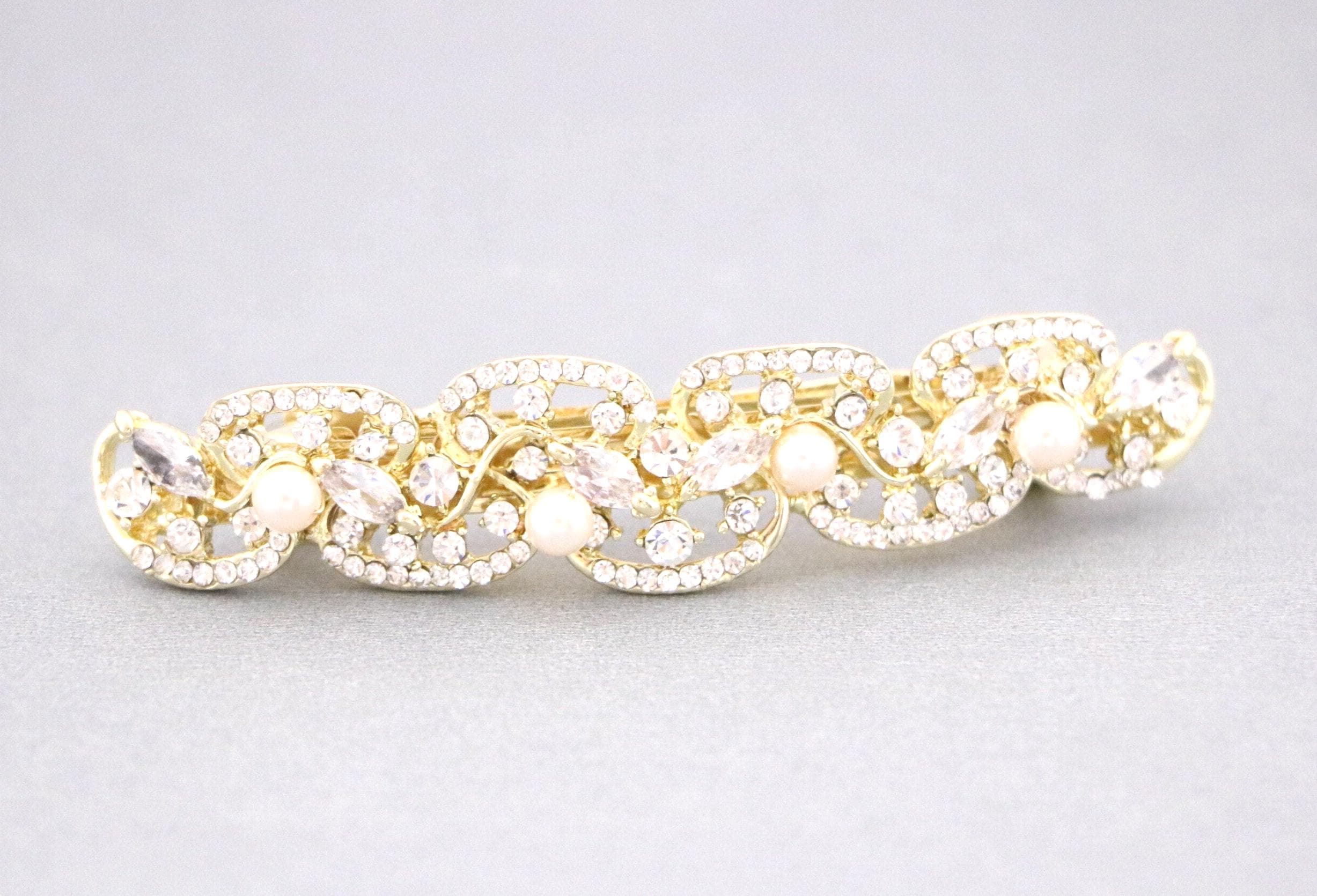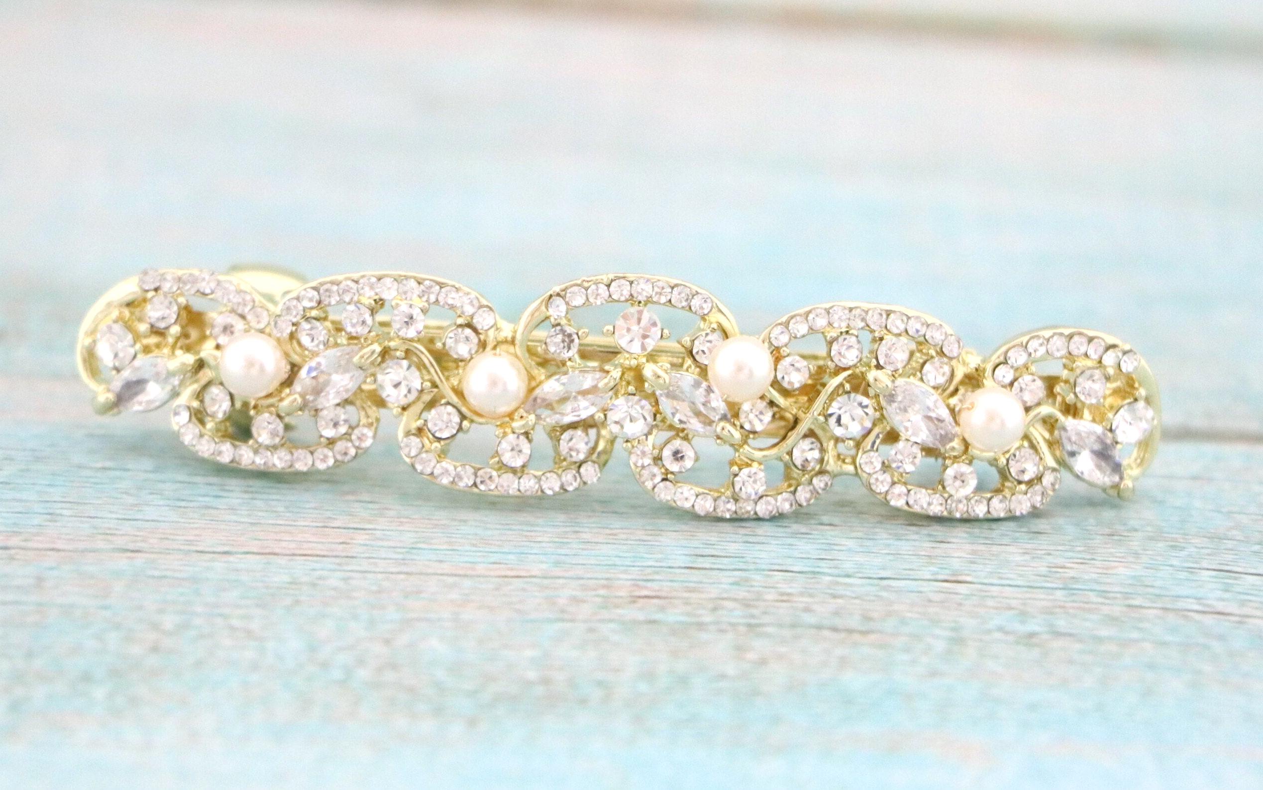 Crystal Rhinestone Barrette Gold, Bridal Comb Crystal, Wedding Hair Clip, Hair Barrette, Wedding Accessory, Gold Barrette Clip Vintage style Pearl drop Wedding earrings Gold Crystal earrings Bridal hair jewelry hair clip Barrette headpiece