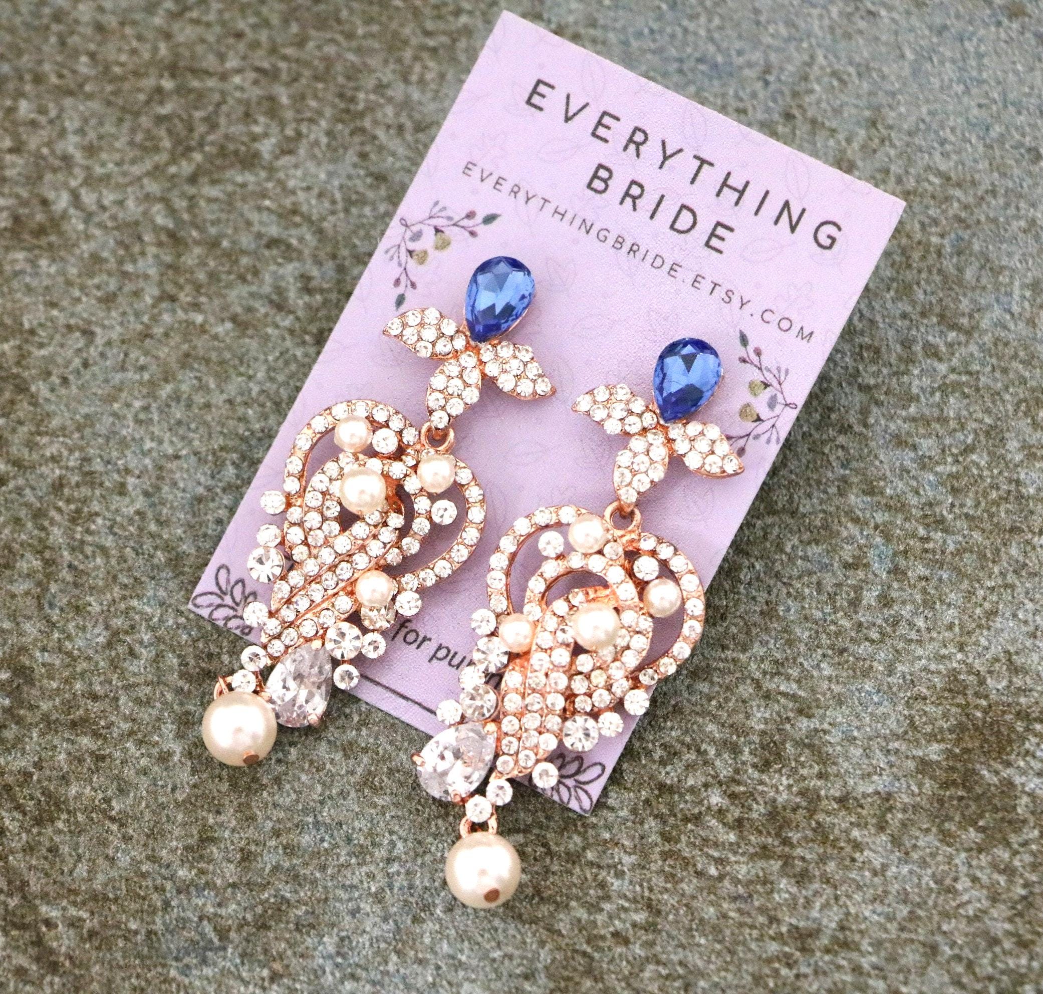 Blue Sapphire Wedding Crystal Earrings Bridal Cubic Zirconia Silver Drop Earrings Wedding Teardrop Rhodium Earrings Sapphire Bridal Earrings