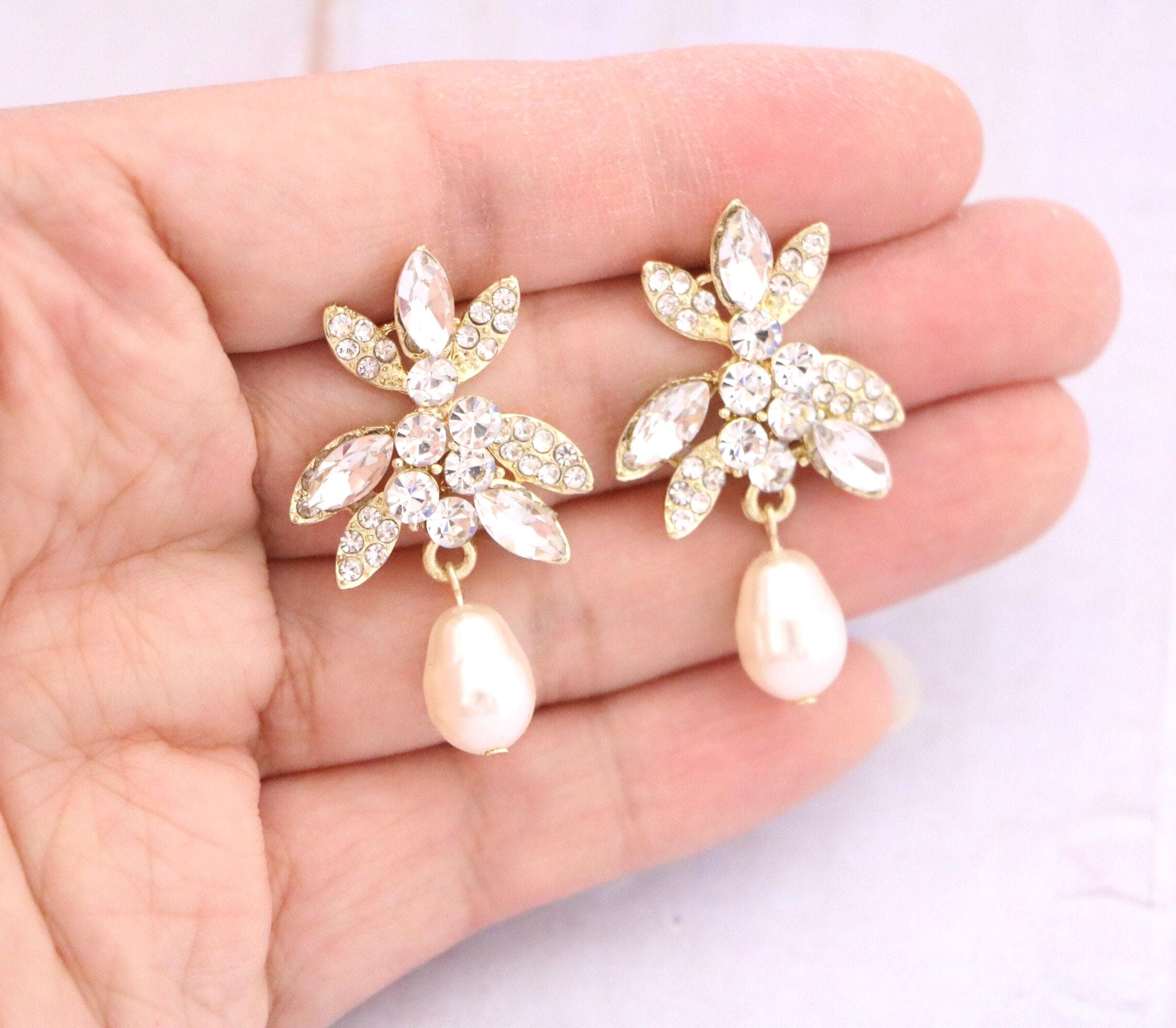 Crystal Bridal Earrings Leaf Crystal Earrings Bridal Earrings Crystal Wedding Earrings Rose gold Bridal Jewelry Set Bridesmaids Earrings Gold Pearl drop earrings