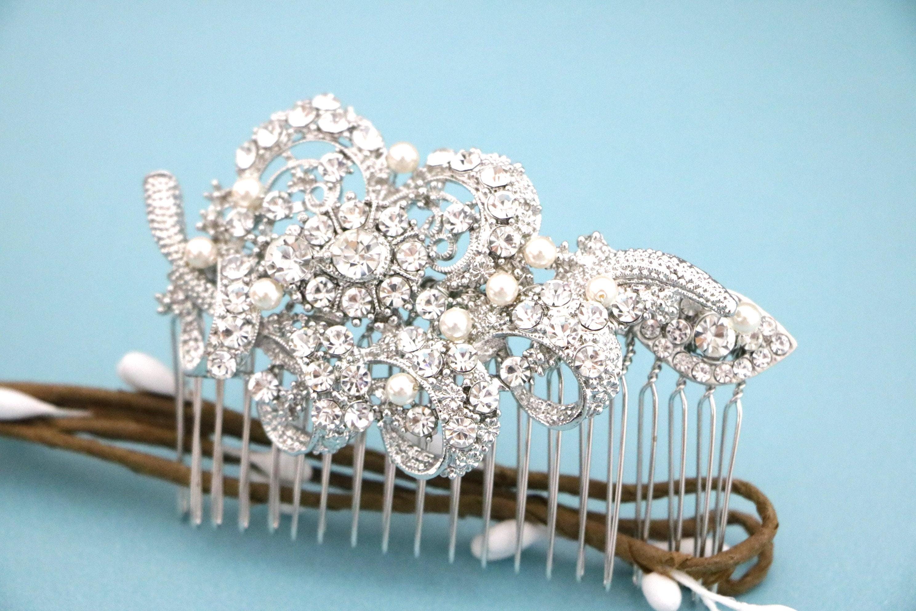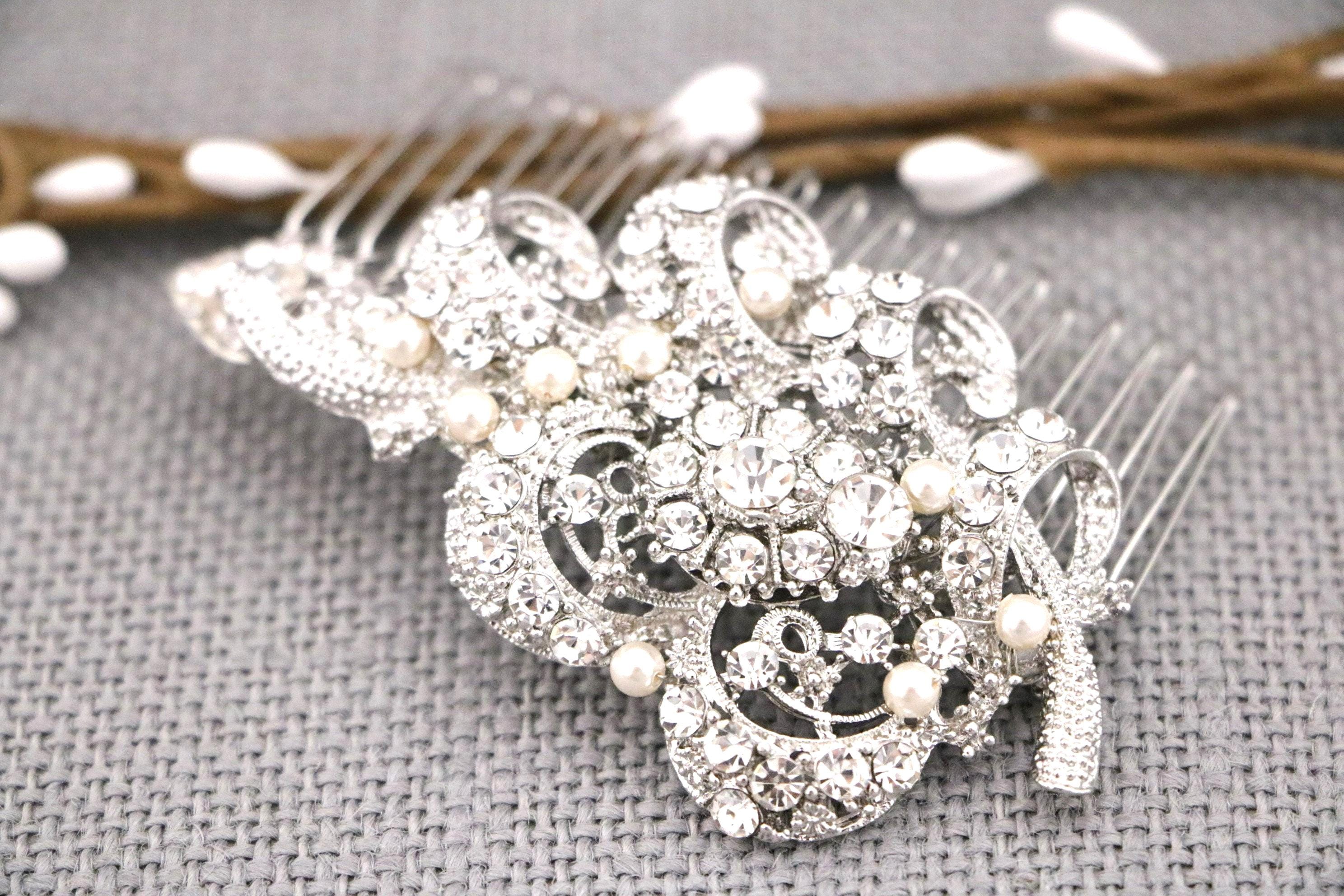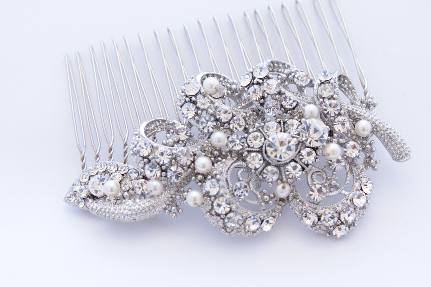This sparkle rhinestone hair comb features a very beautiful vintage style rhinestone piece and swarovski ivory pearls. Rhinestone piece and pearls are wired on a silver tone metal comb. The Rhinestone part measures approximately 3.5 X 1.75 inches.