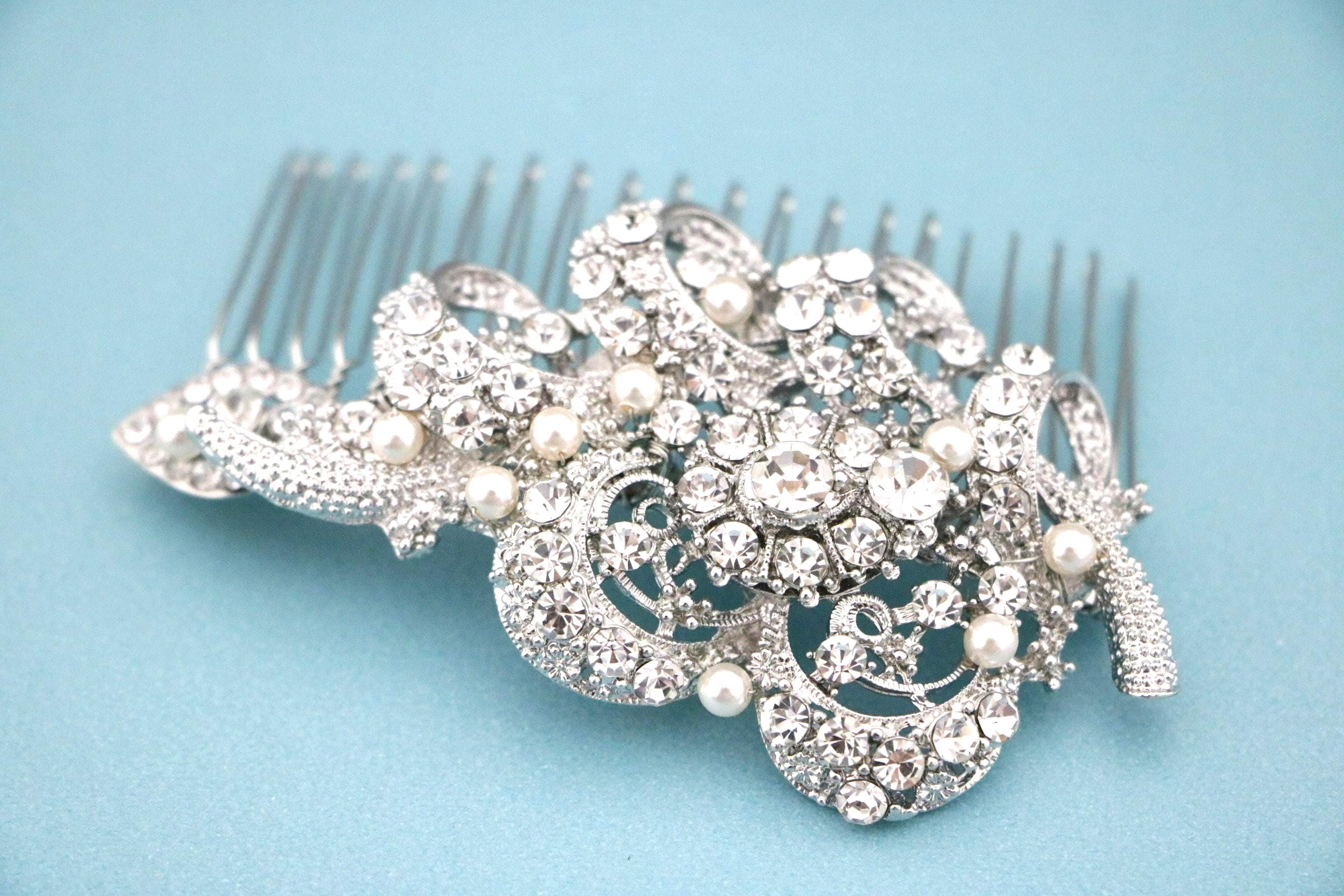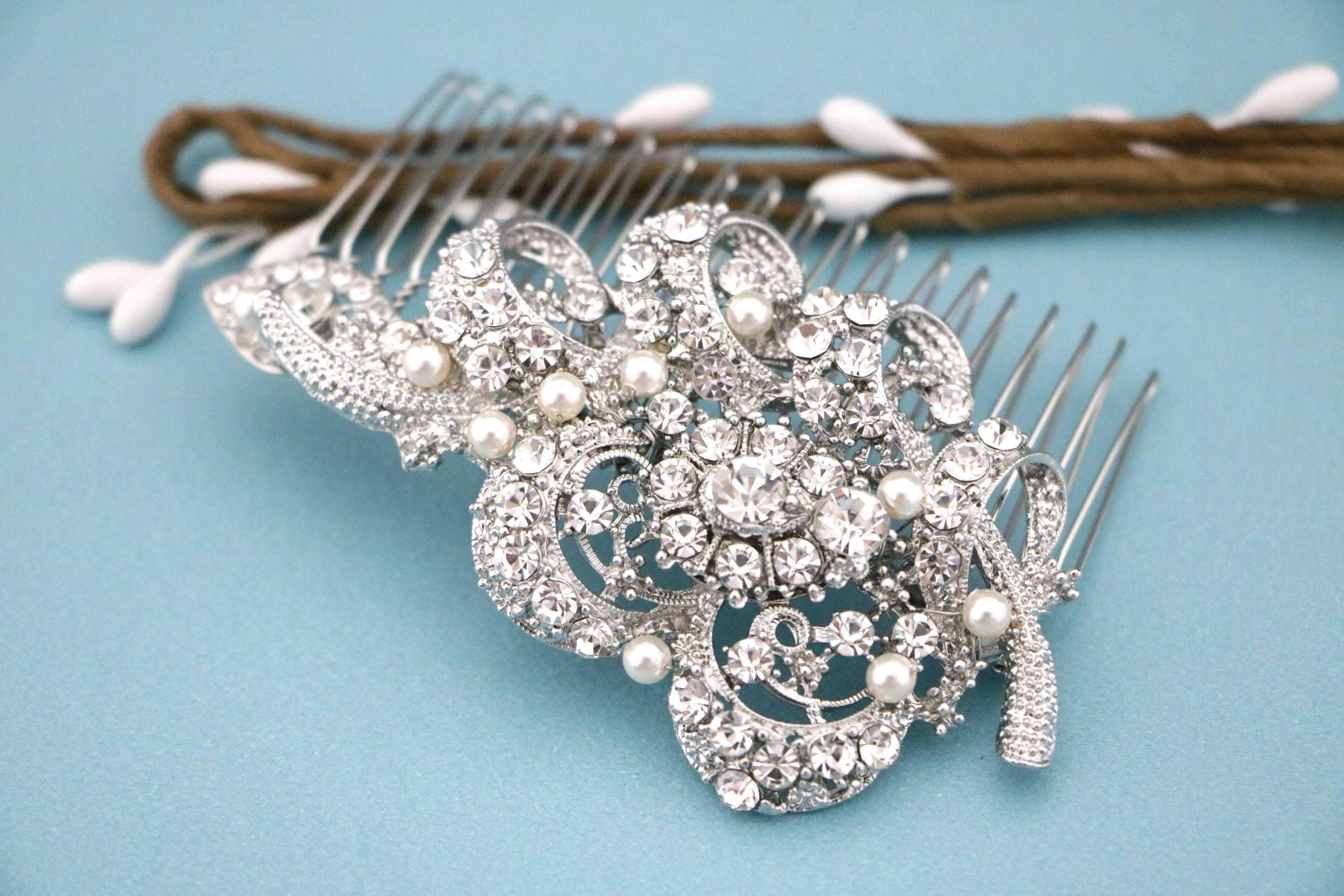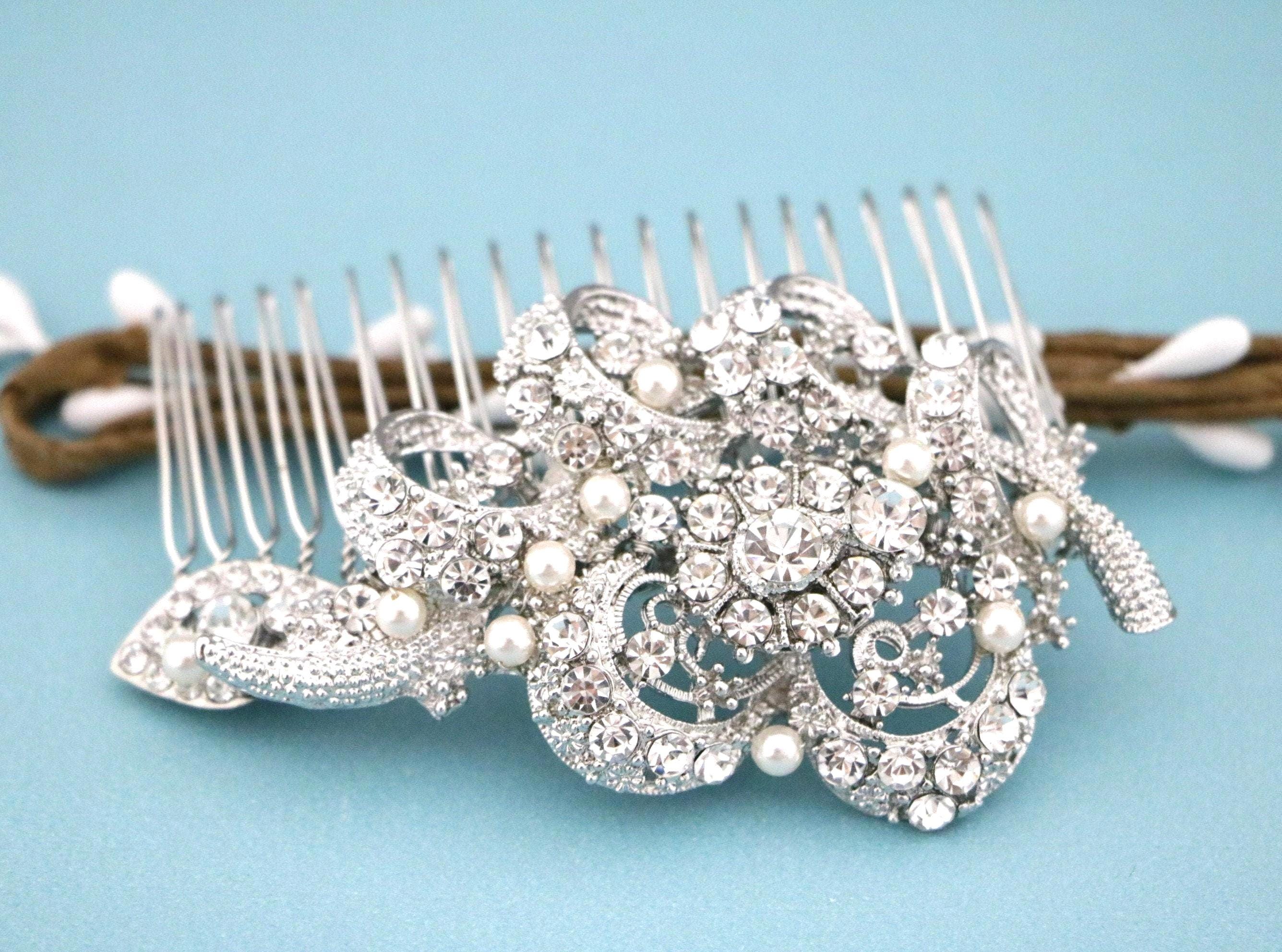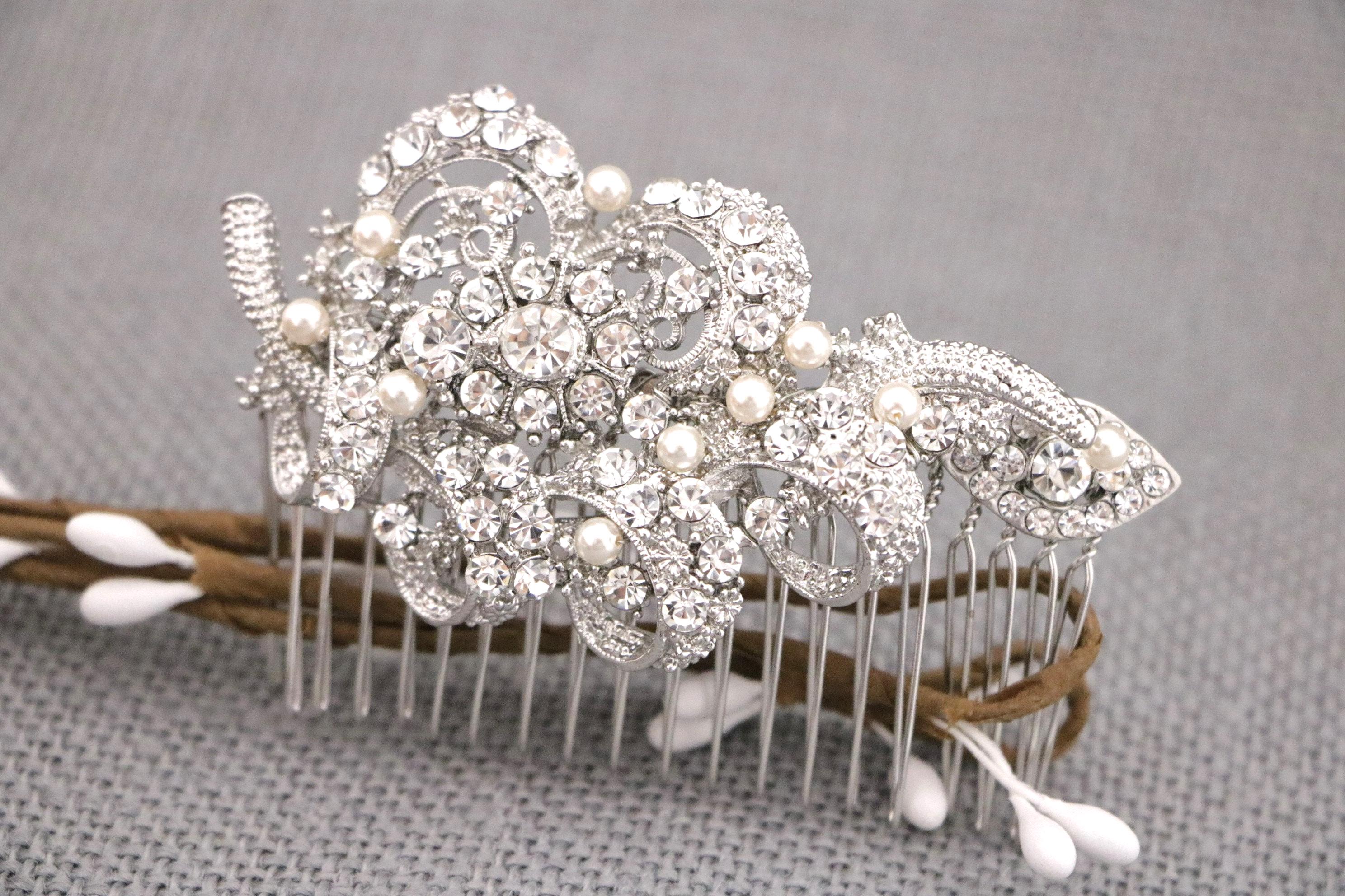 This sparkle rhinestone hair comb features a very beautiful vintage style rhinestone piece and swarovski ivory pearls. Rhinestone piece and pearls are wired on a silver tone metal comb. The Rhinestone part measures approximately 3.5 X 1.75 inches.