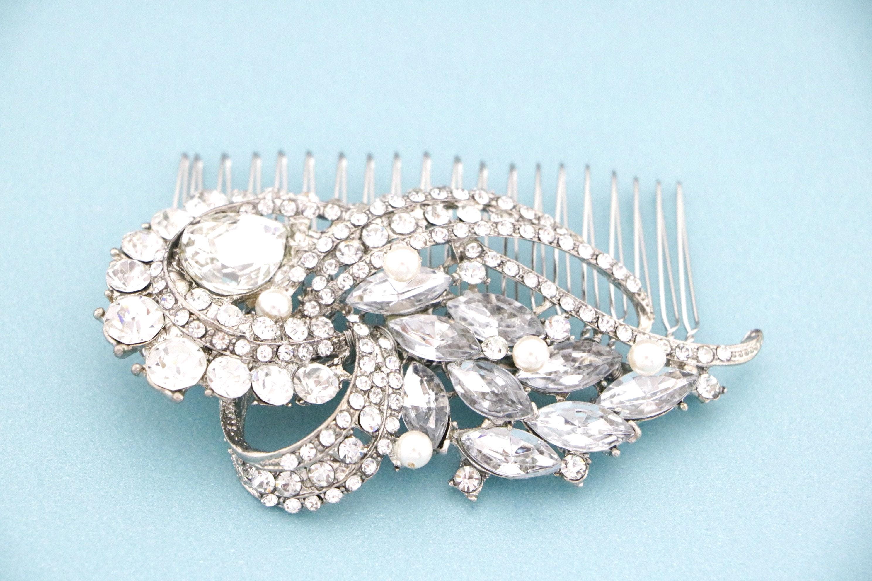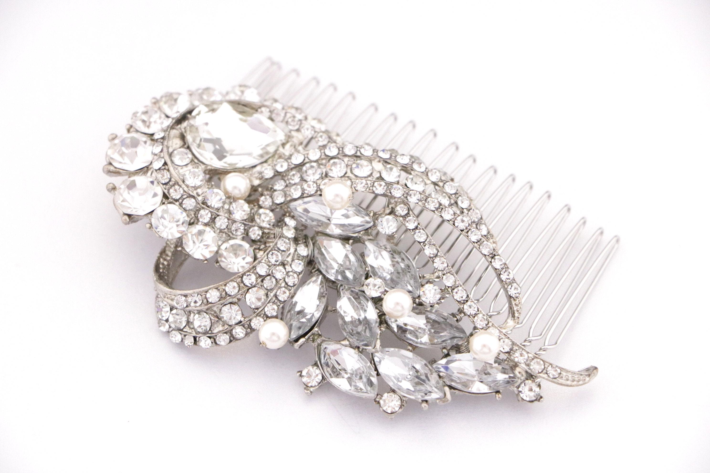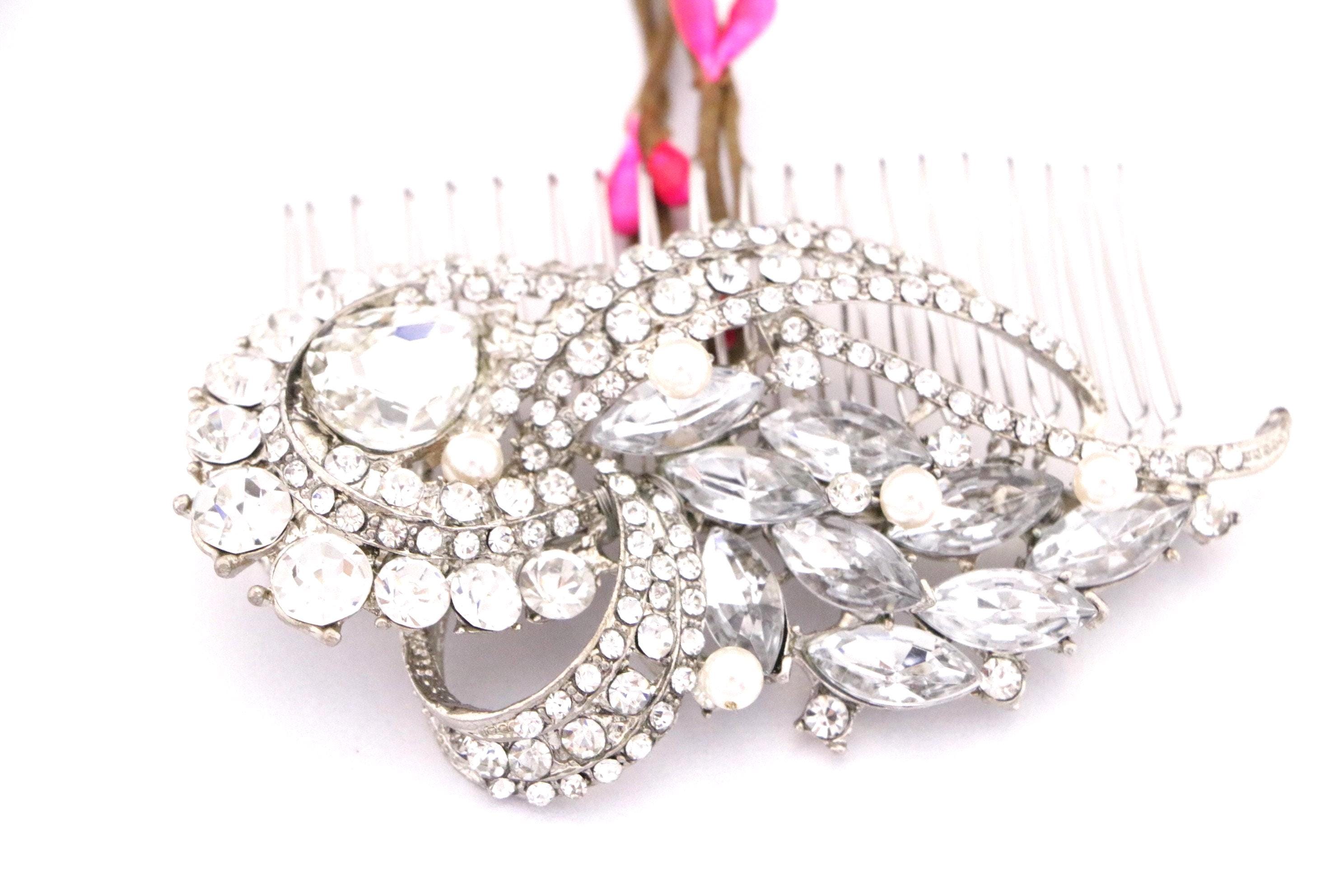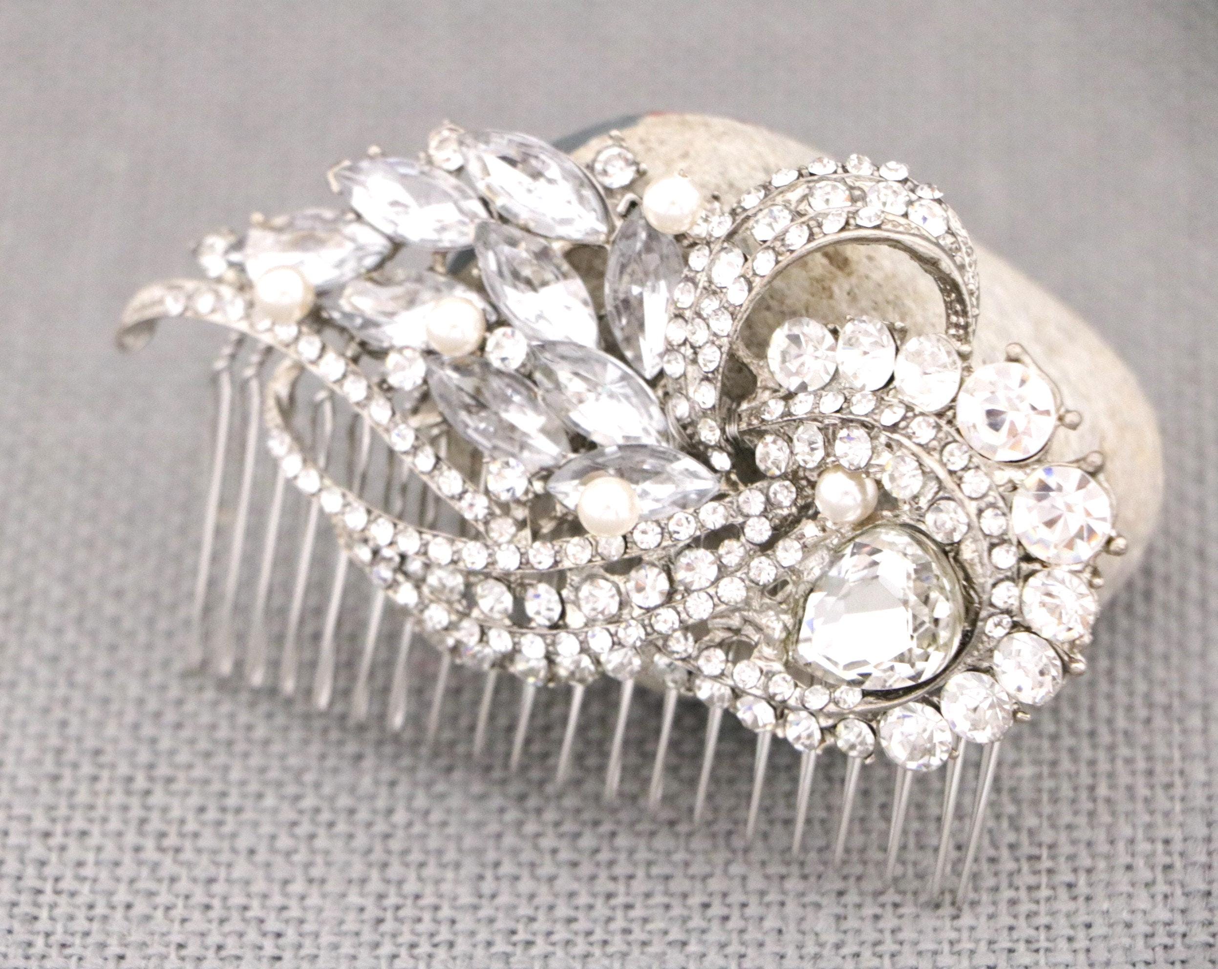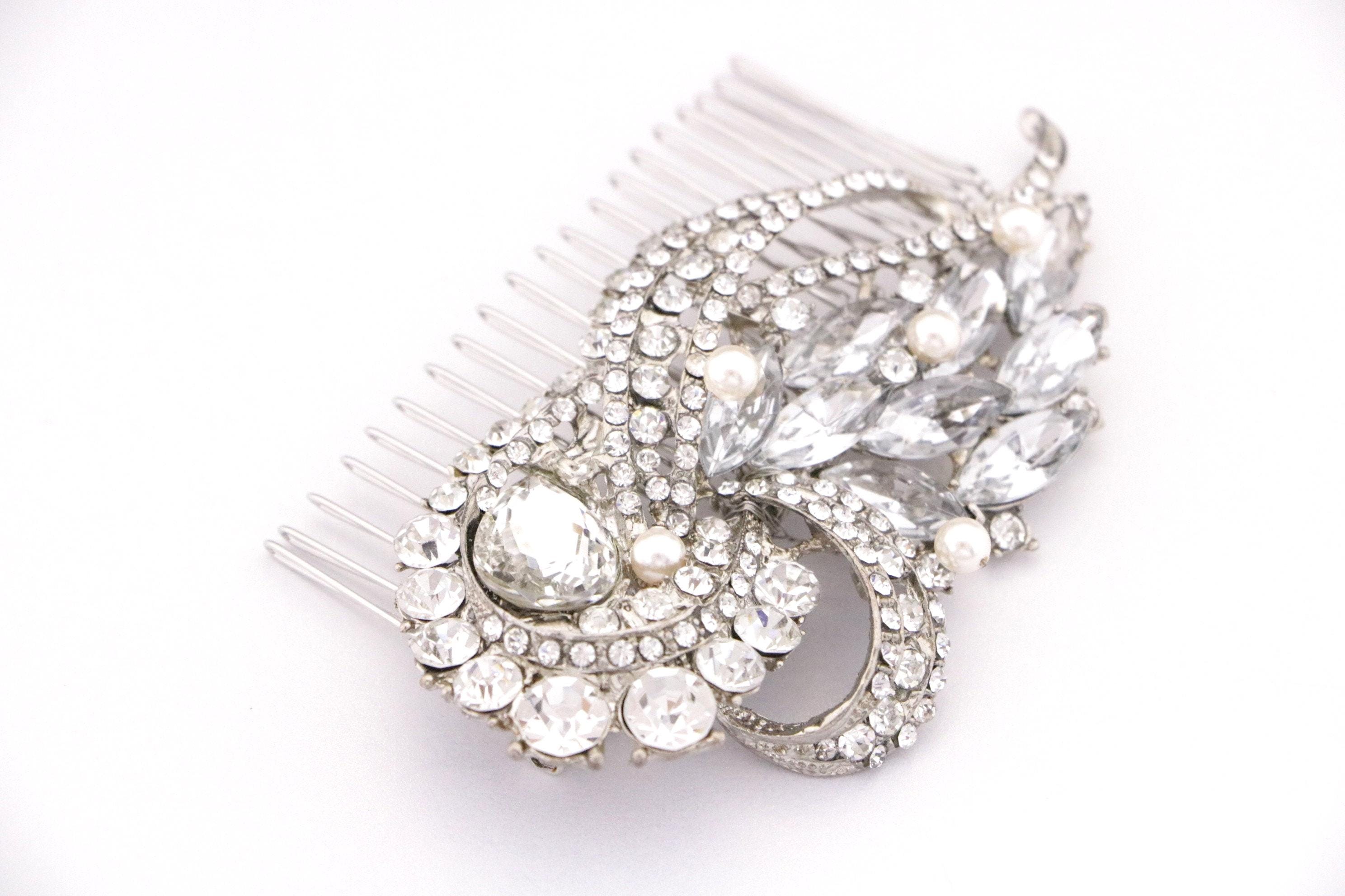 This sparkle rhinestone hair comb features a very beautiful vintage style rhinestone piece and Swarovski ivory pearls. Rhinestone piece and pearls are wired on a silver tone metal comb. The rhinestone part measures approximately 3.75 X 2 inches.