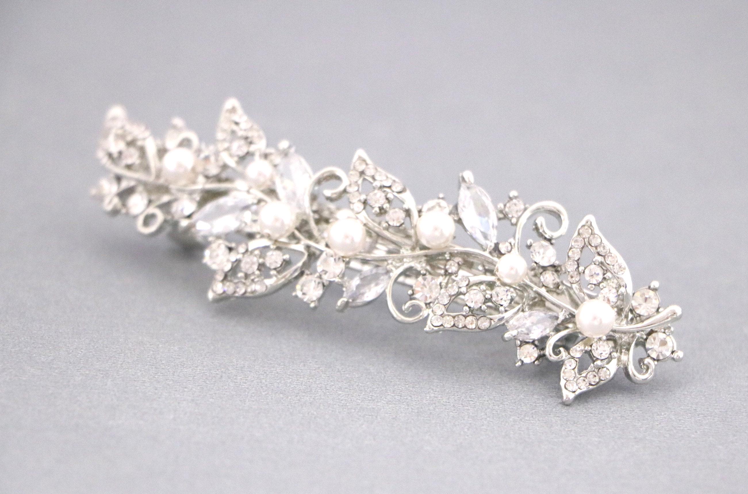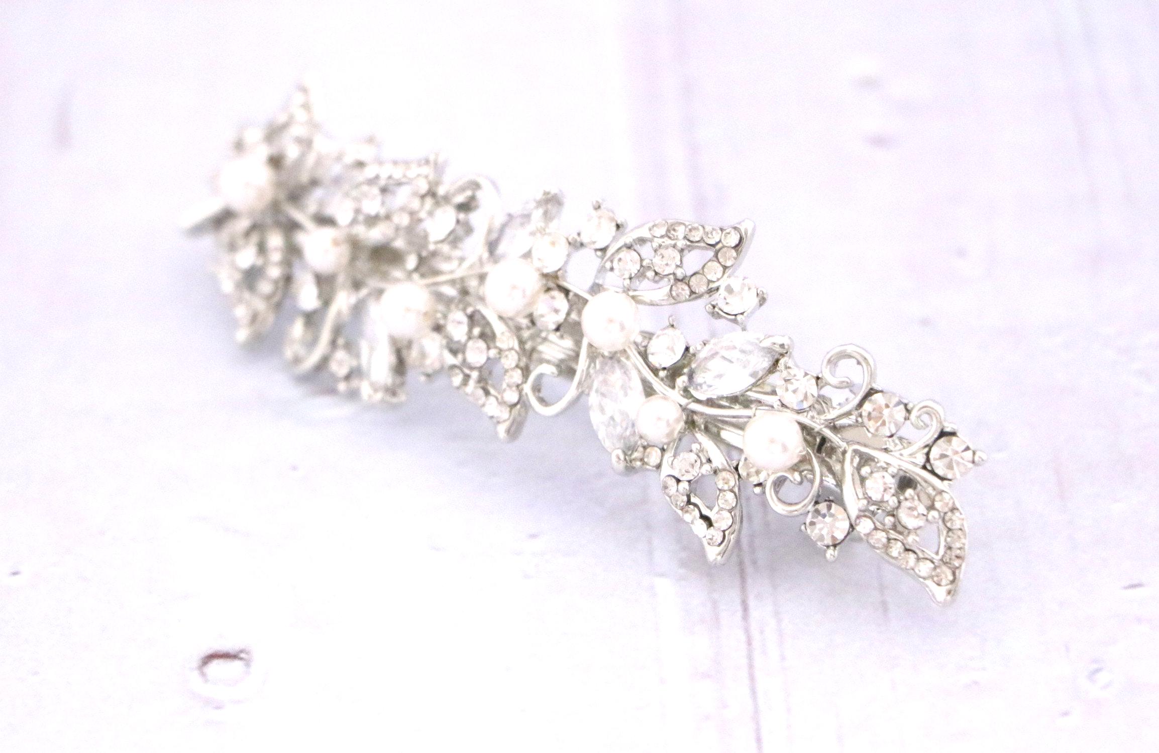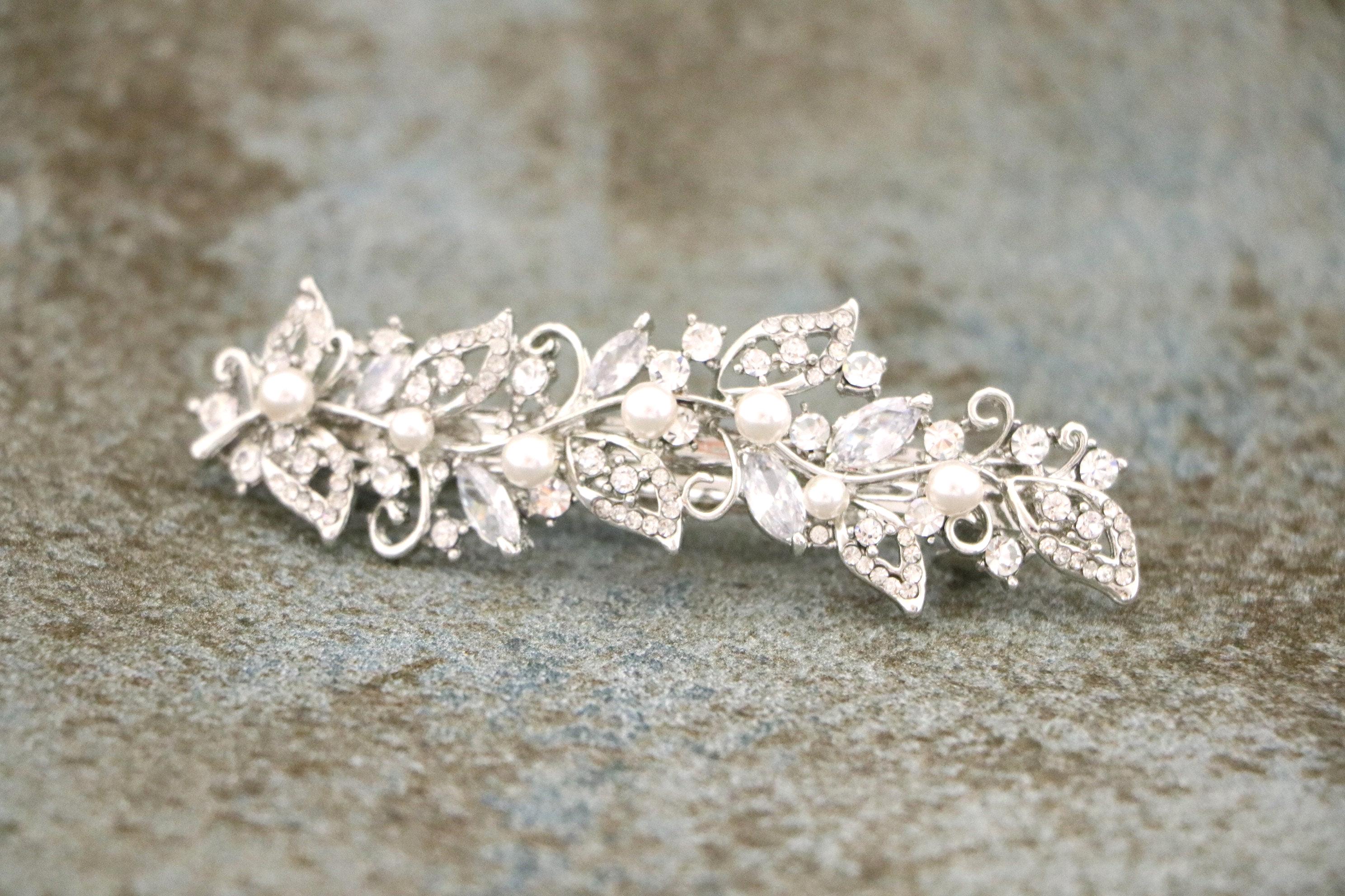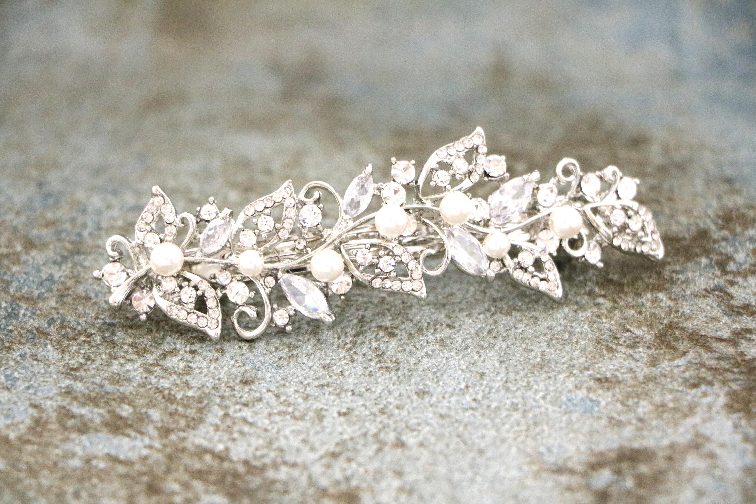 This sparkle rhinestone hair comb features a very beautiful vintage style rhinestone piece and Swarovski ivory pearls. Rhinestone piece and pearls are set it on a metal barrette or on a metal hair comb. The rhinestone part measures approximately 3.75 X 1 inches.