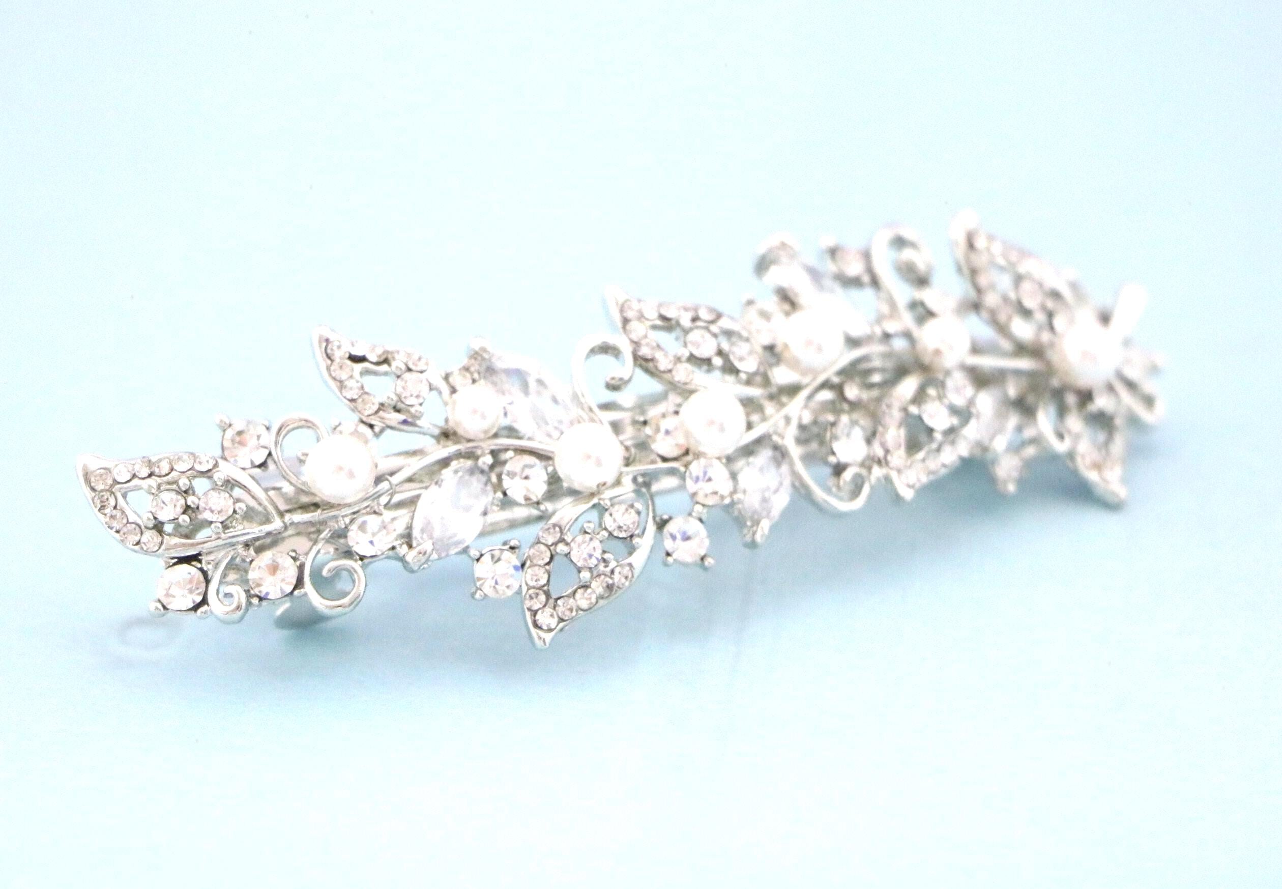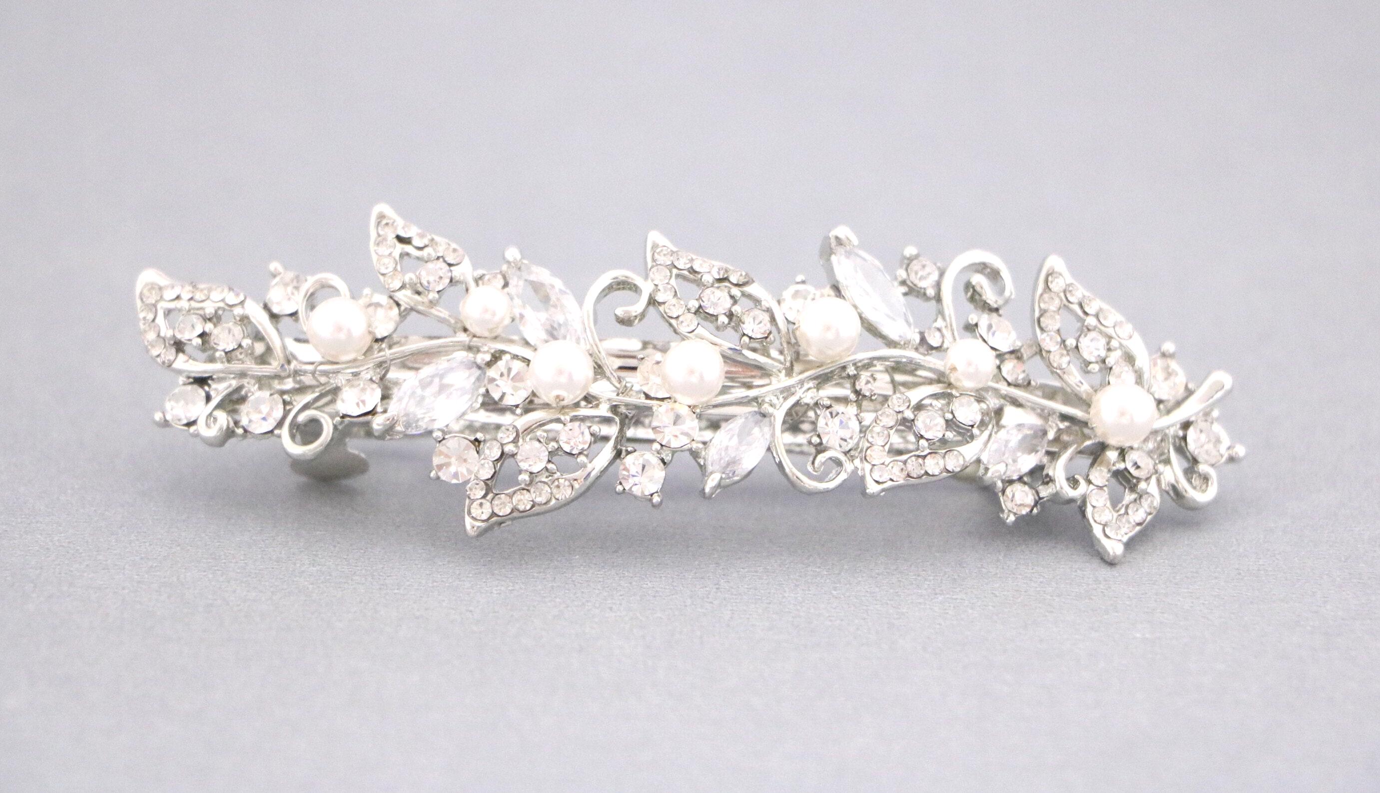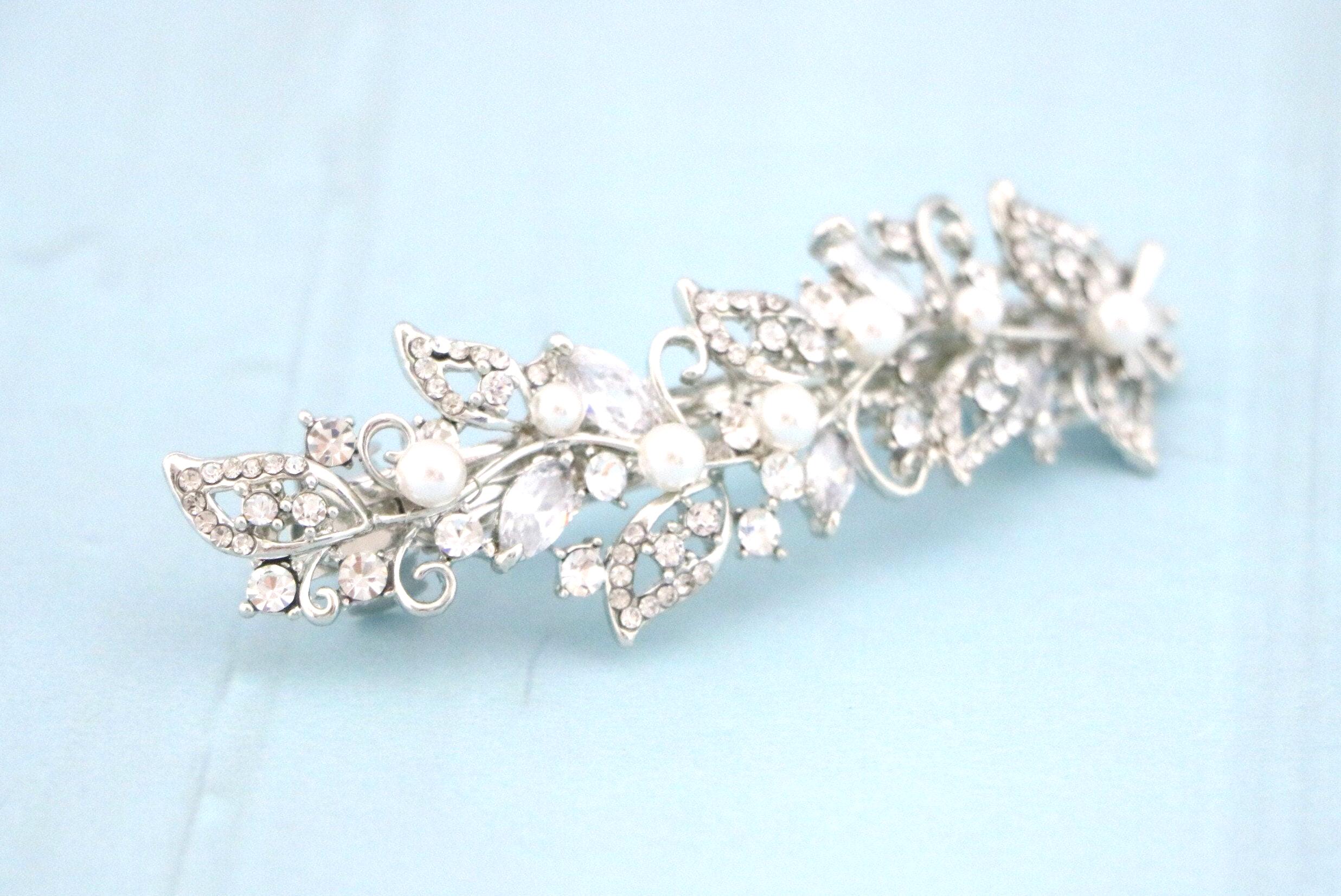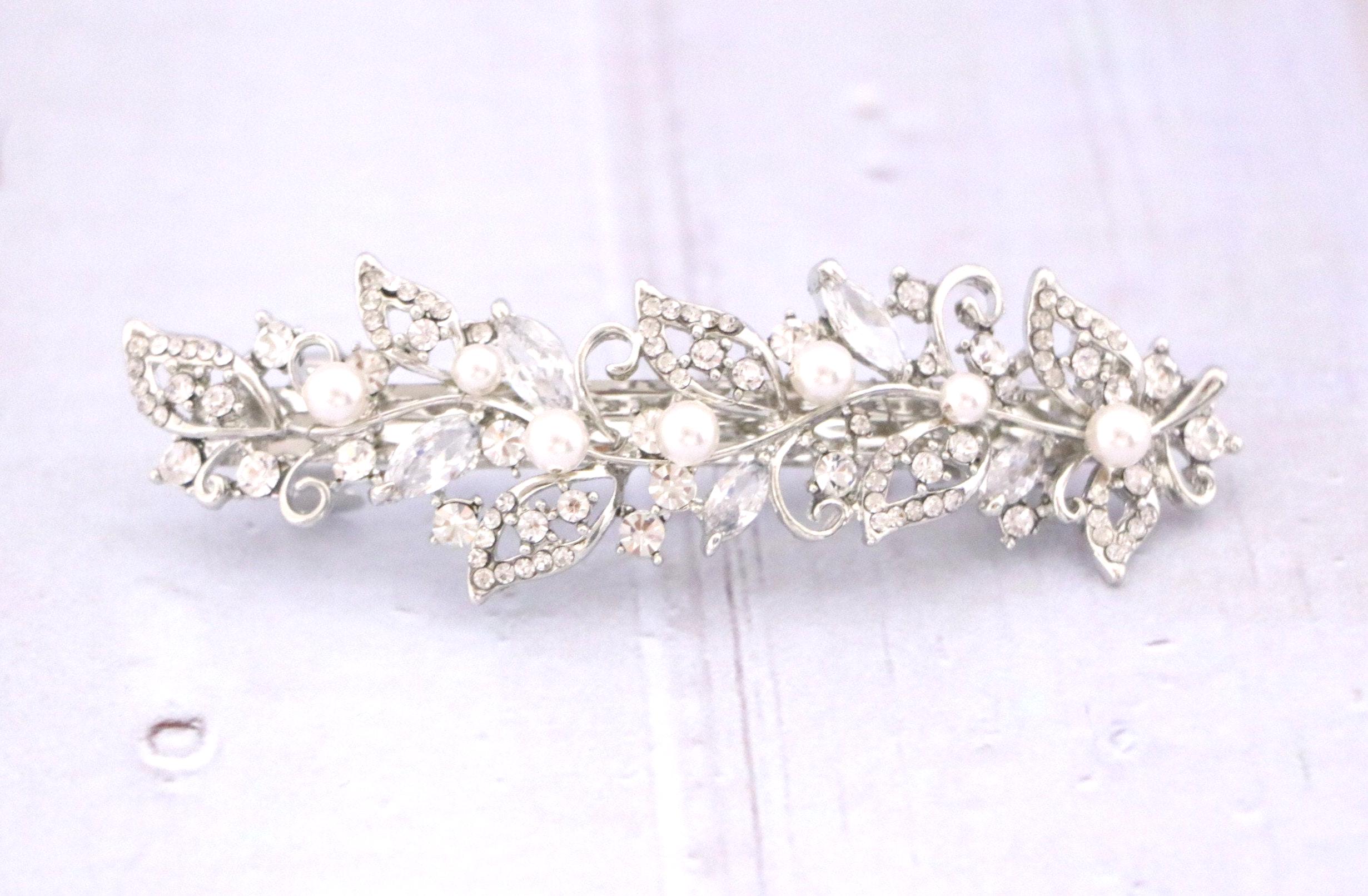 This sparkle rhinestone hair comb features a very beautiful vintage style rhinestone piece and Swarovski ivory pearls. Rhinestone piece and pearls are set it on a metal barrette or on a metal hair comb. The rhinestone part measures approximately 3.75 X 1 inches.
