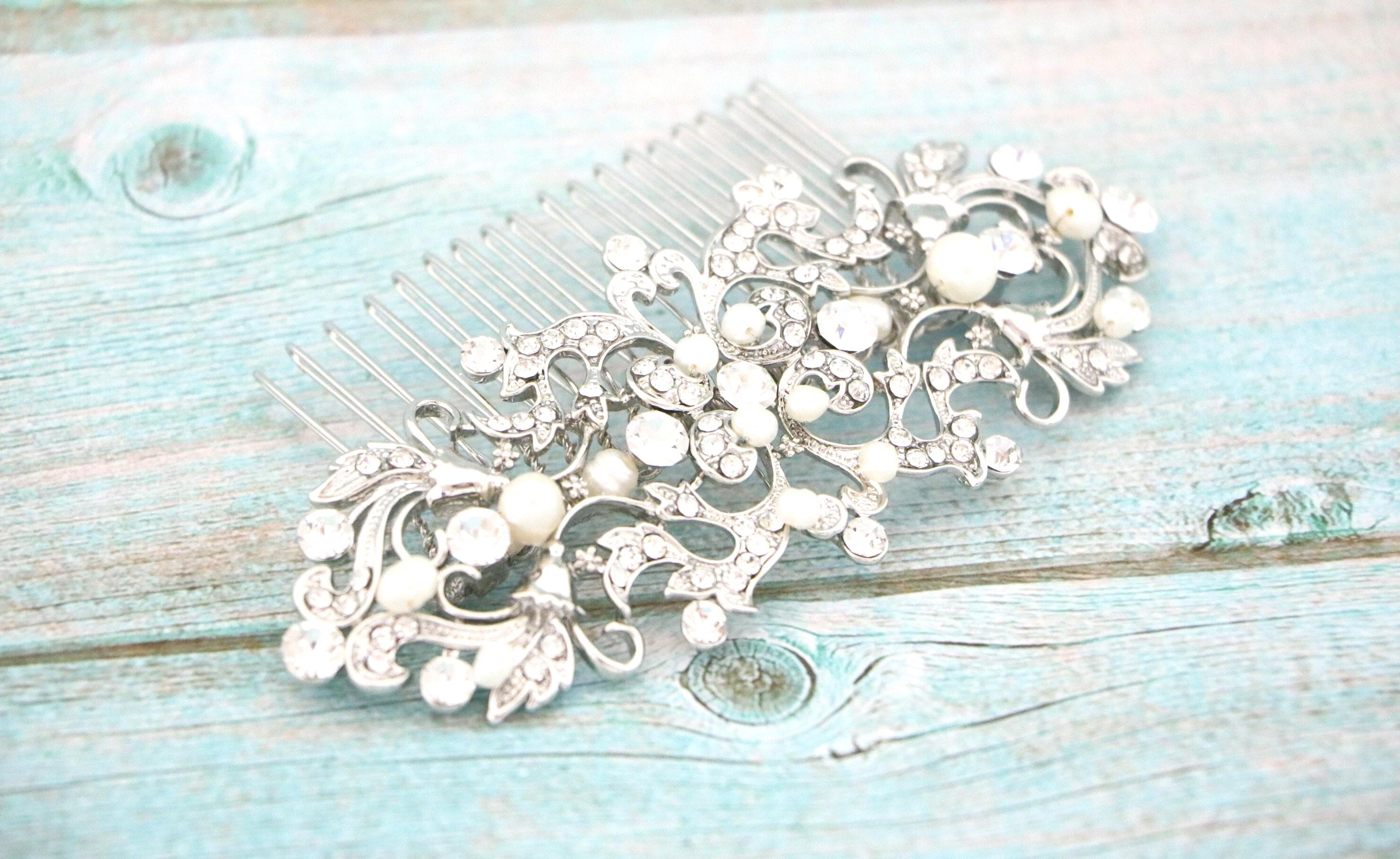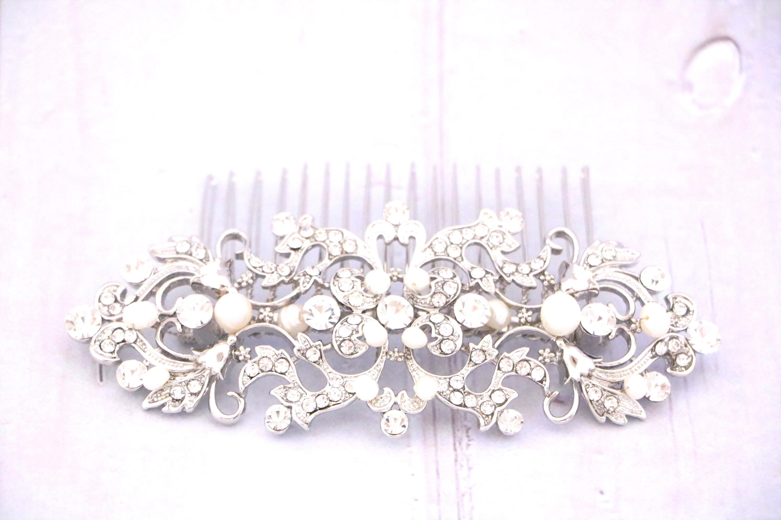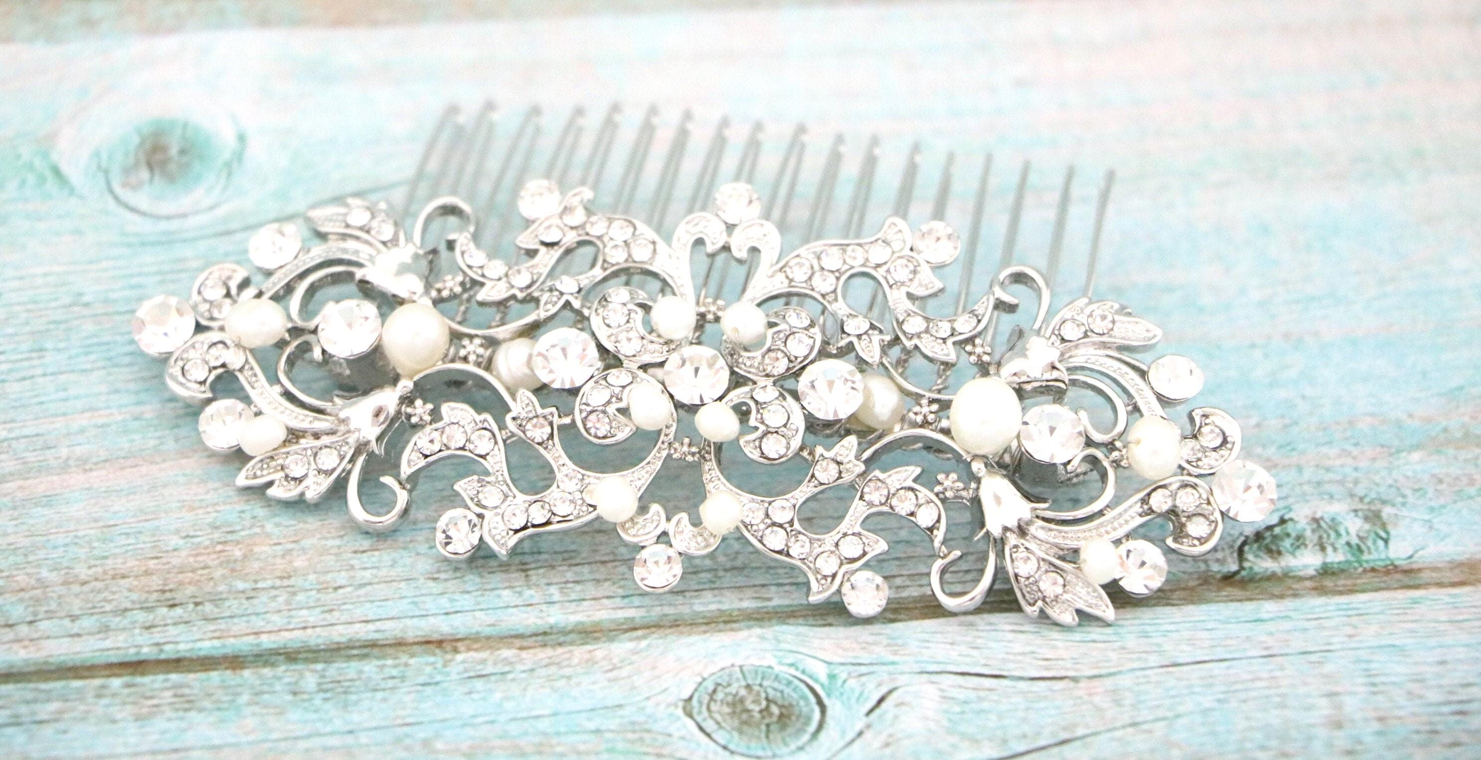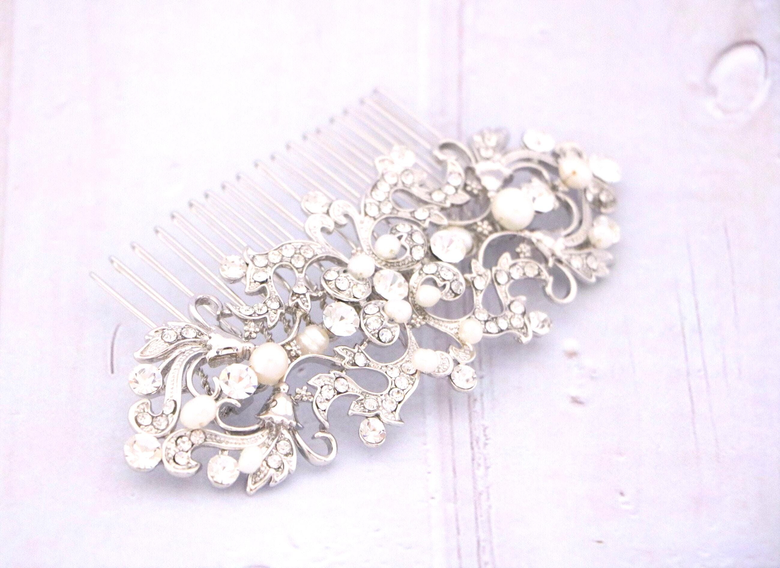 This sparkle rhinestone hair comb features a very beautiful vintage style rhinestone piece and Swarovski ivory pearls. Rhinestone piece and pearls are wired on a silver tone metal comb. The rhinestone part measures approximately 4.5 X 2 inches.