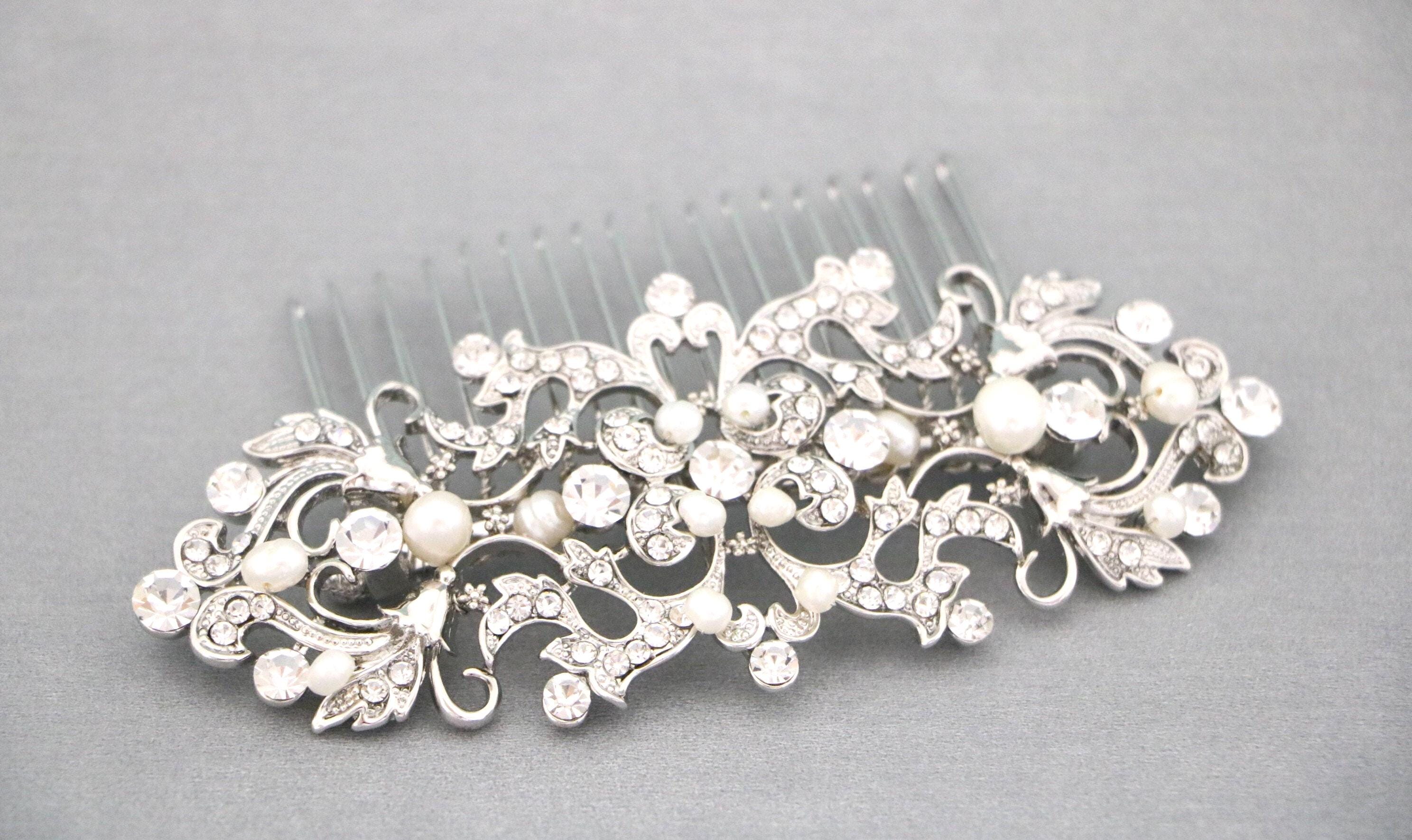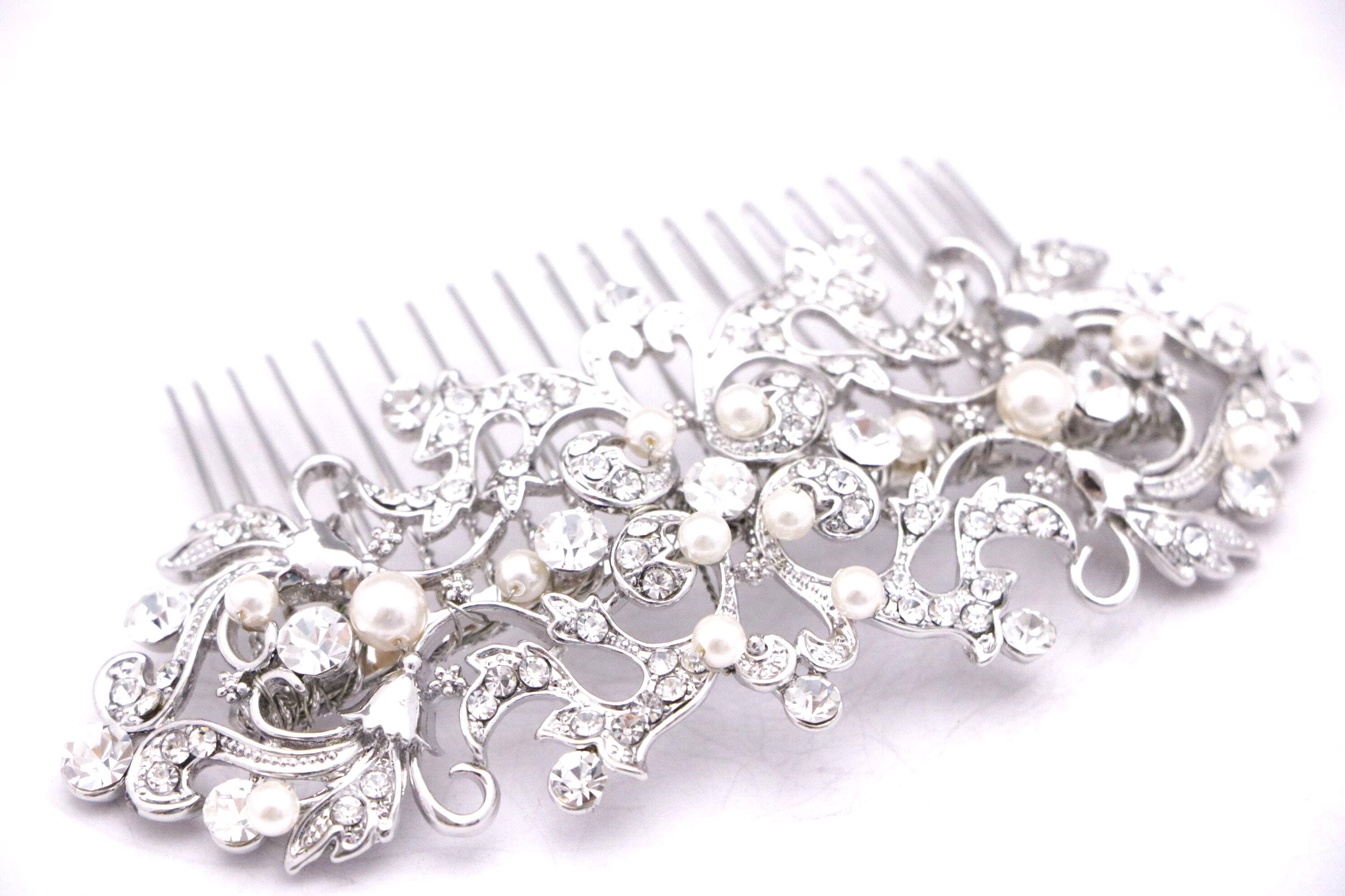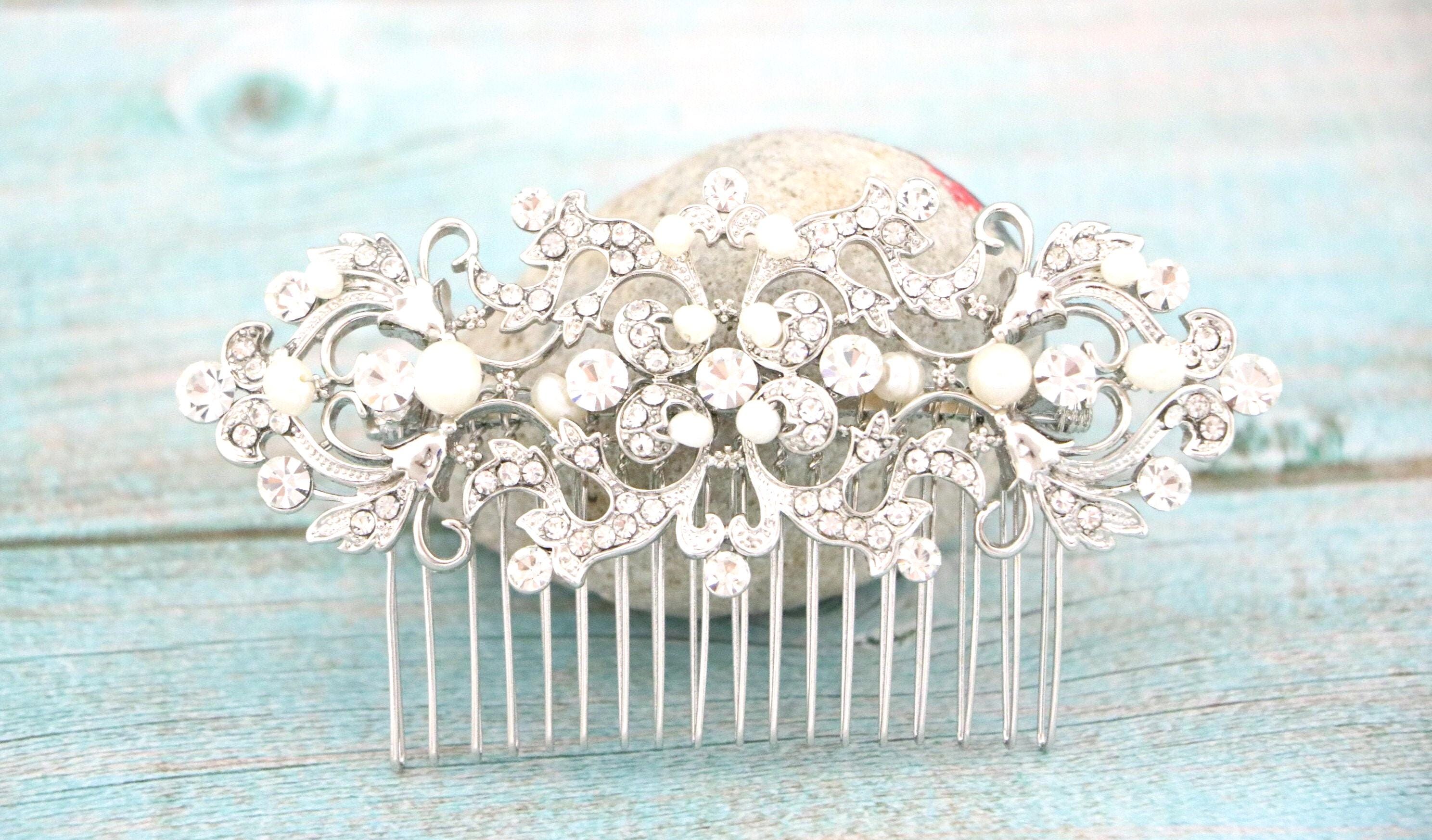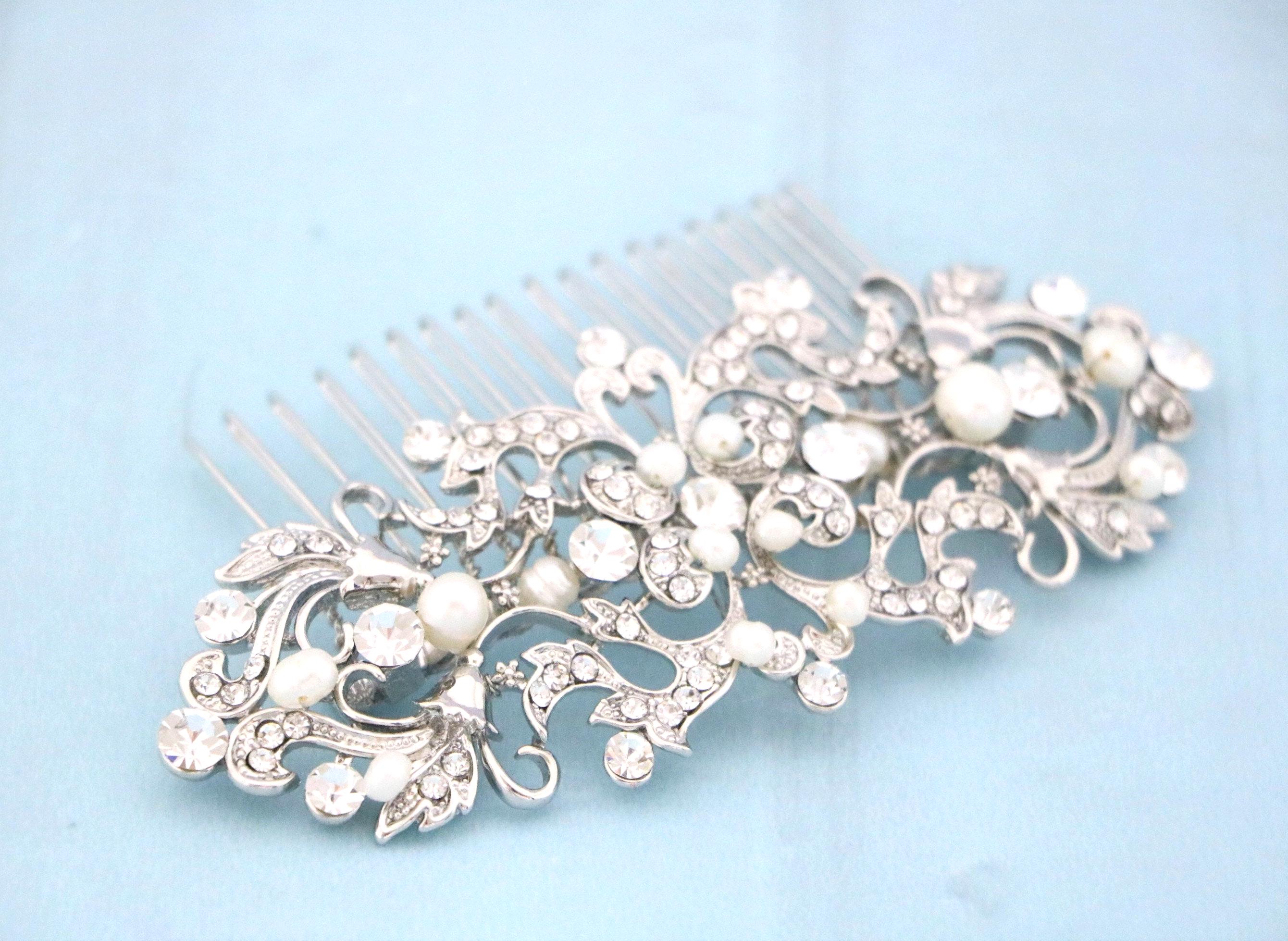 This sparkle rhinestone hair comb features a very beautiful vintage style rhinestone piece and Swarovski ivory pearls. Rhinestone piece and pearls are wired on a silver tone metal comb. The rhinestone part measures approximately 4.5 X 2 inches.