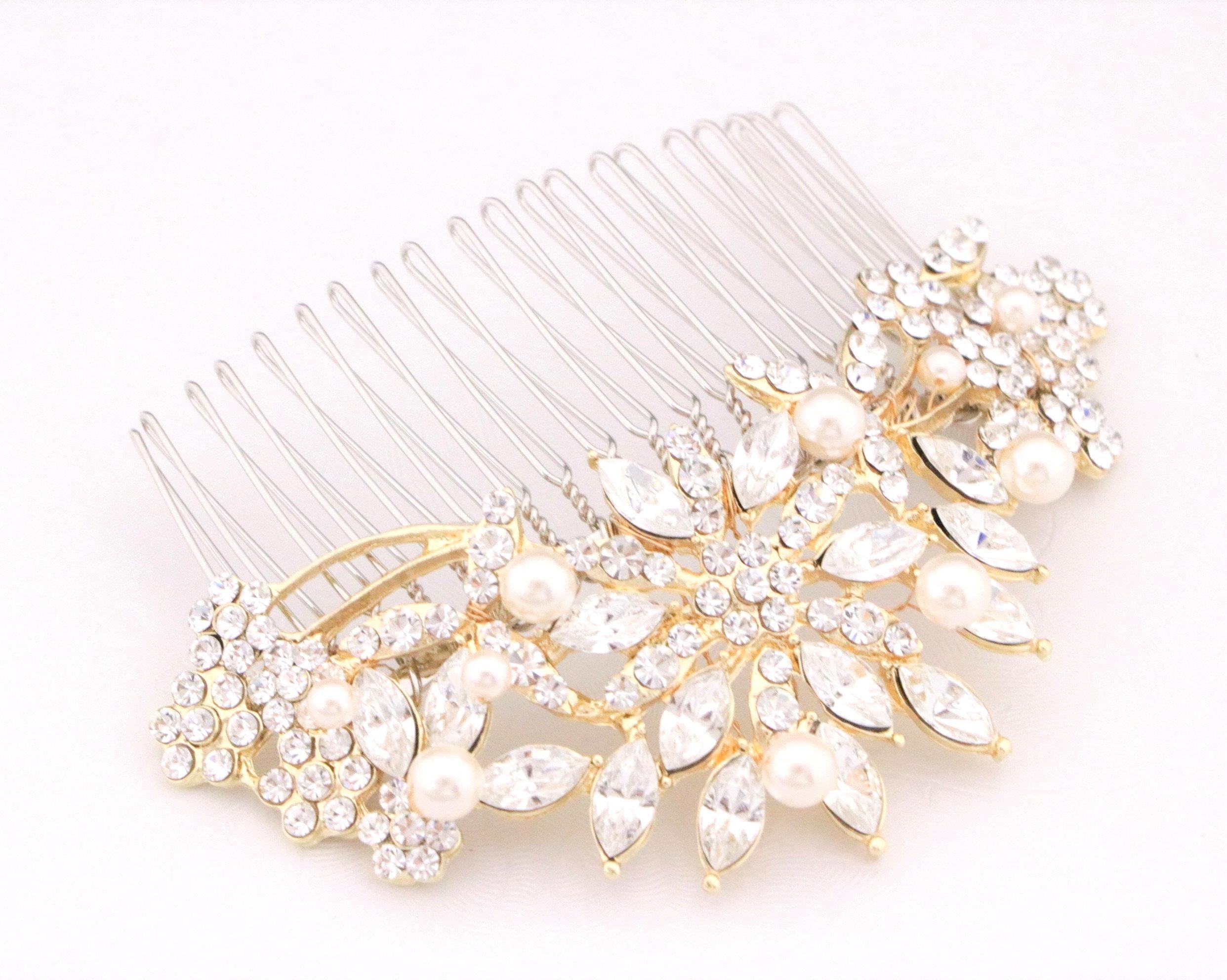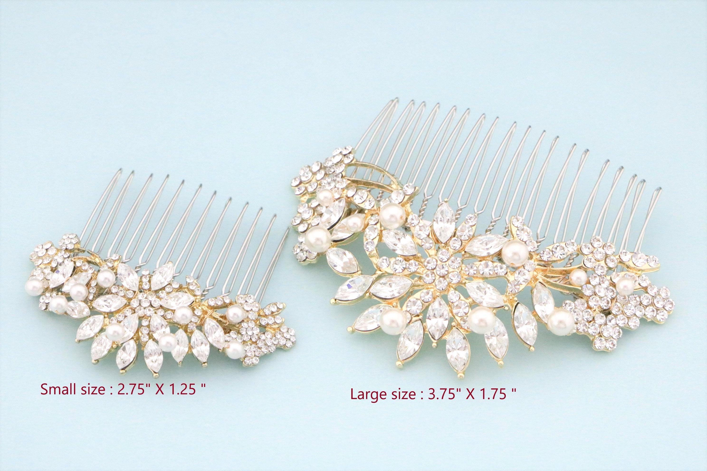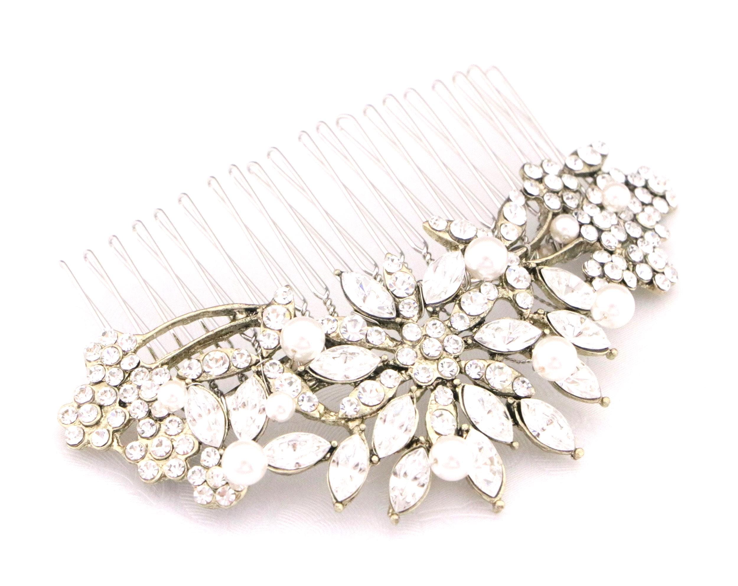 This beautiful Clear rhinestone Swarovski pearl hair comb is a perfect compliment for the wedding party and can easily fit into any hair style. The brooch is measured approximately 3.75 X 1.75 inches. and the comb is approximately 3 inches wide.