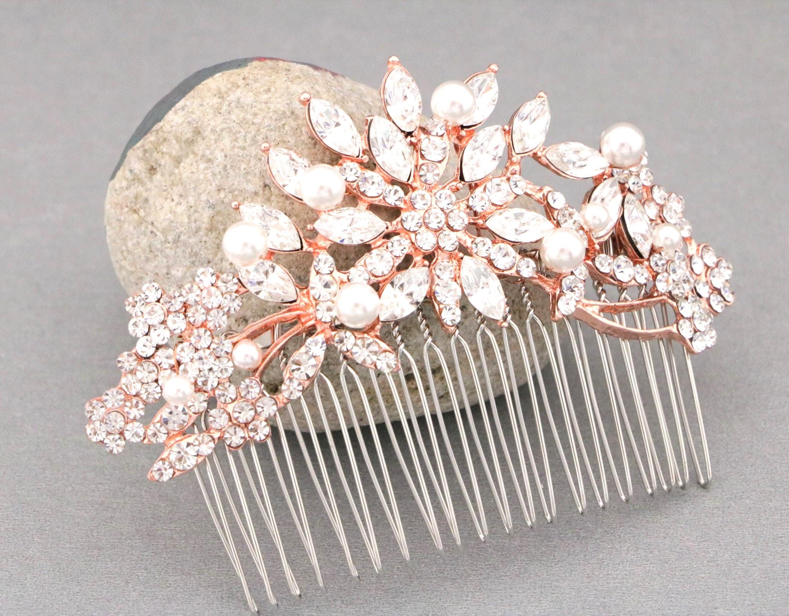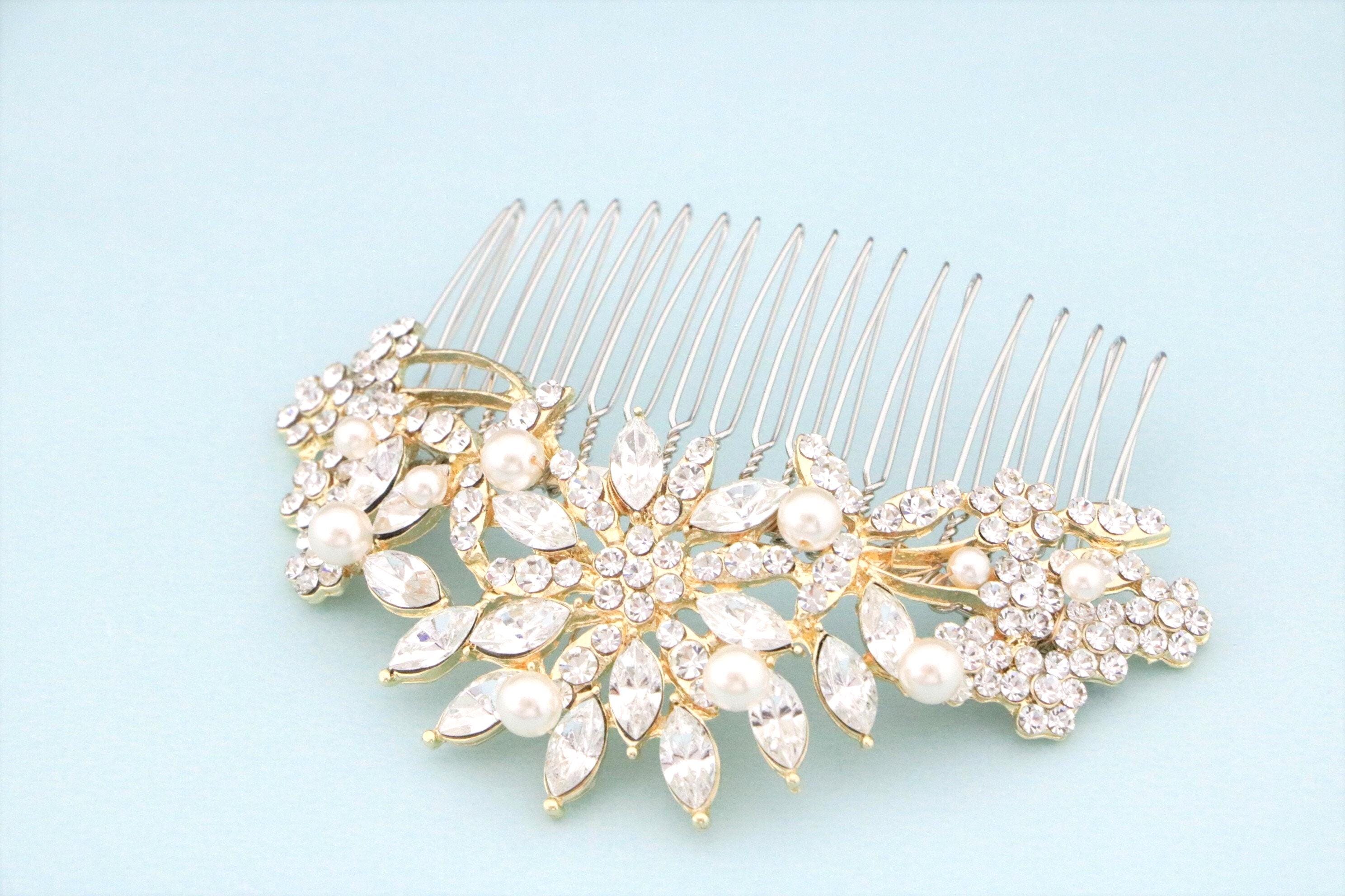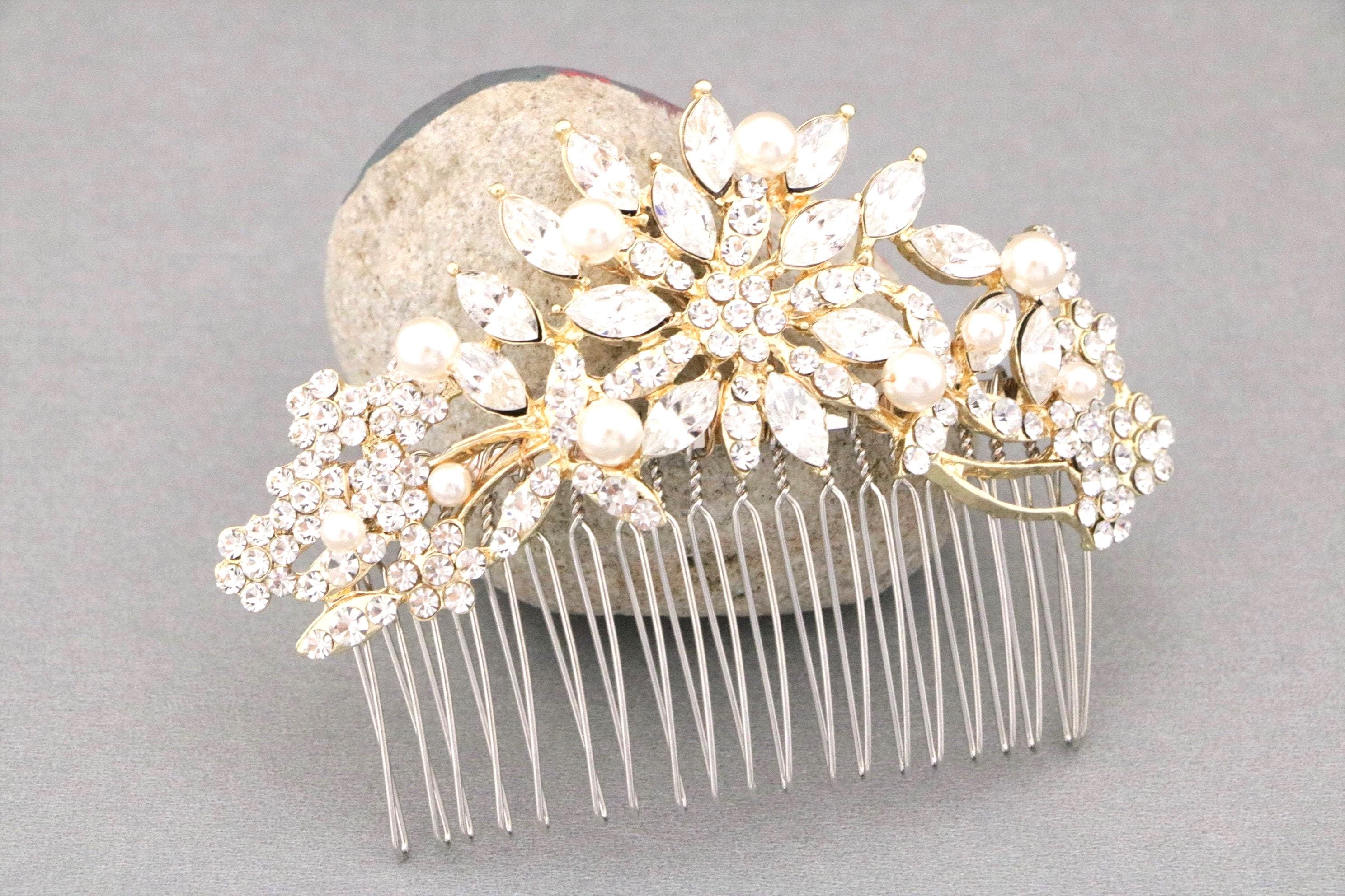 This beautiful Clear rhinestone Swarovski pearl hair comb is a perfect compliment for the wedding party and can easily fit into any hair style. The brooch is measured approximately 3.75 X 1.75 inches. and the comb is approximately 3 inches wide.