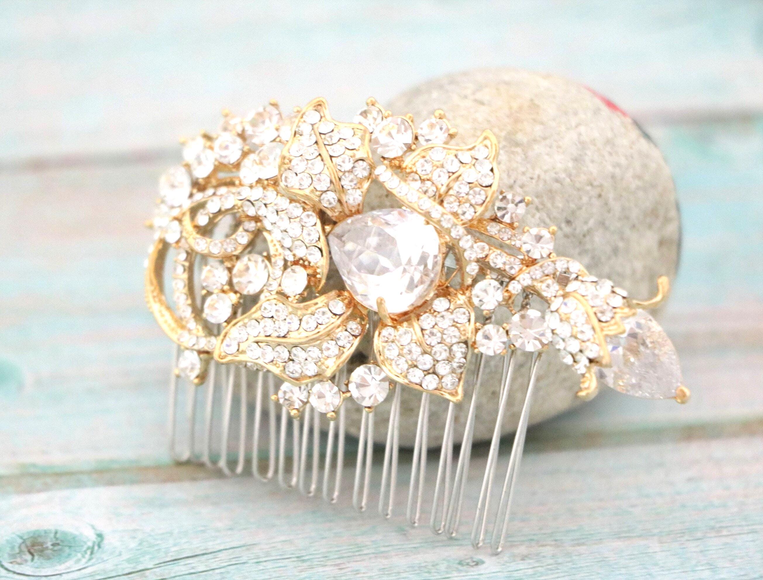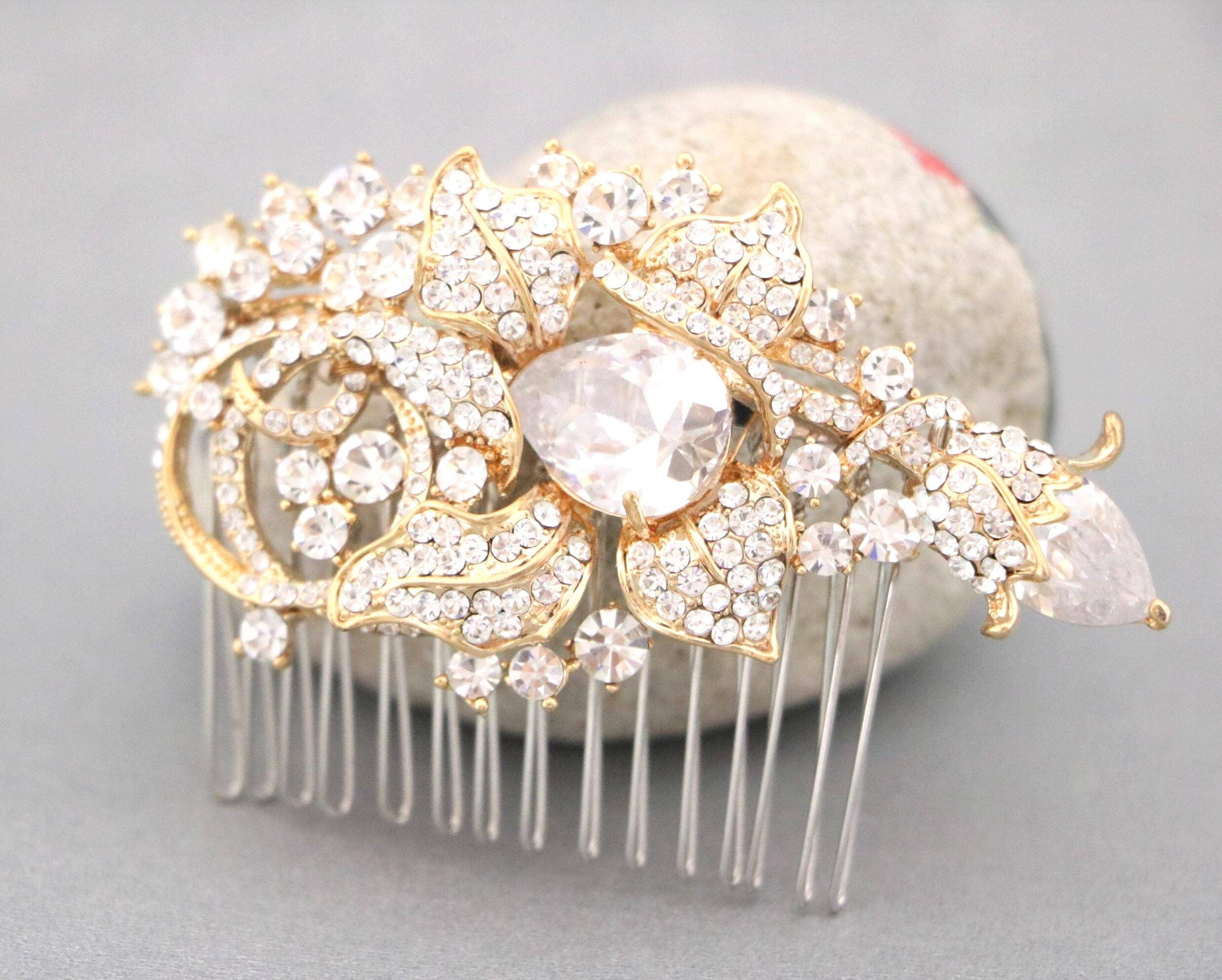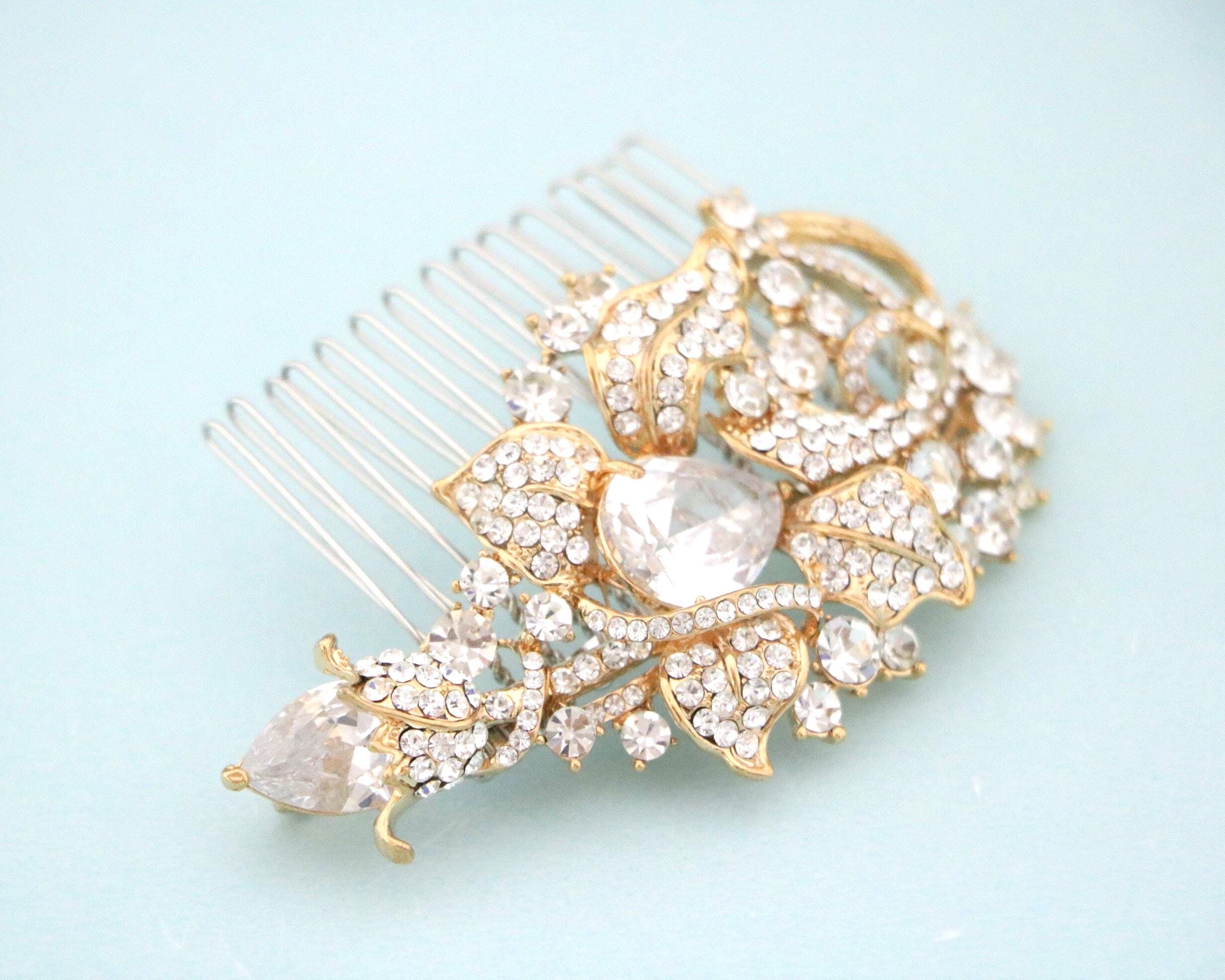 This sparkle rhinestone hair comb features a very beautiful vintage style rhinestone piece and set it on a metal hair comb. The rhinestone part measures approximately 3.25 X 2 inches.