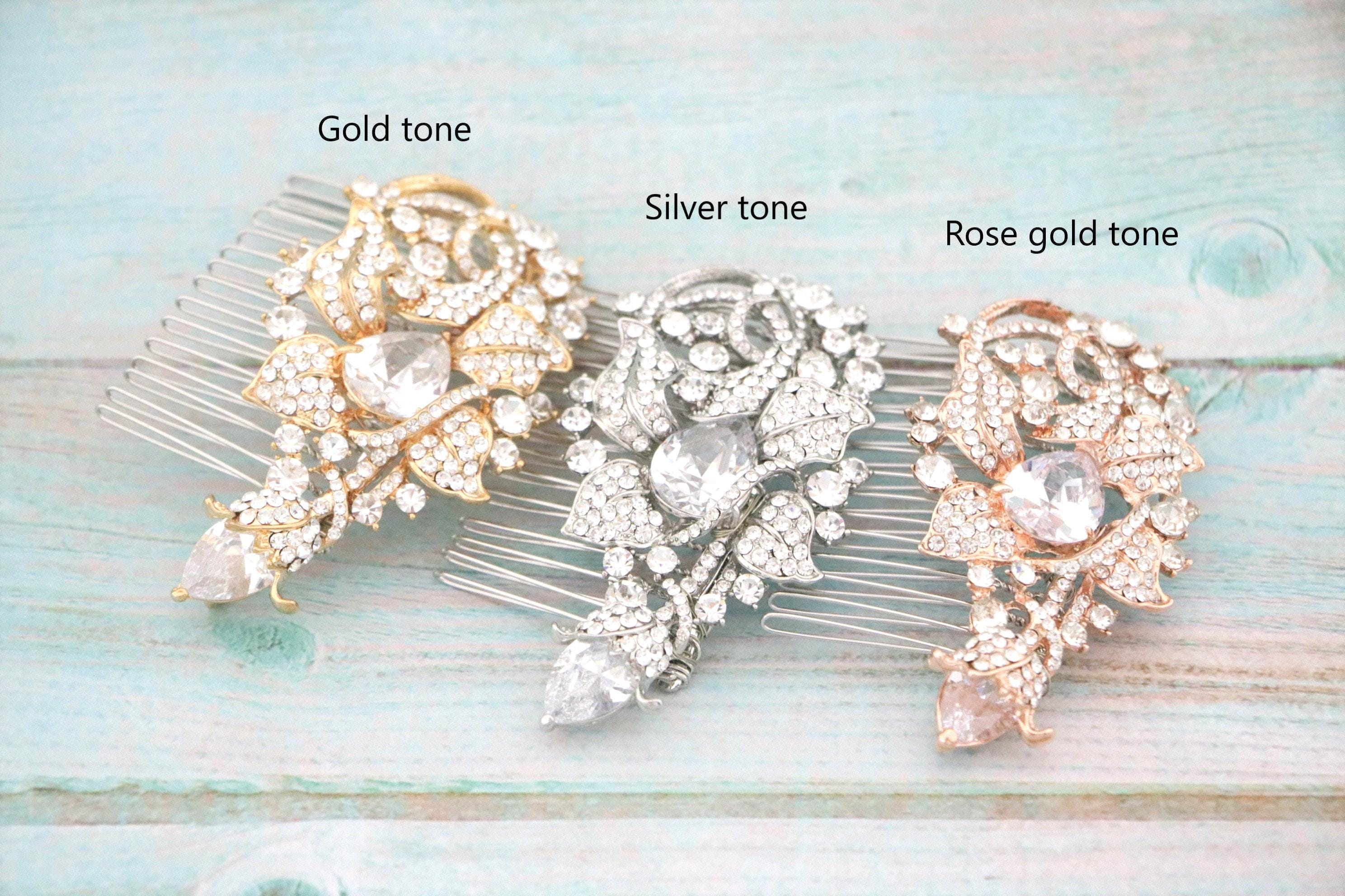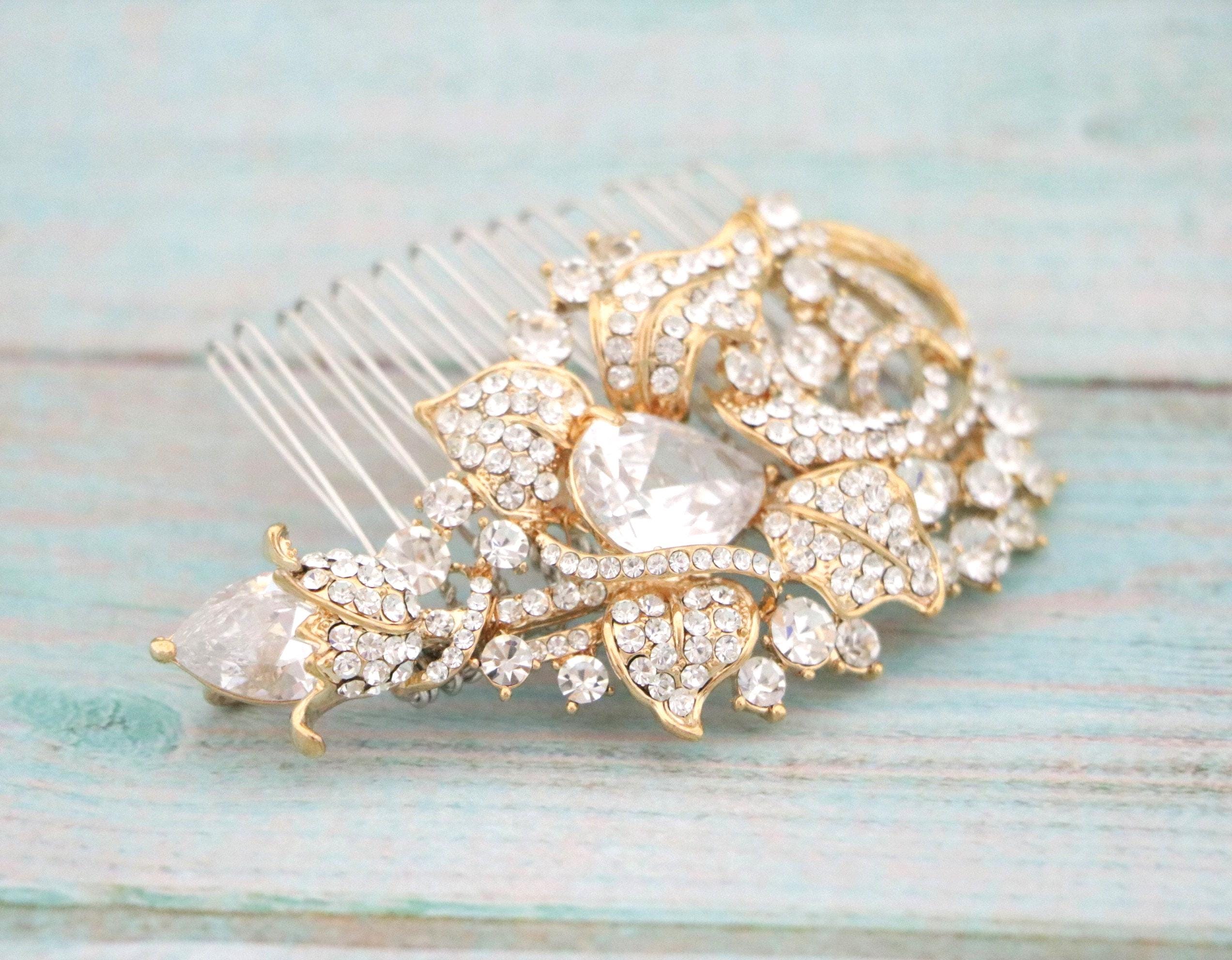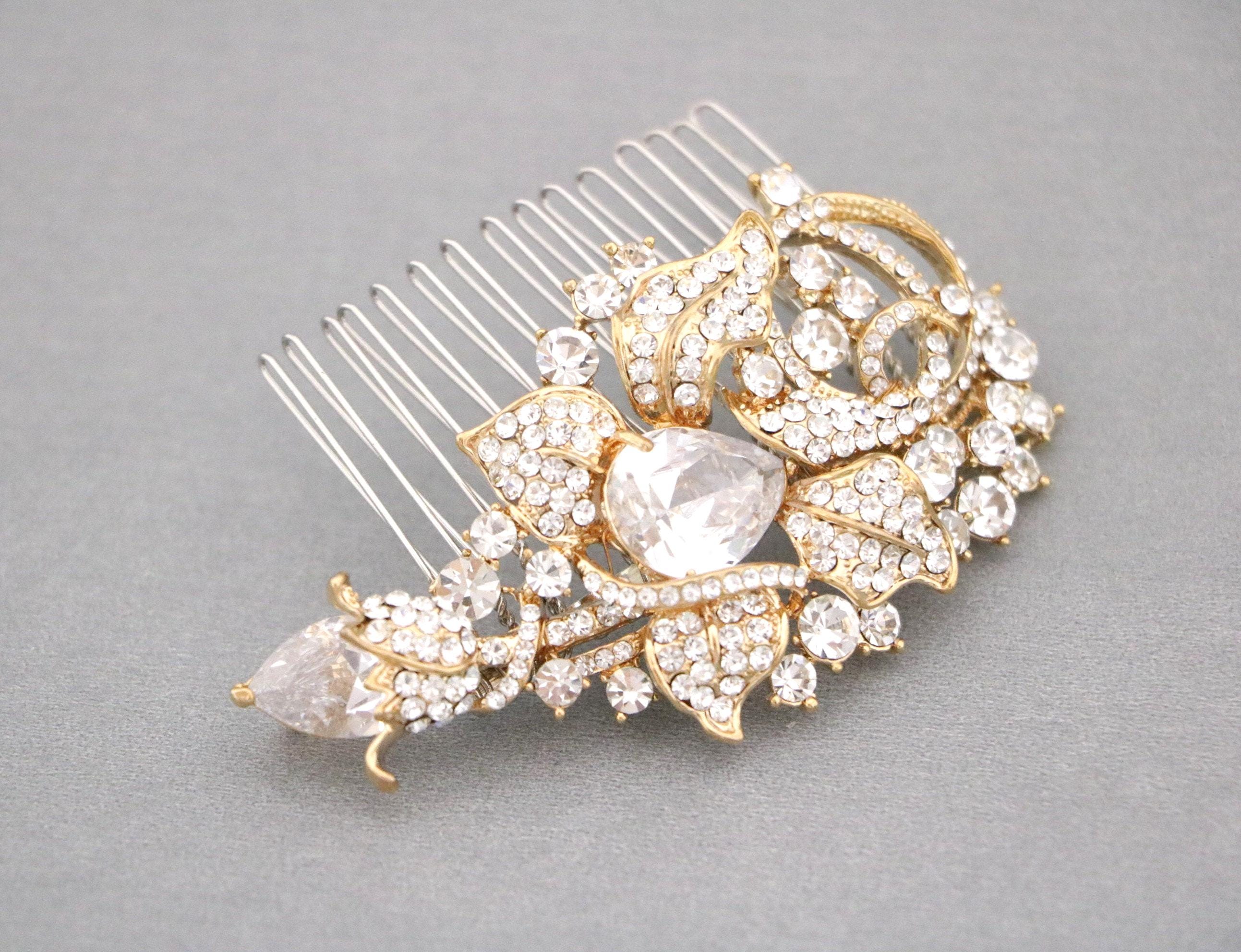 This sparkle rhinestone hair comb features a very beautiful vintage style rhinestone piece and set it on a metal hair comb. The rhinestone part measures approximately 3.25 X 2 inches.