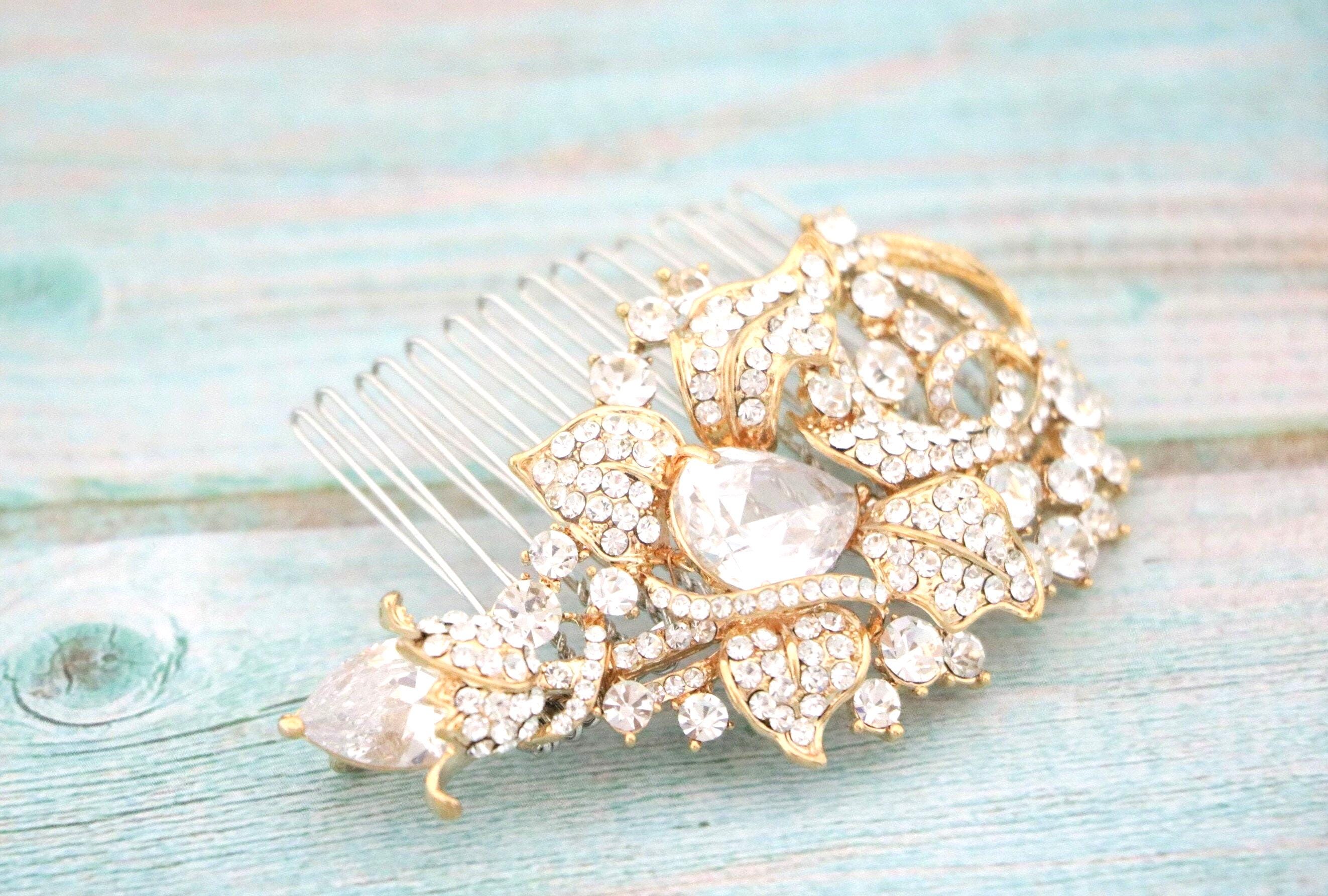 Gold Bridal Hair Comb, Small Wedding Hair Comb, Crystal Hairpiece with Pearls, Bridal Hair Accessories, Gold Veil Comb, Hair Clip