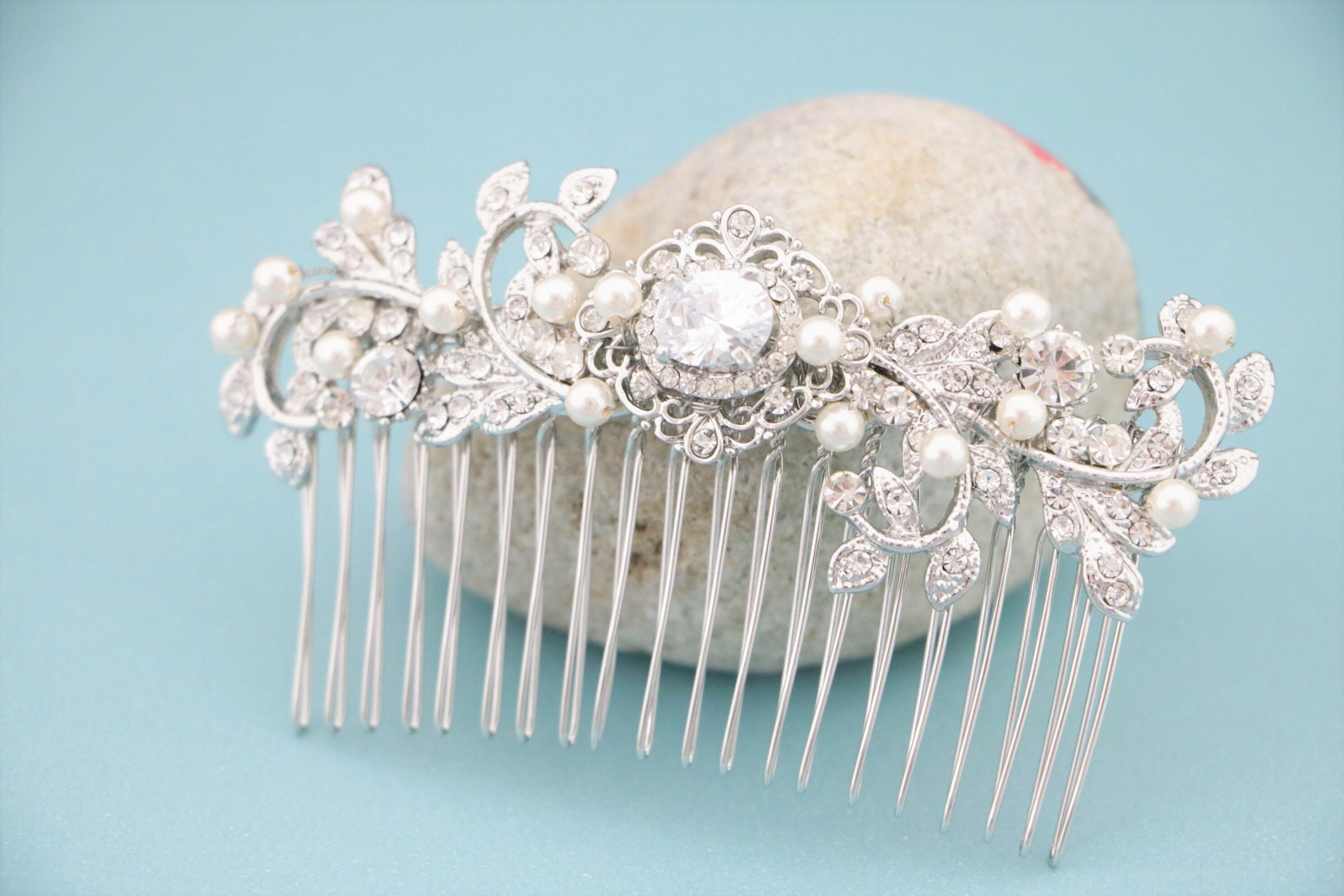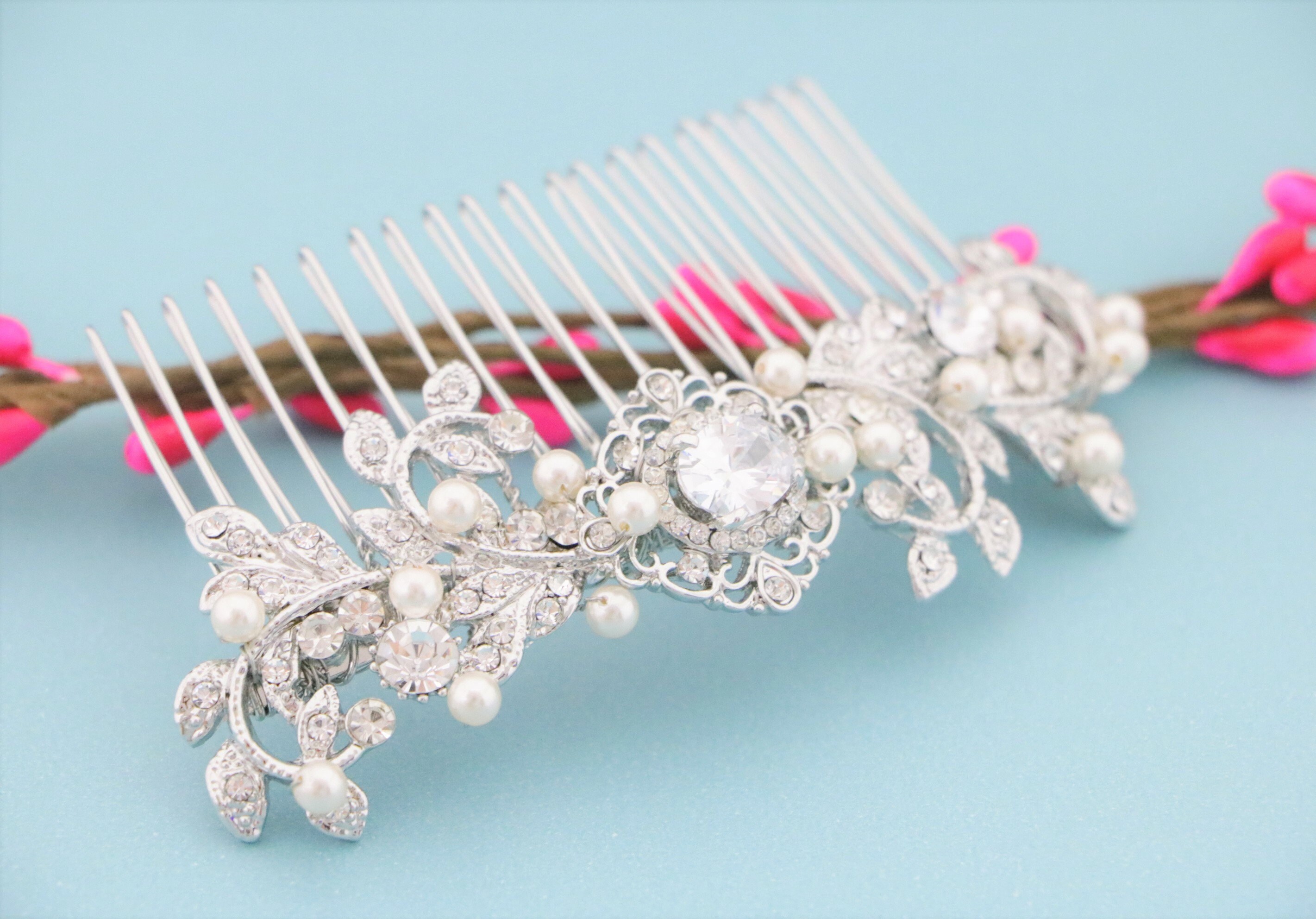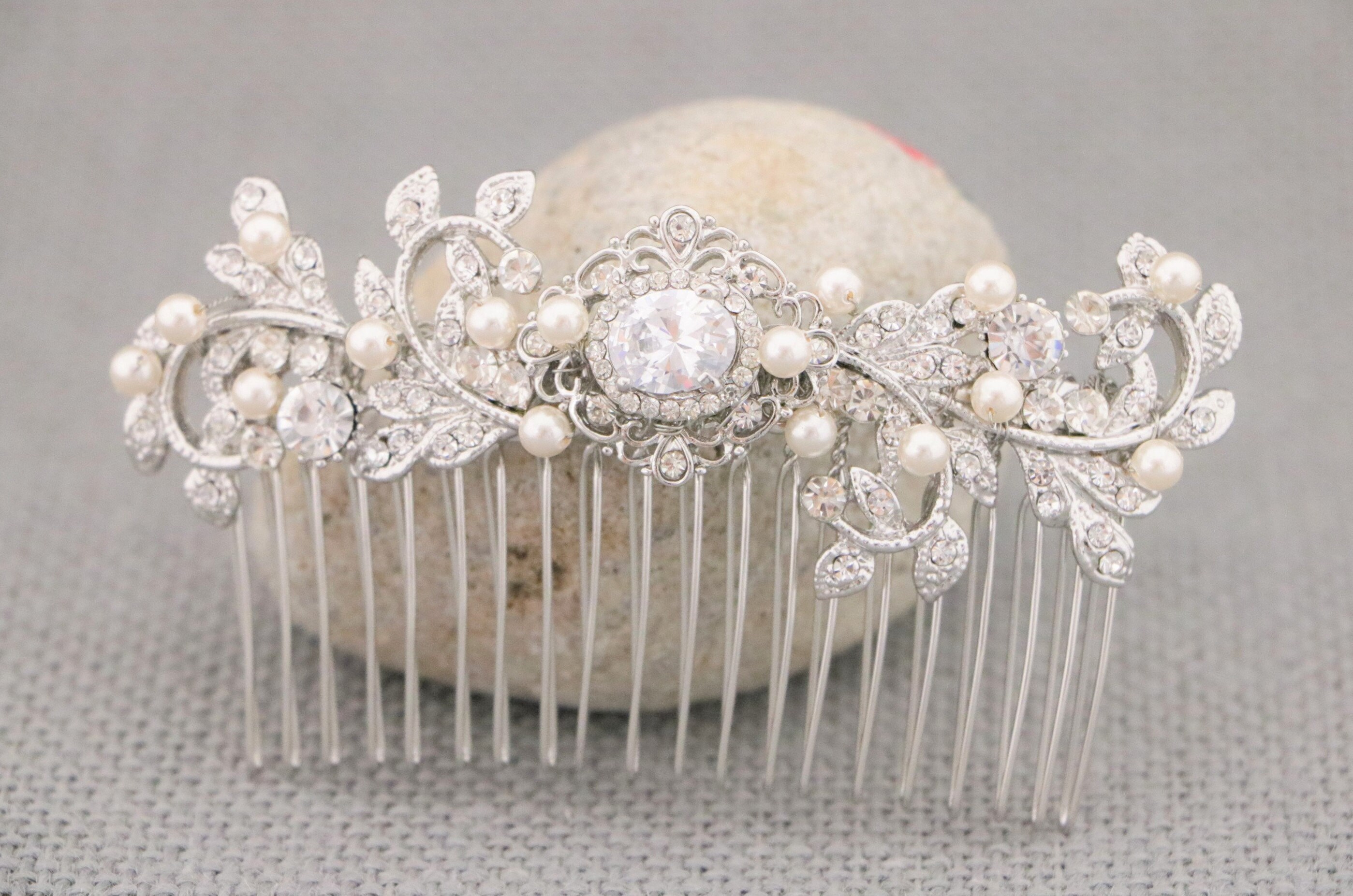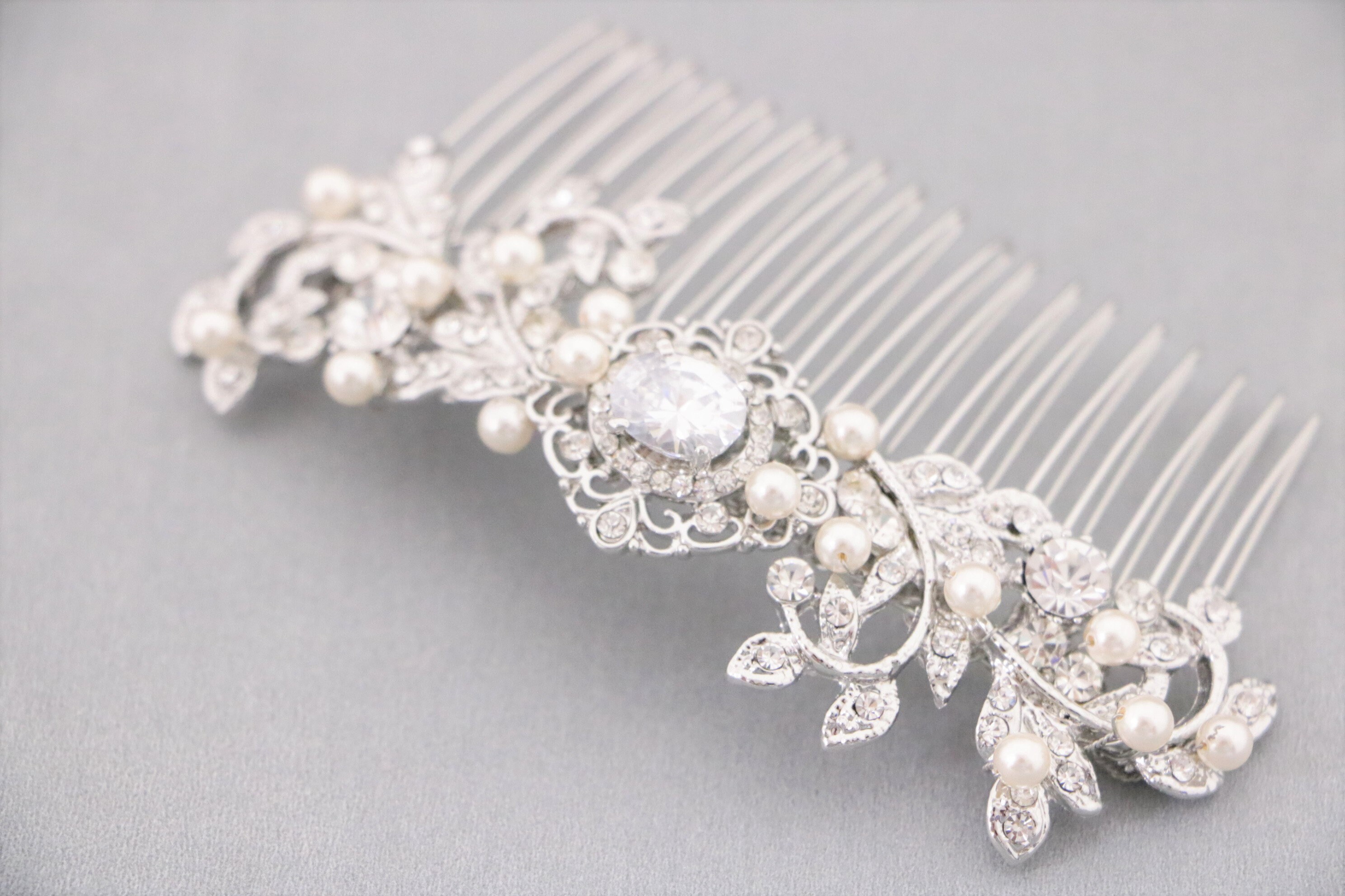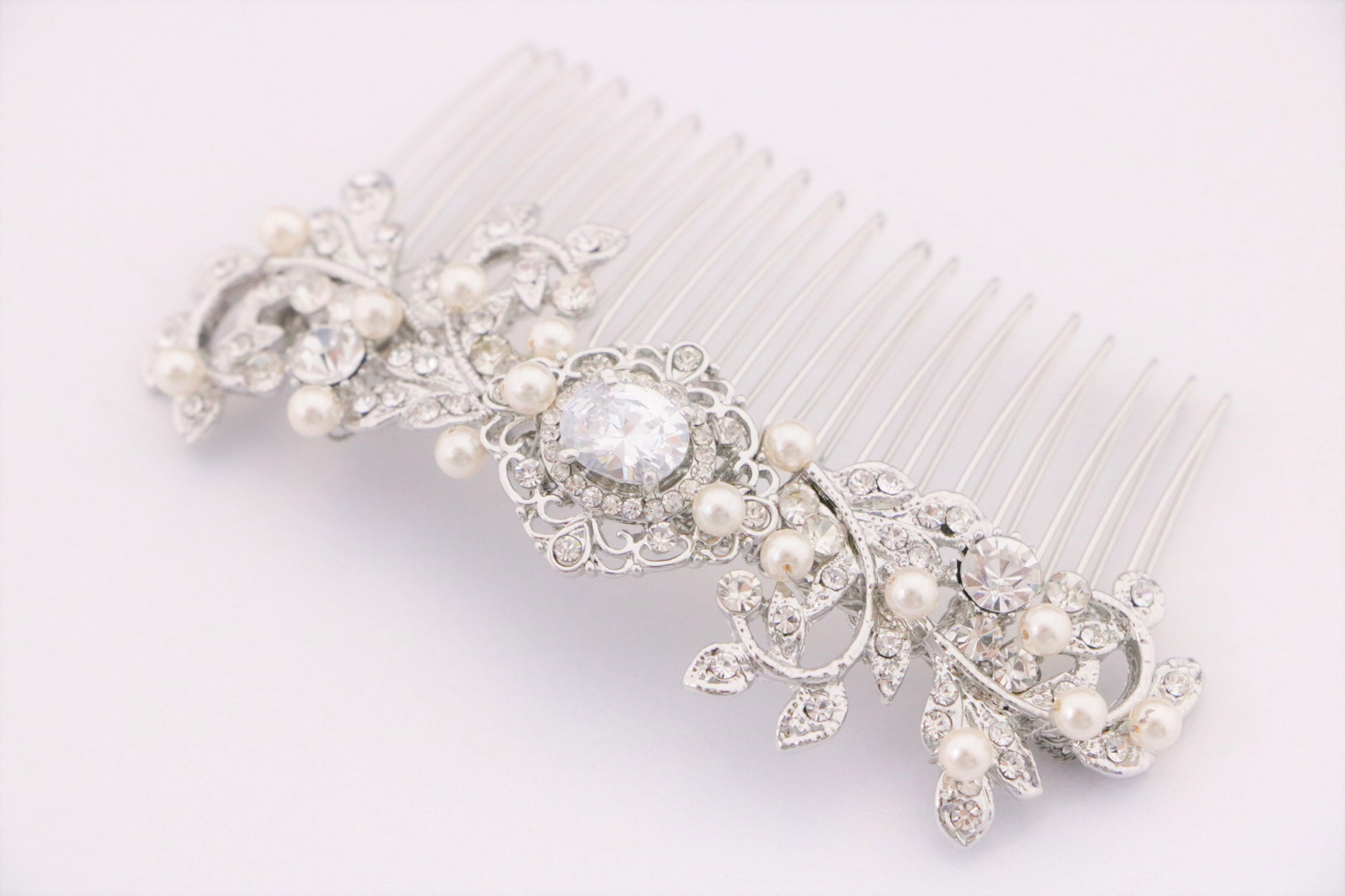 This sparkle rhinestone hair comb features a very beautiful vintage style rhinestone piece and swarovski ivory pearls. Rhinestone piece and pearls are wired on a silver tone metal comb. The rhinestone part measures approximately 3.5 X 1 inches.