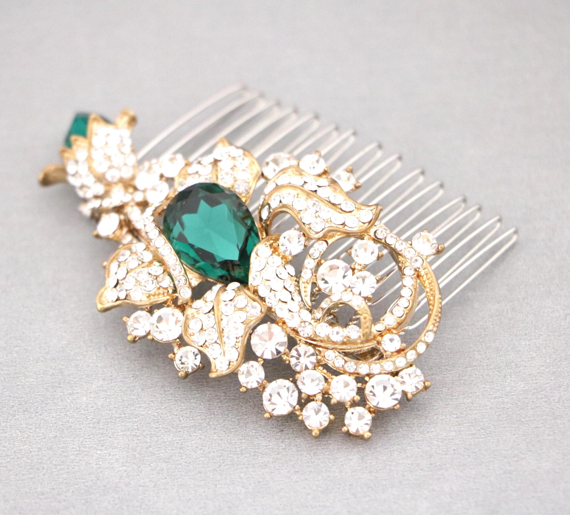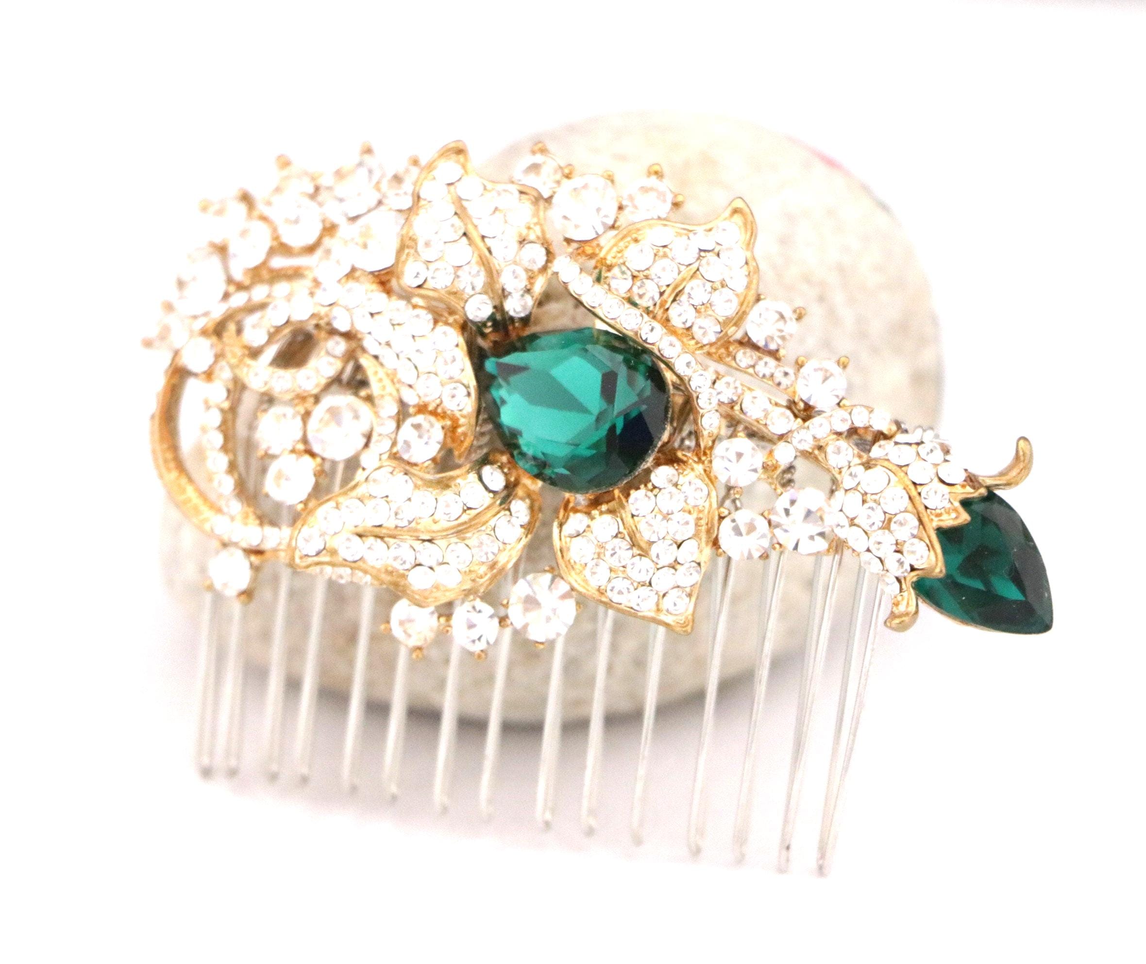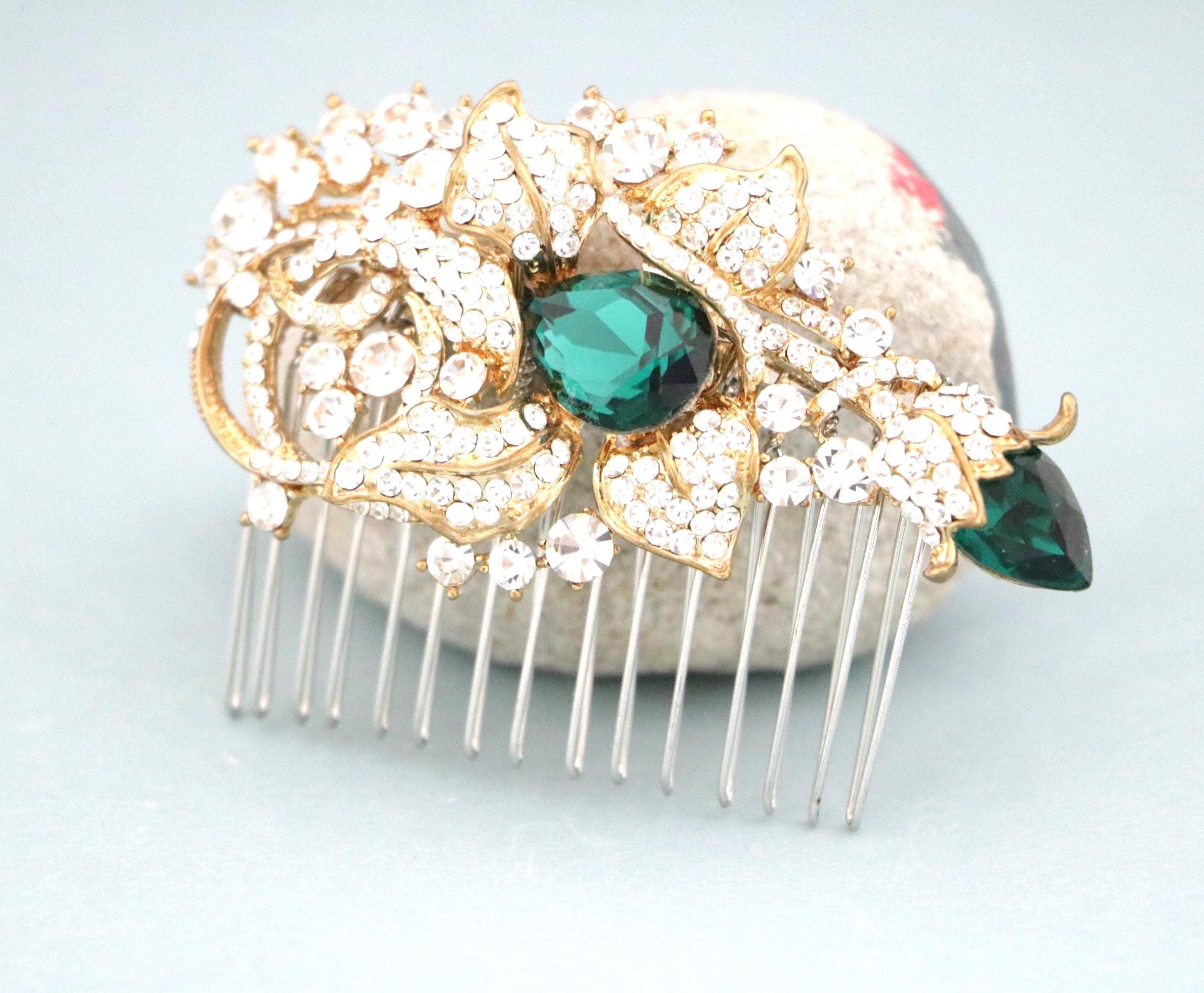 This beautiful Clear rhinestone and Emerald Crystal hair comb is a perfect compliment for the wedding party and can easily fit into any hair style. The Rhinestone part measured approximately 3.25 X 1.75 inches.