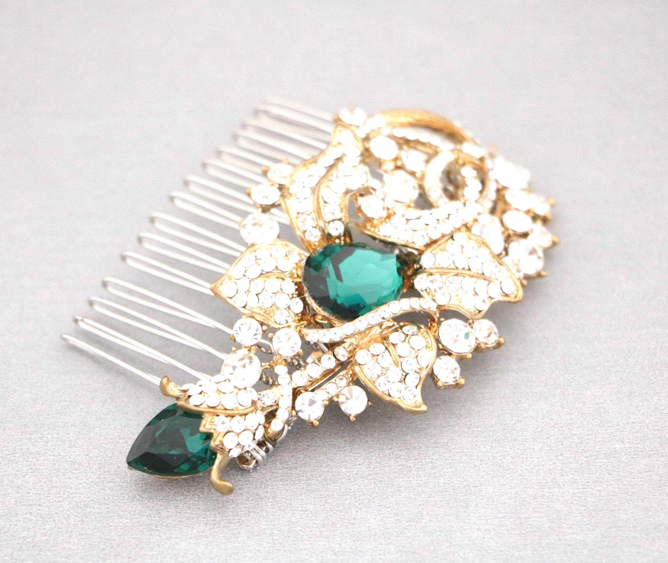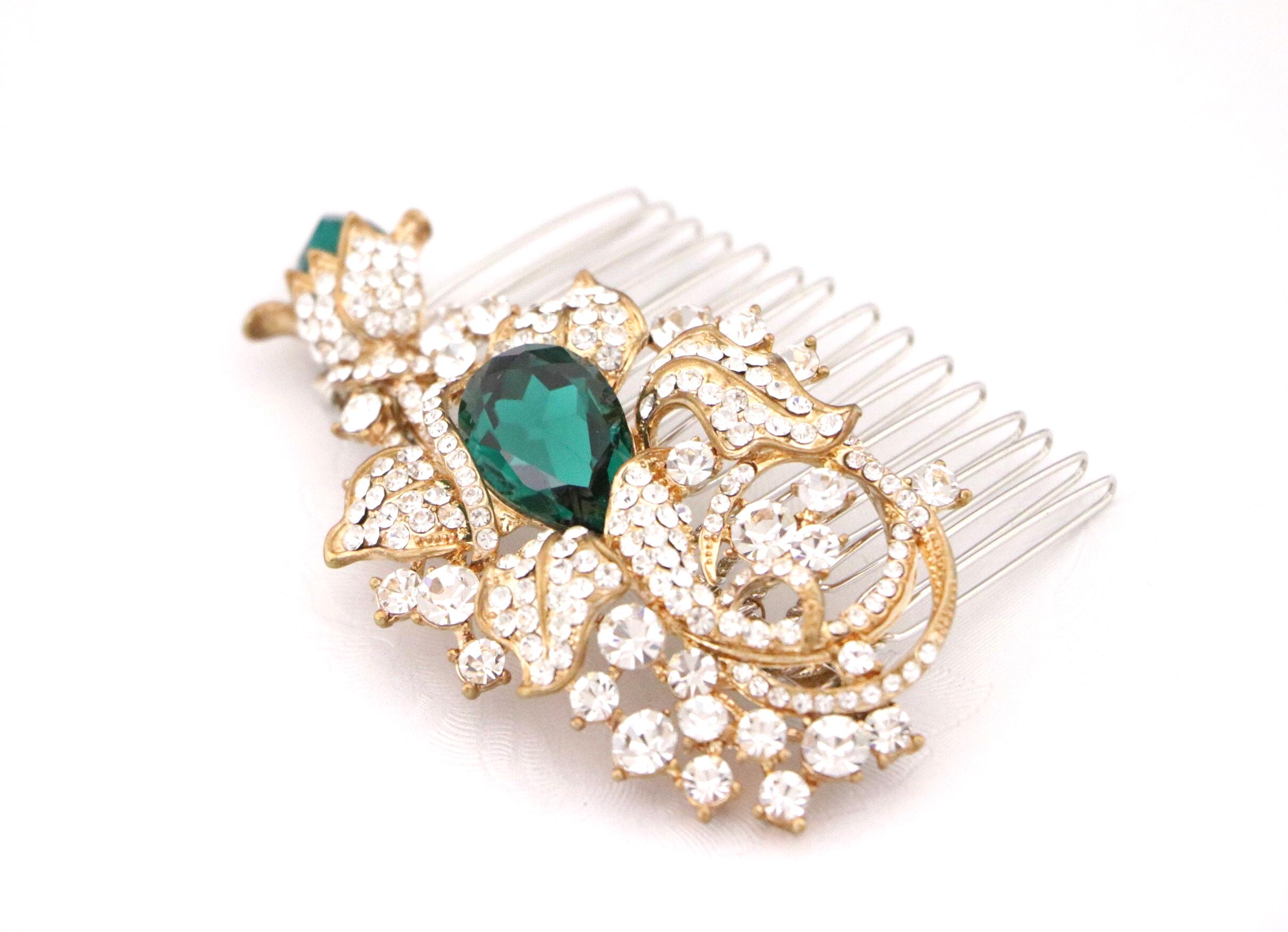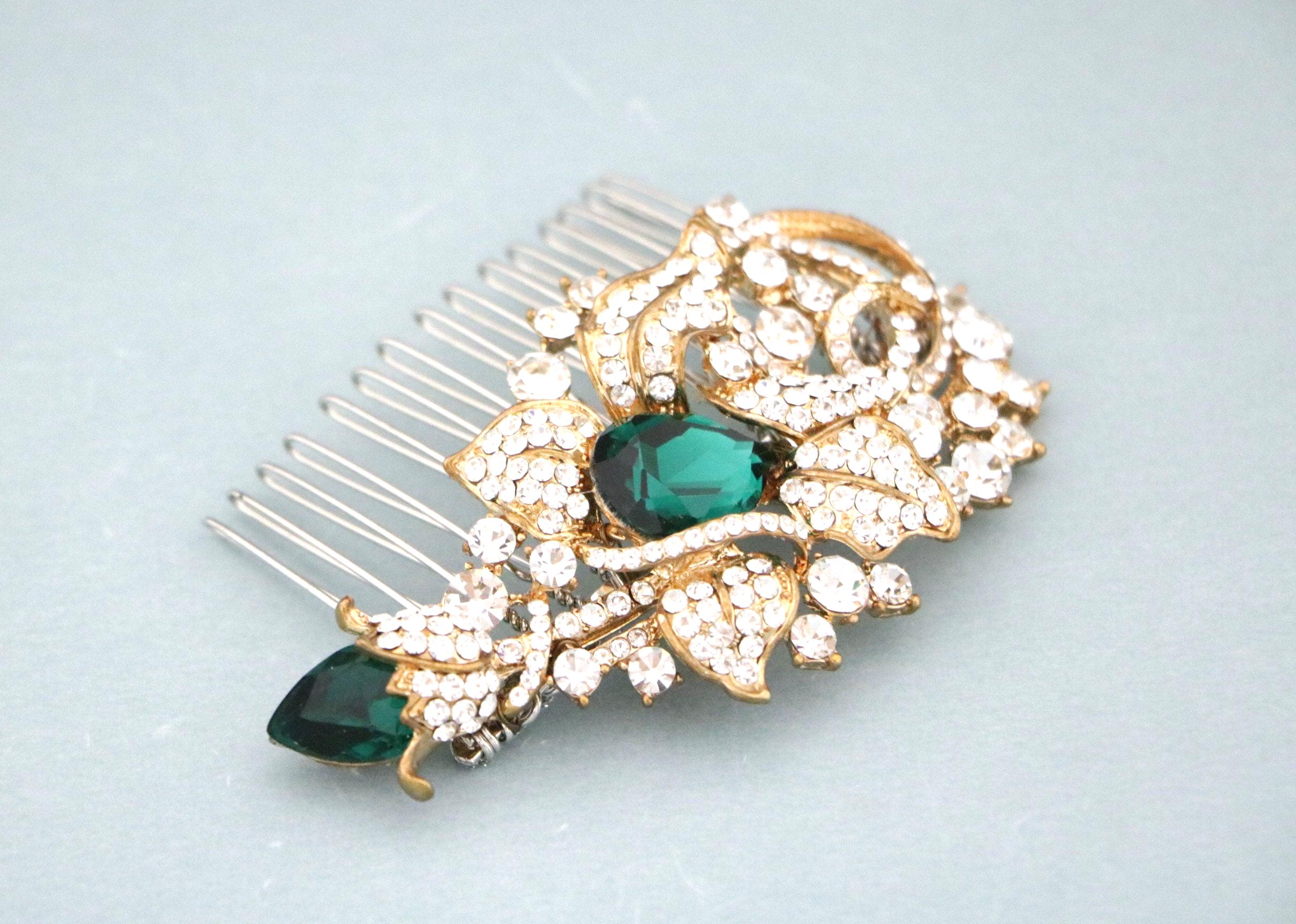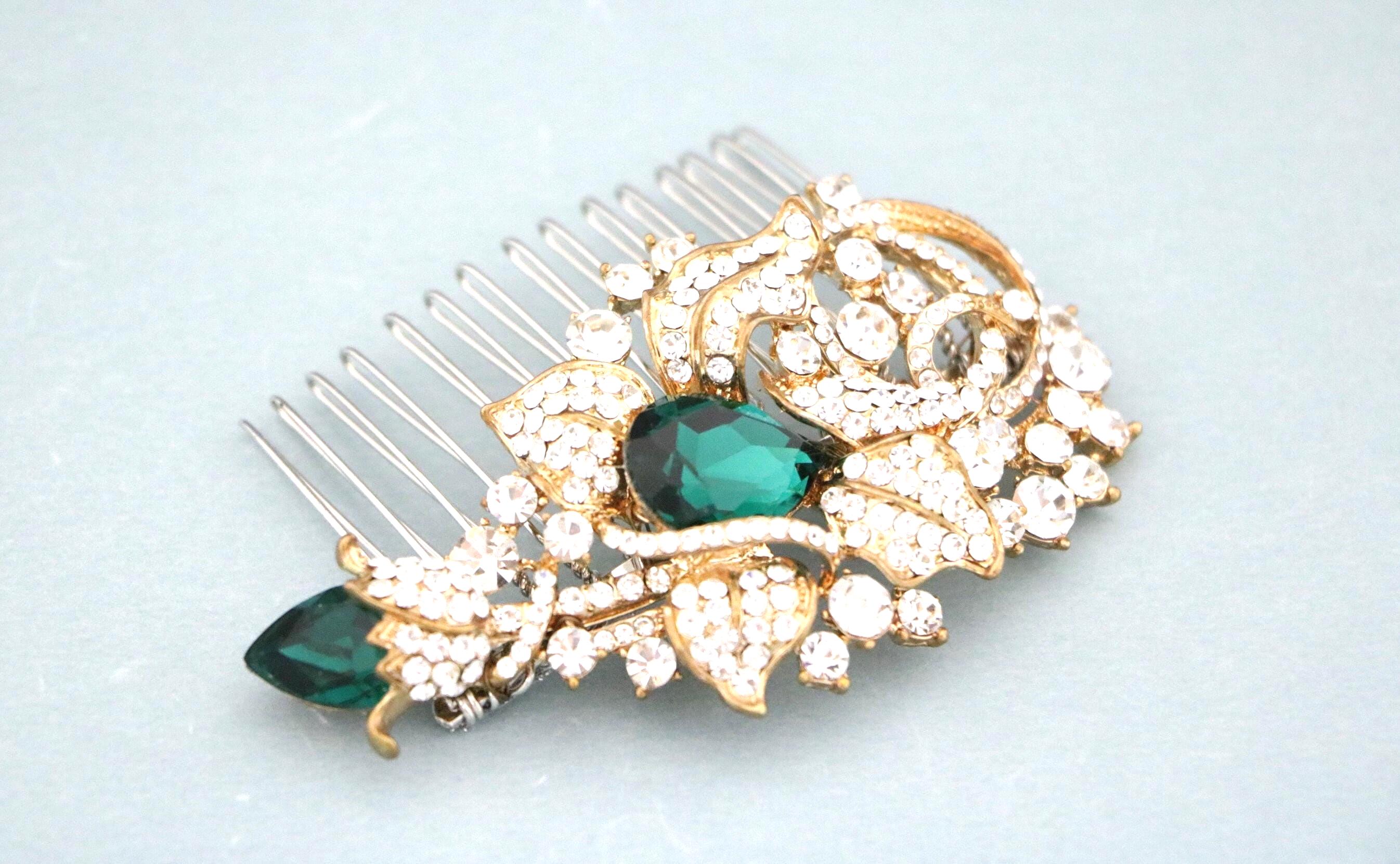 This beautiful Clear rhinestone and Emerald Crystal hair comb is a perfect compliment for the wedding party and can easily fit into any hair style. The Rhinestone part measured approximately 3.25 X 1.75 inches.