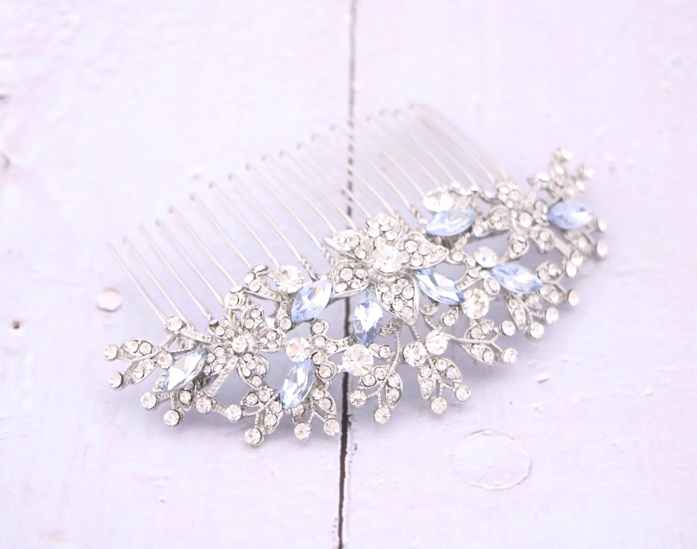 This beautiful Clear rhinestone and Sapphire crystal hair comb is a perfect compliment for the wedding party and can easily fit into any hair style. The Rhinestone part measured approximately 4 X 1.75 inches. and the comb is approximately 3 inches wide.