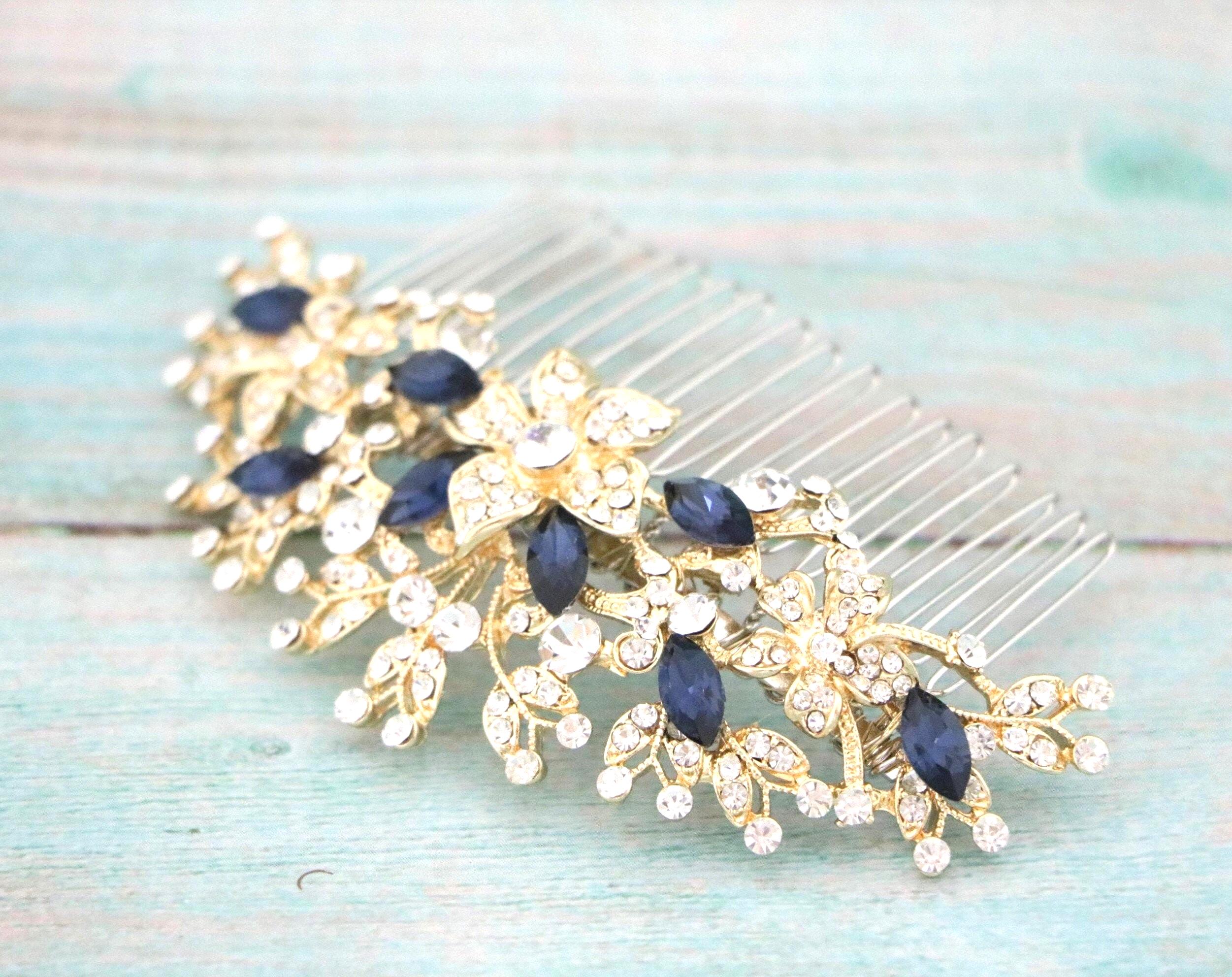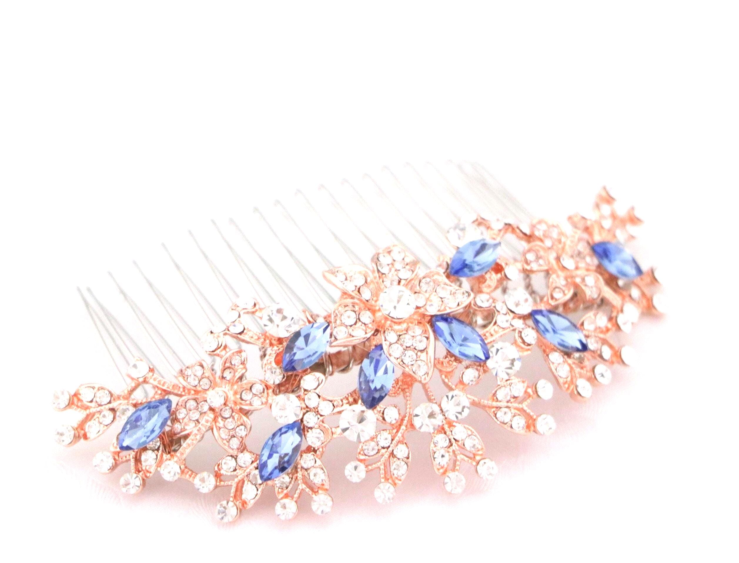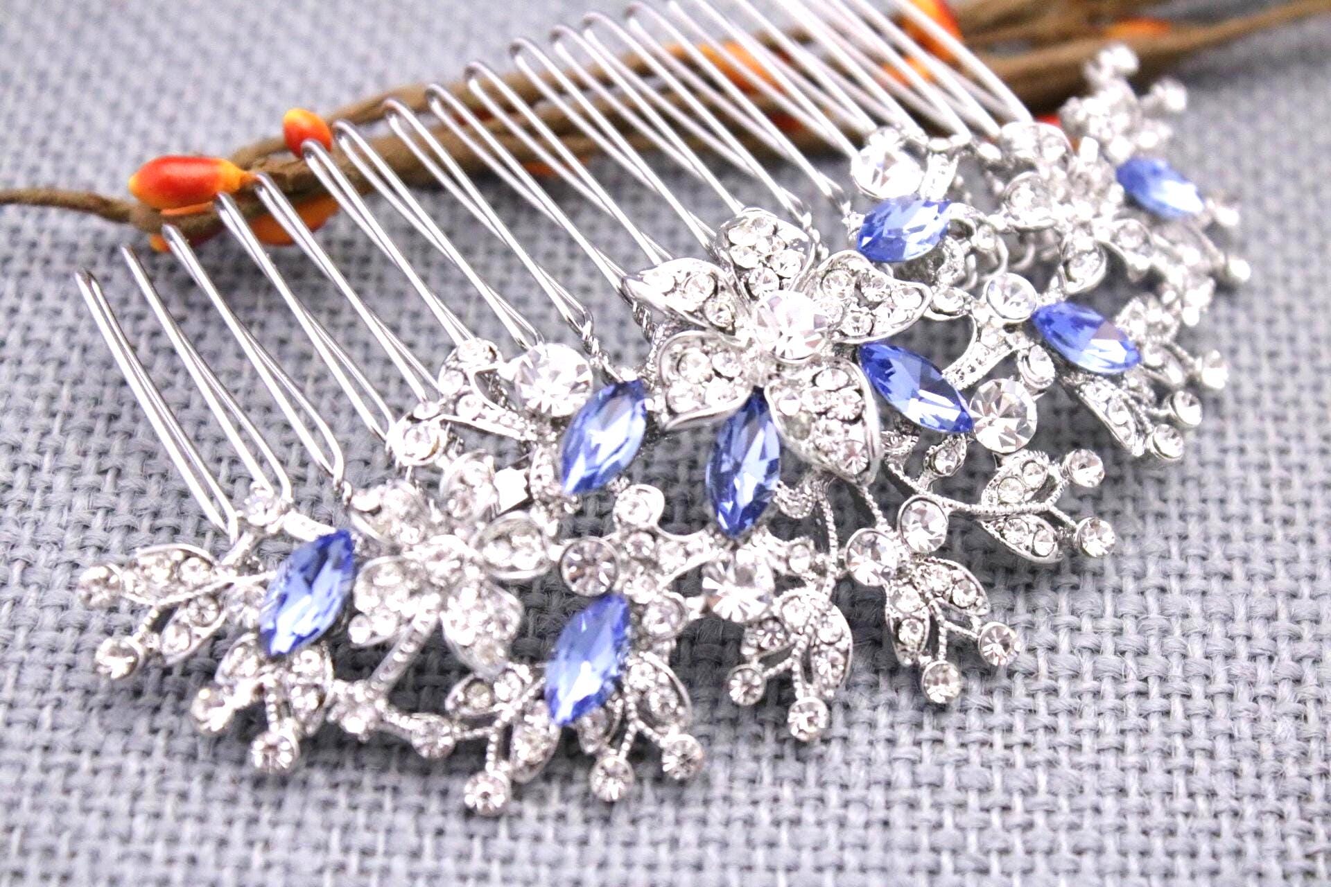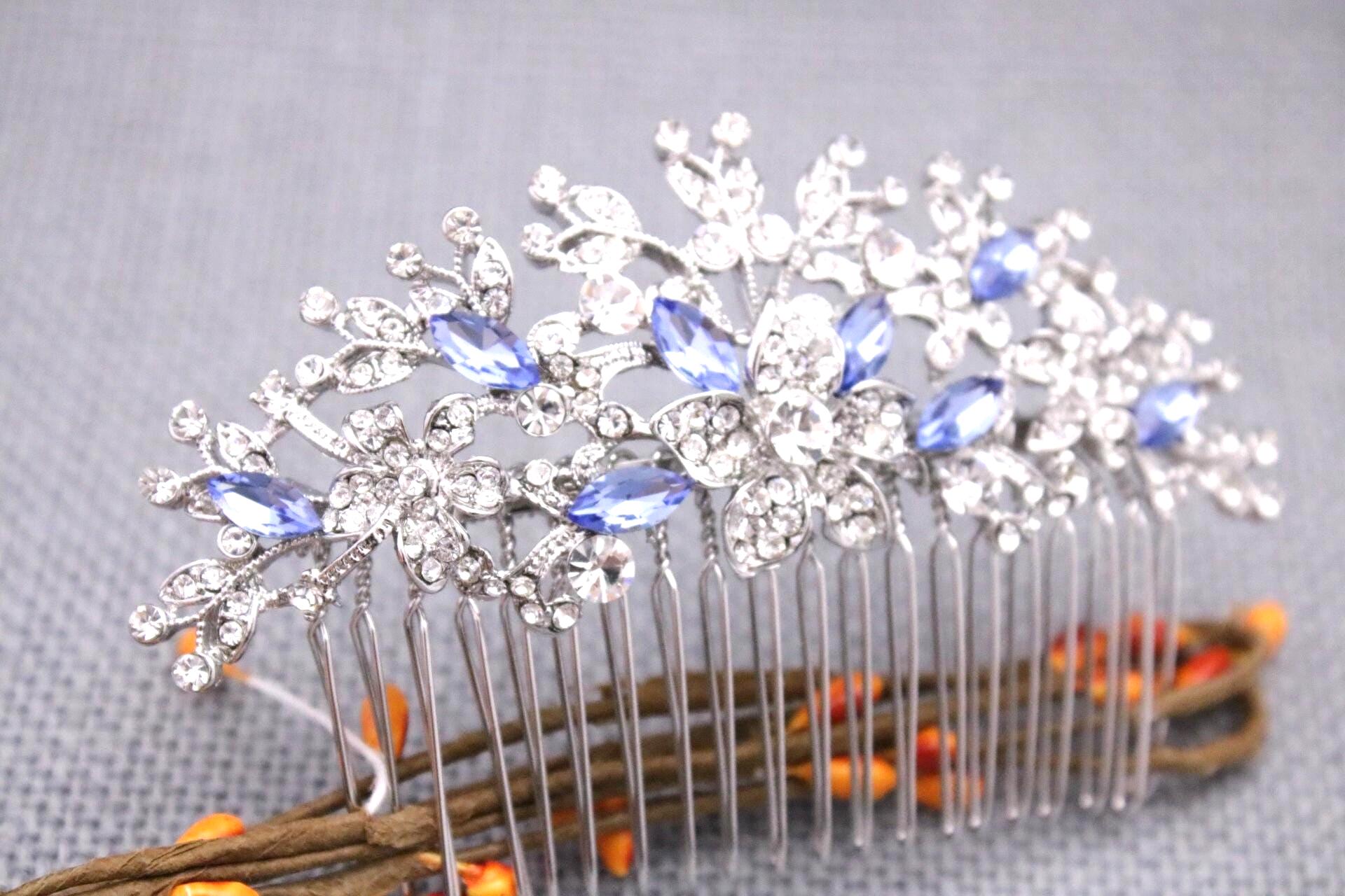 This beautiful Clear rhinestone and Sapphire crystal hair comb is a perfect compliment for the wedding party and can easily fit into any hair style. The Rhinestone part measured approximately 4 X 1.75 inches. and the comb is approximately 3 inches wide.