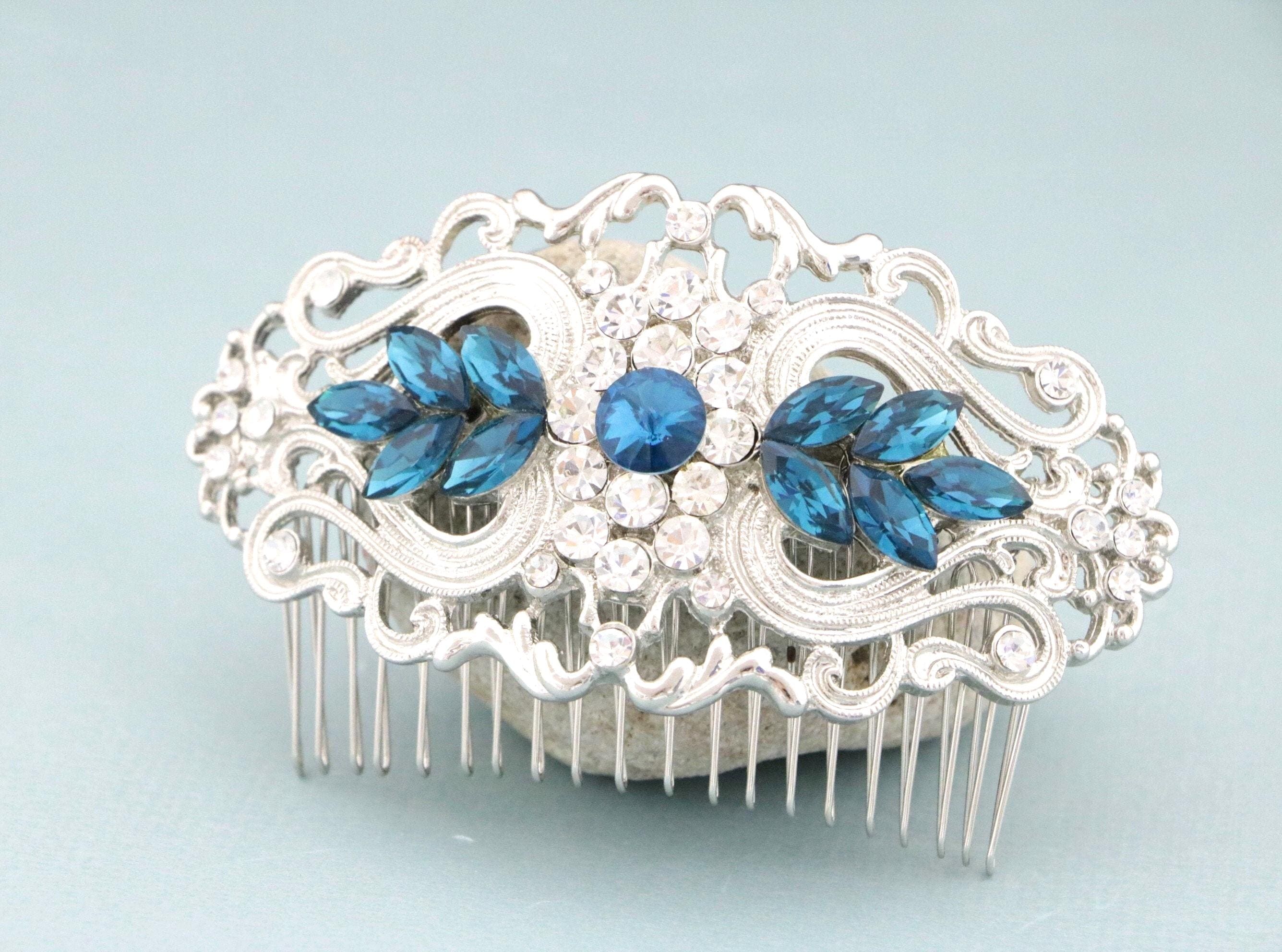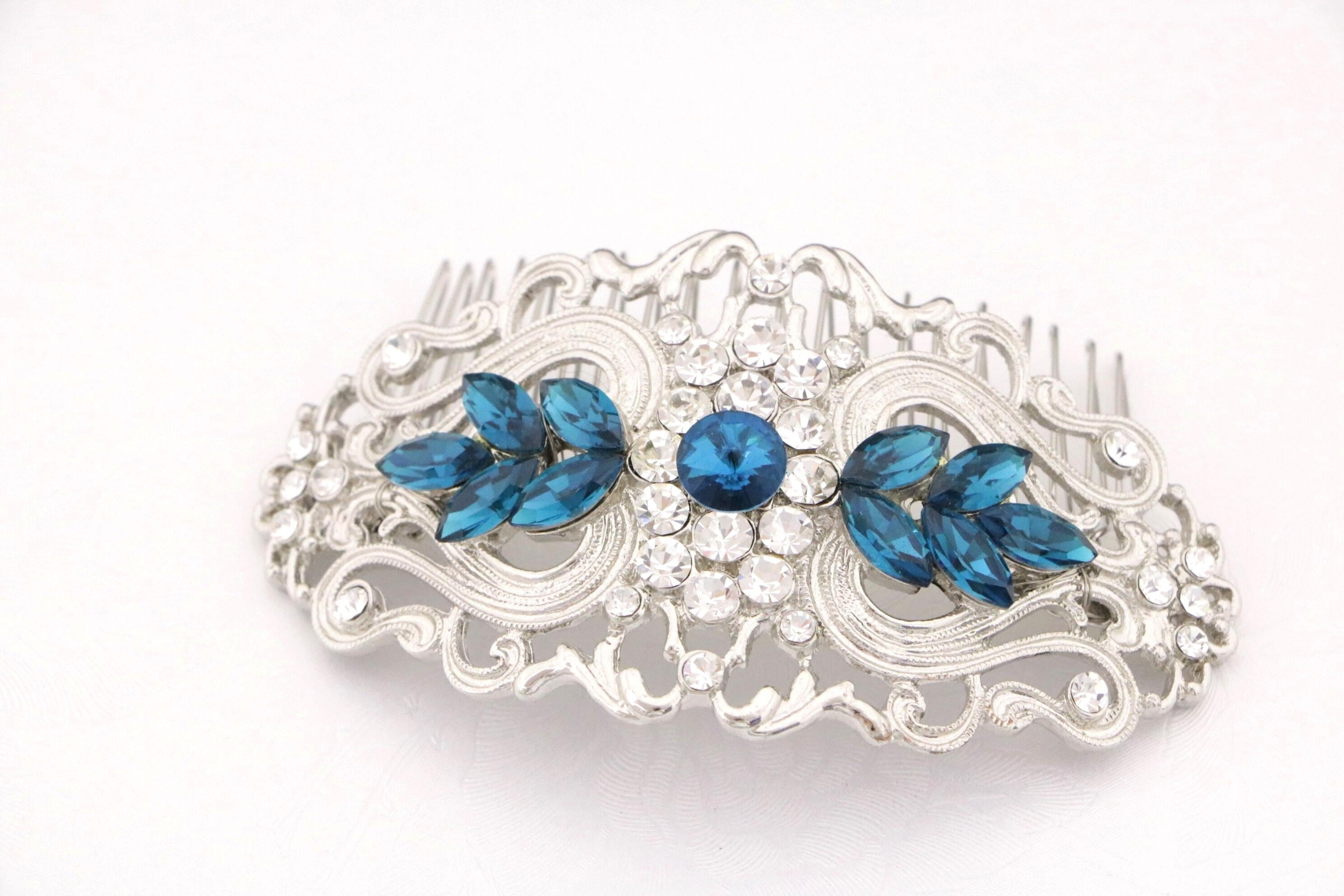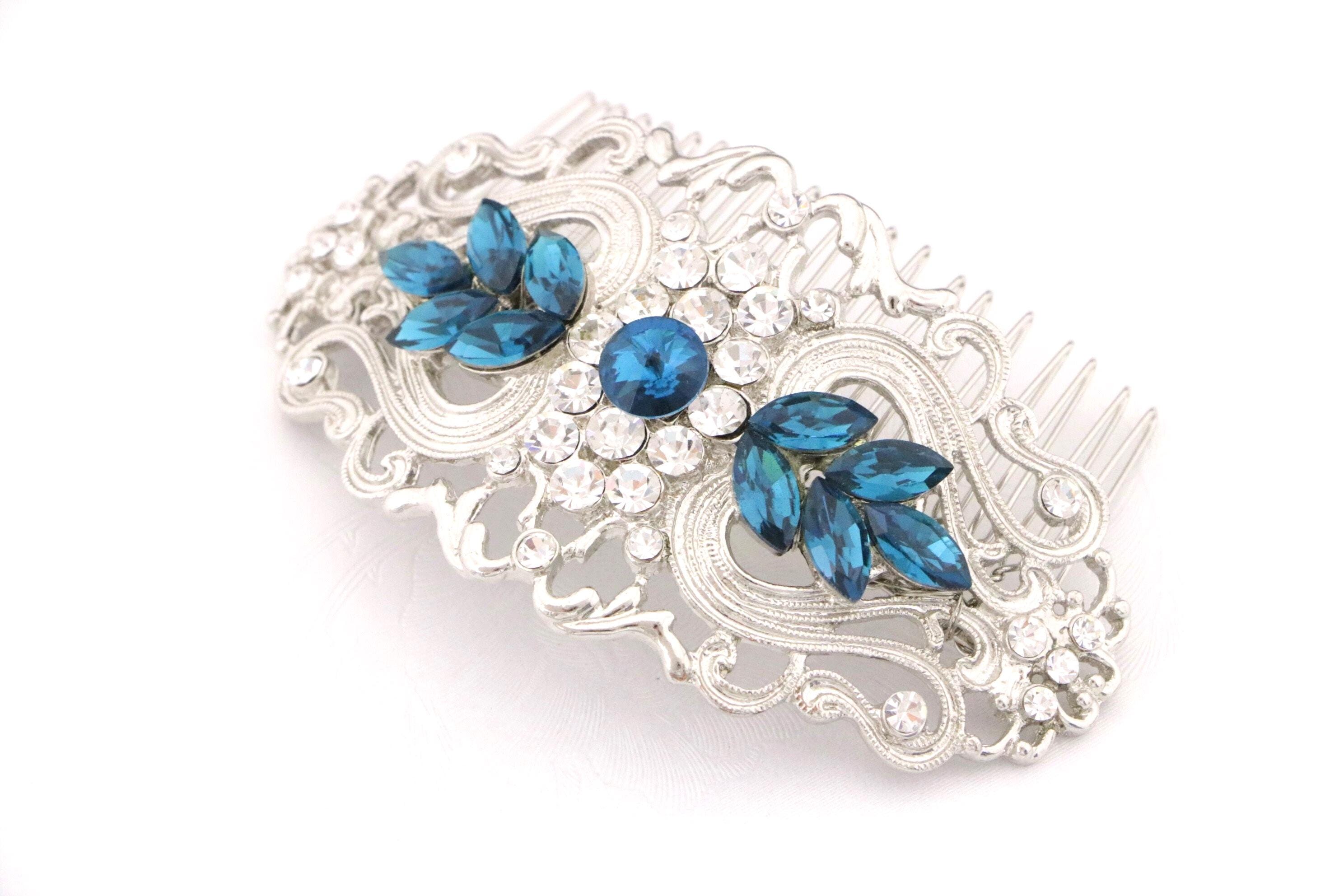 This beautiful Clear rhinestone and Indicolite crystal hair comb is a perfect compliment for the wedding party and can easily fit into any hair style. The Rhinestone part measured approximately 4.25 X 2 inches.