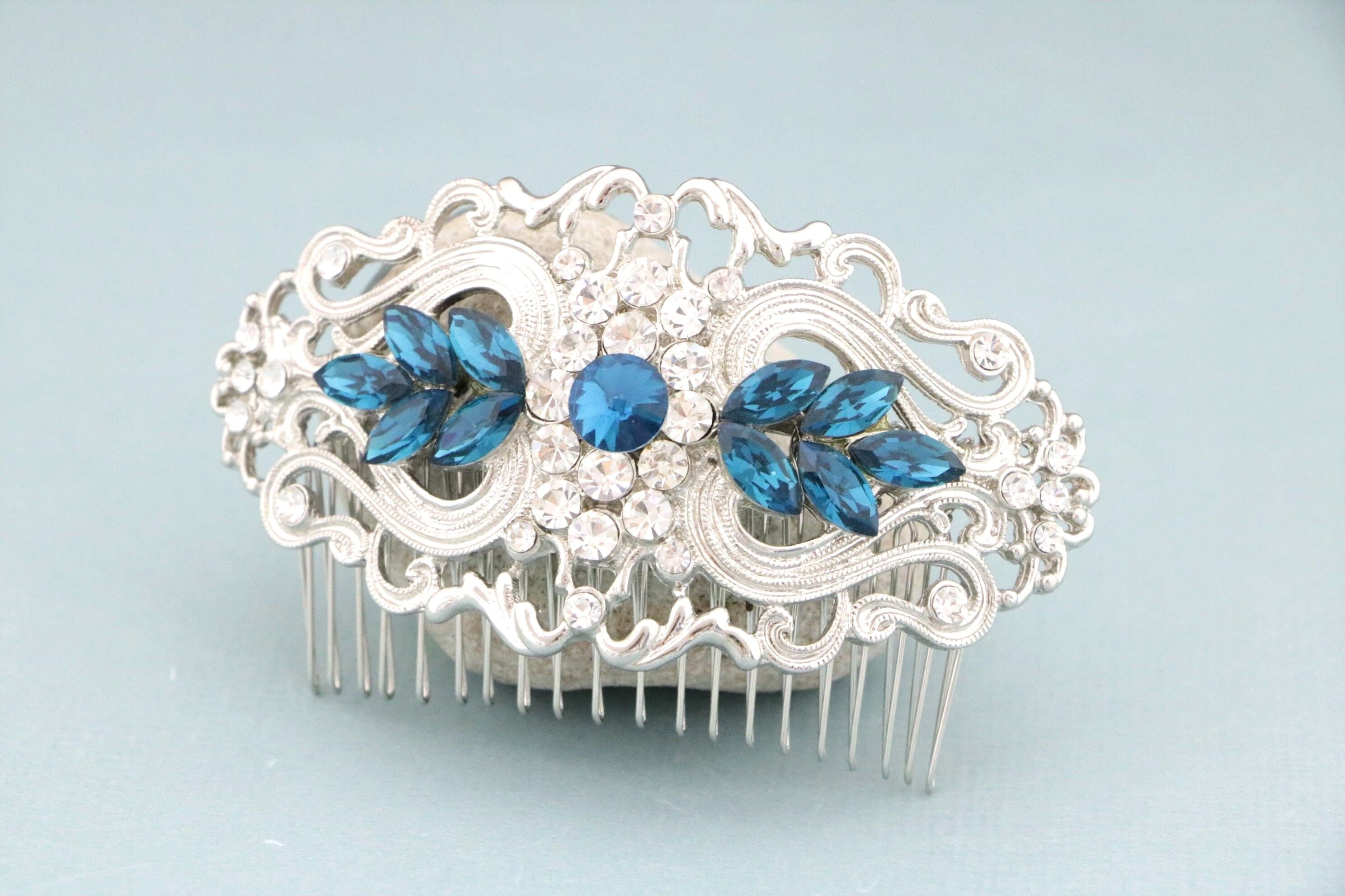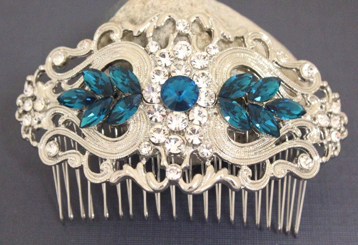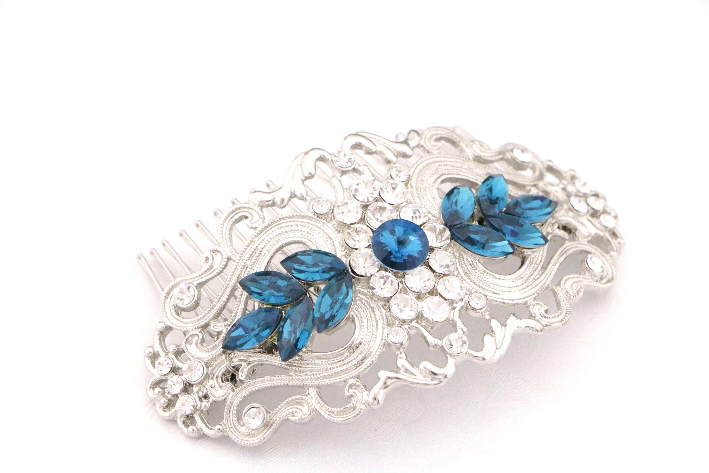 This beautiful Clear rhinestone and Indicolite crystal hair comb is a perfect compliment for the wedding party and can easily fit into any hair style. The Rhinestone part measured approximately 4.25 X 2 inches.