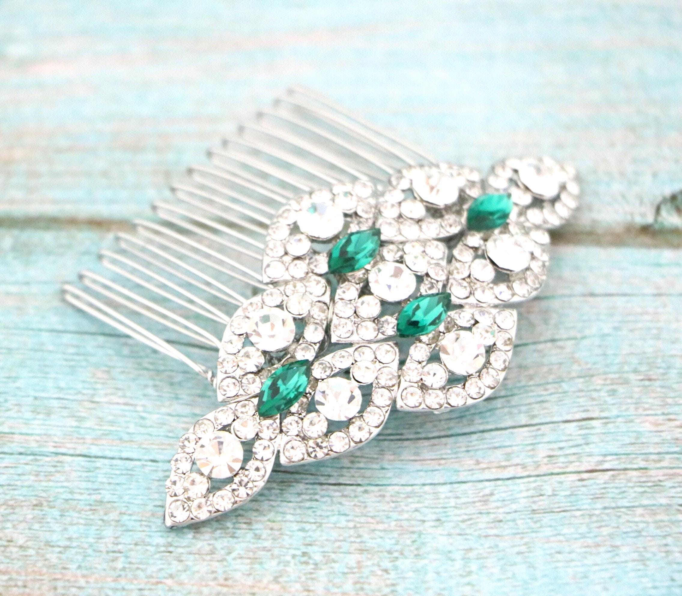 This beautiful Clear rhinestone and Emerald crystal hair comb is a perfect compliment for the wedding party and can easily fit into any hair style. The Rhinestone part measured approximately 3.5 X 1.5 inches. and the comb is approximately 2 inches wide.
