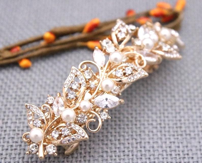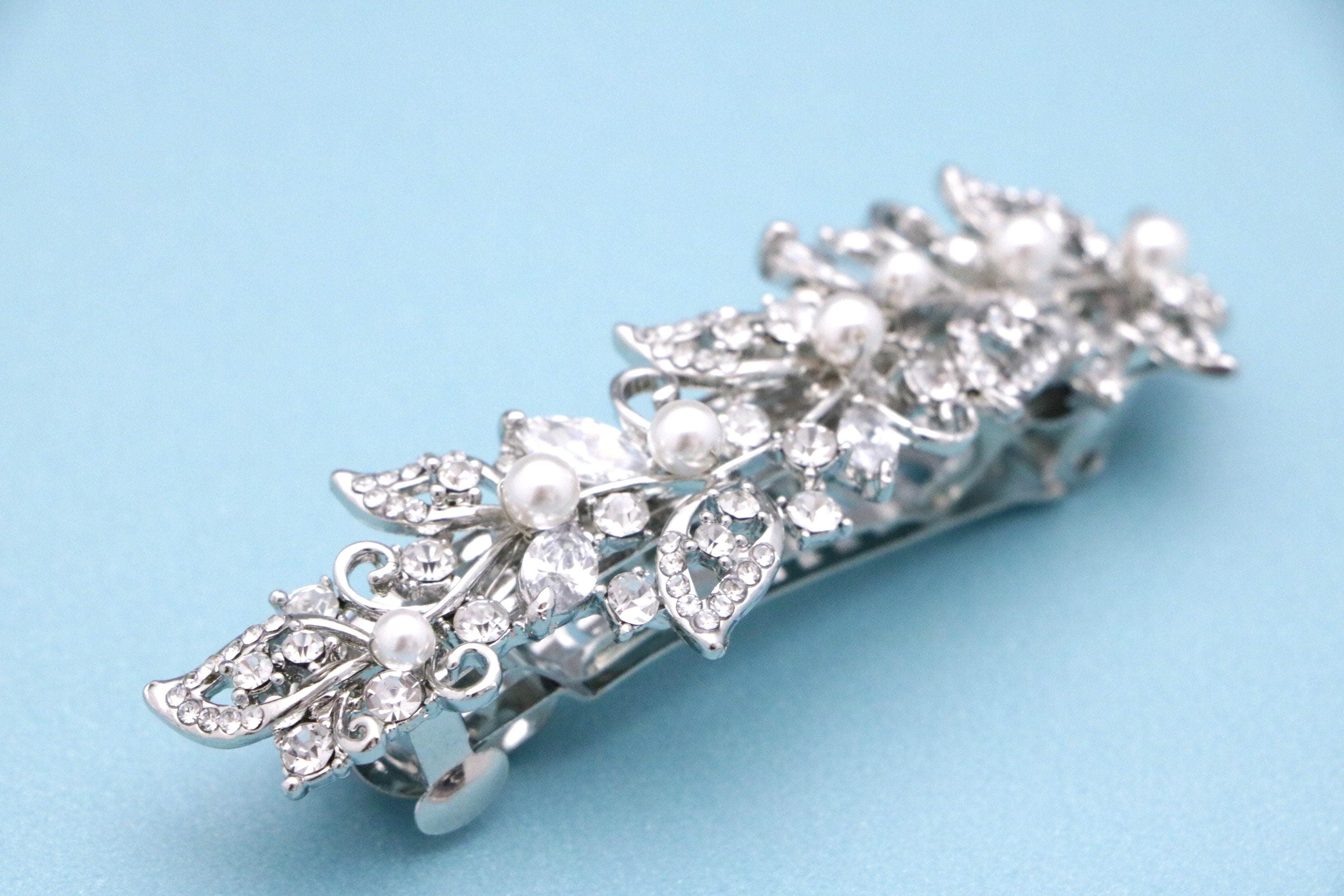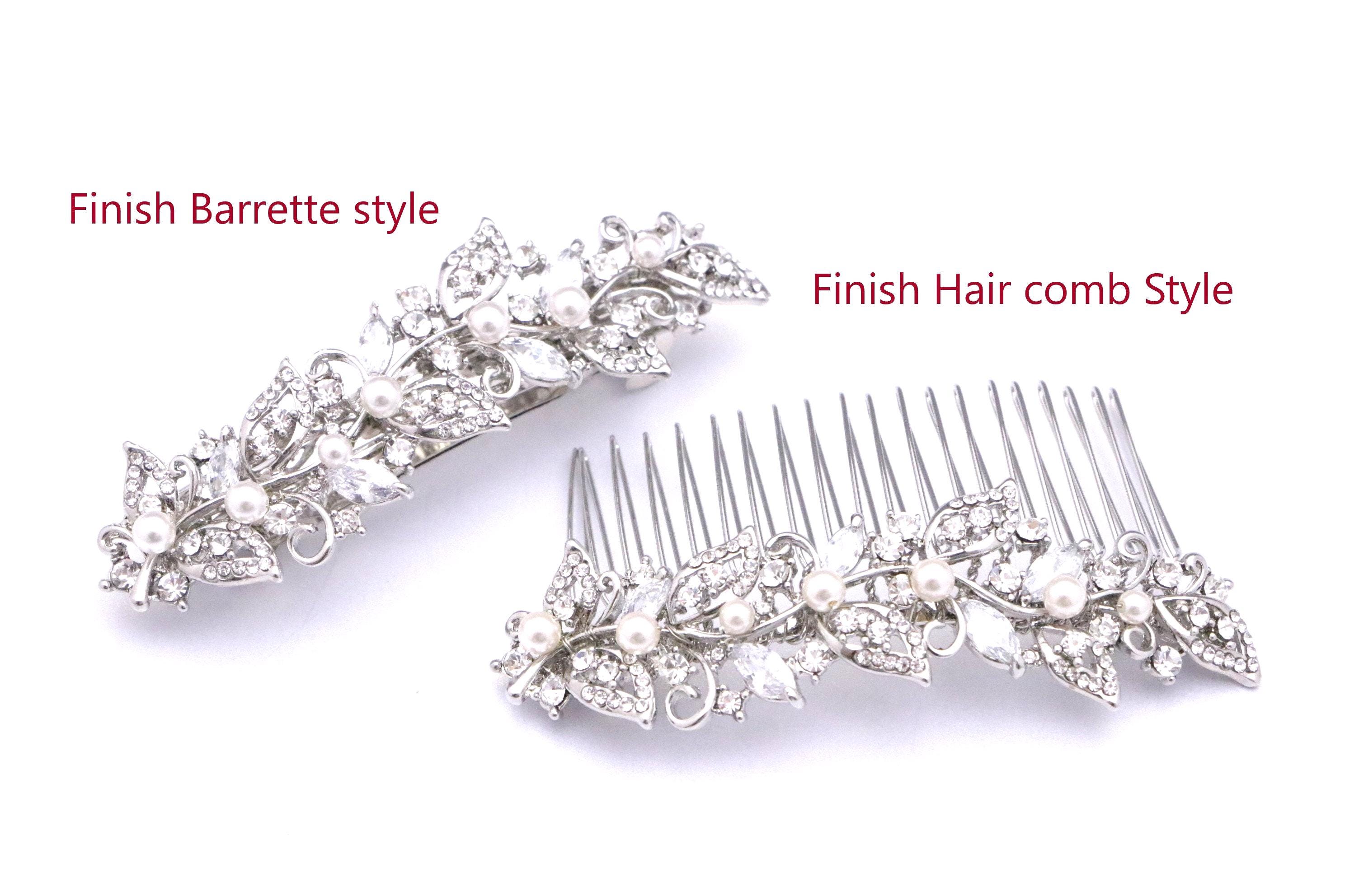 This sparkle rhinestone hair comb features a very beautiful vintage style rhinestone piece and Swarovski ivory pearls. Rhinestone piece and pearls are set it on a metal barrette or on a metal hair comb. The rhinestone part measures approximately 3.75 X 1 inches.