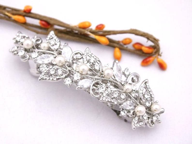 This sparkle rhinestone hair comb features a very beautiful vintage style rhinestone piece and swarovski ivory pearls. Rhinestone piece and pearls are set on a silver tone metal comb. The Rhinestone part measures approximately 3.75 X 1 inches.