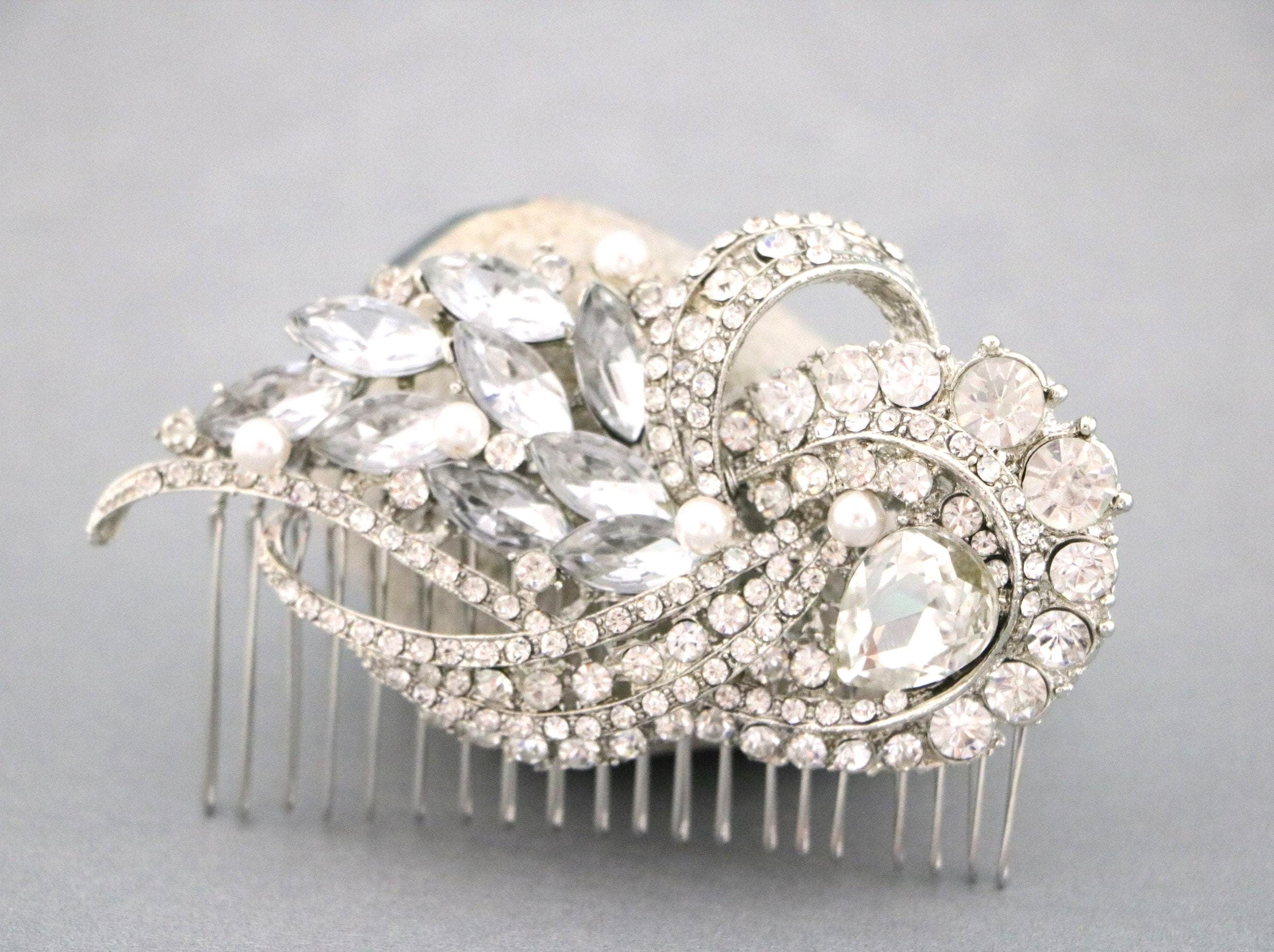 This sparkle rhinestone hair comb features a very beautiful vintage style rhinestone piece and Swarovski ivory pearls. Rhinestone piece and pearls are wired on a silver tone metal comb. The rhinestone part measures approximately 3.75 X 2 inches.