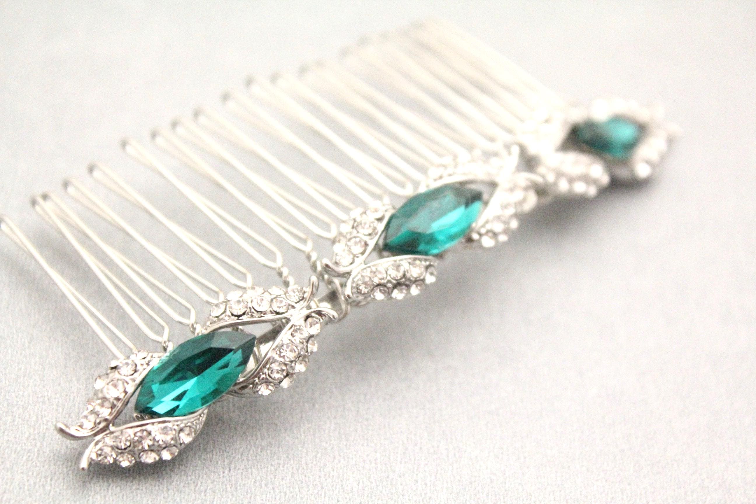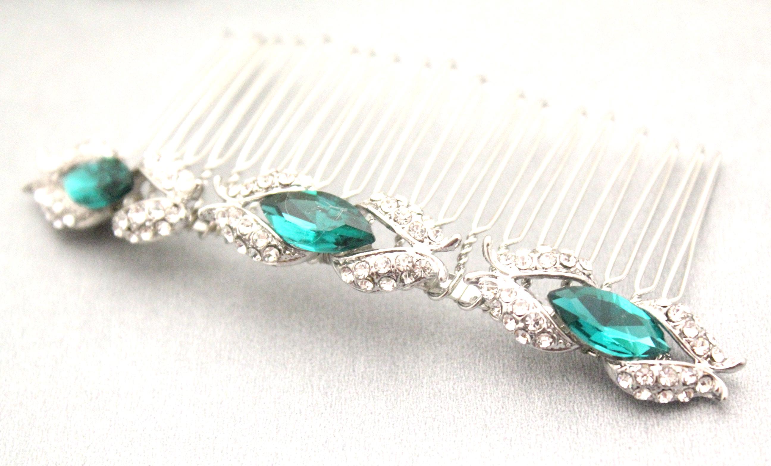 This beautiful Clear rhinestone and Emerald Crystal hair comb is a perfect compliment for the wedding party and can easily fit into any hair style.