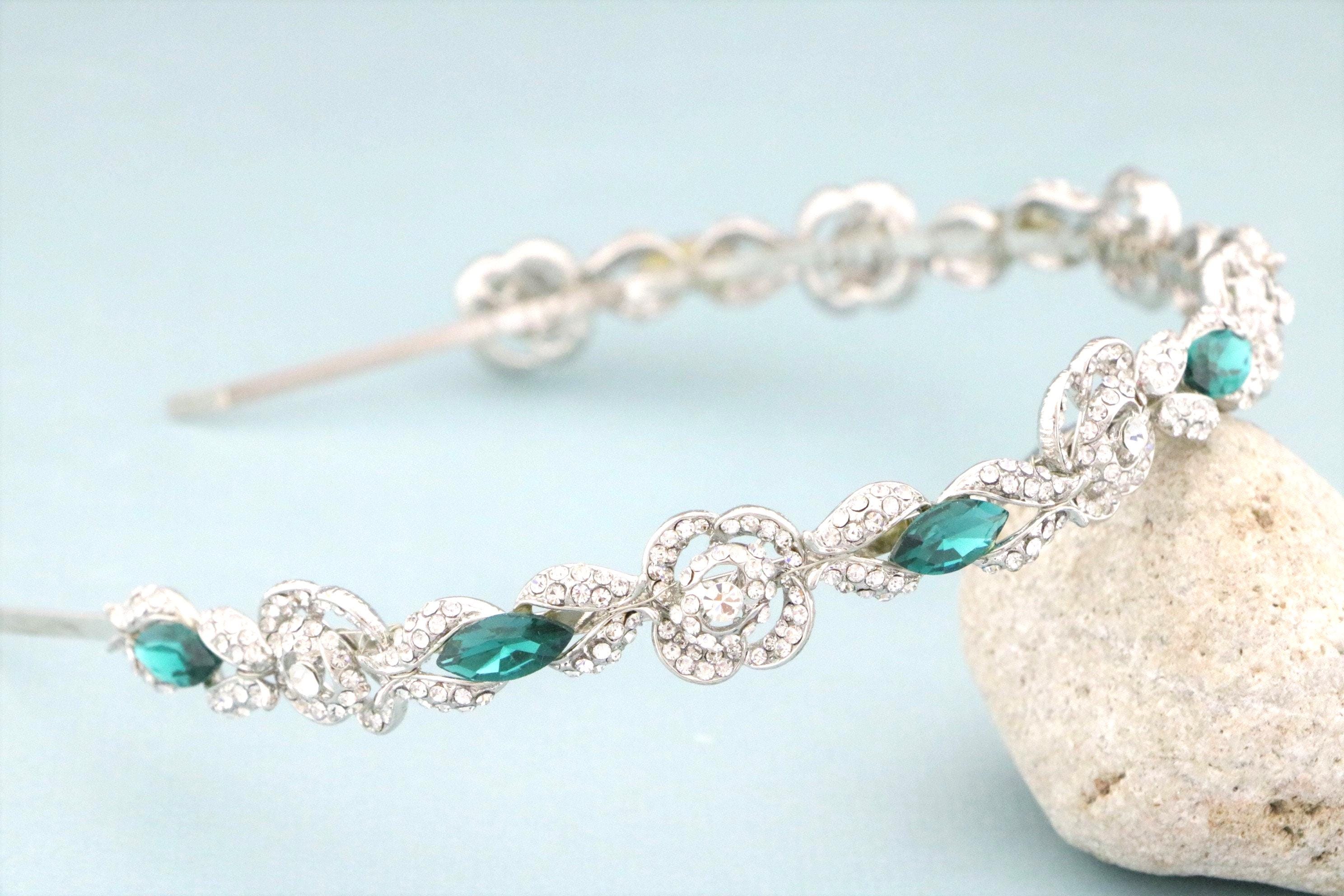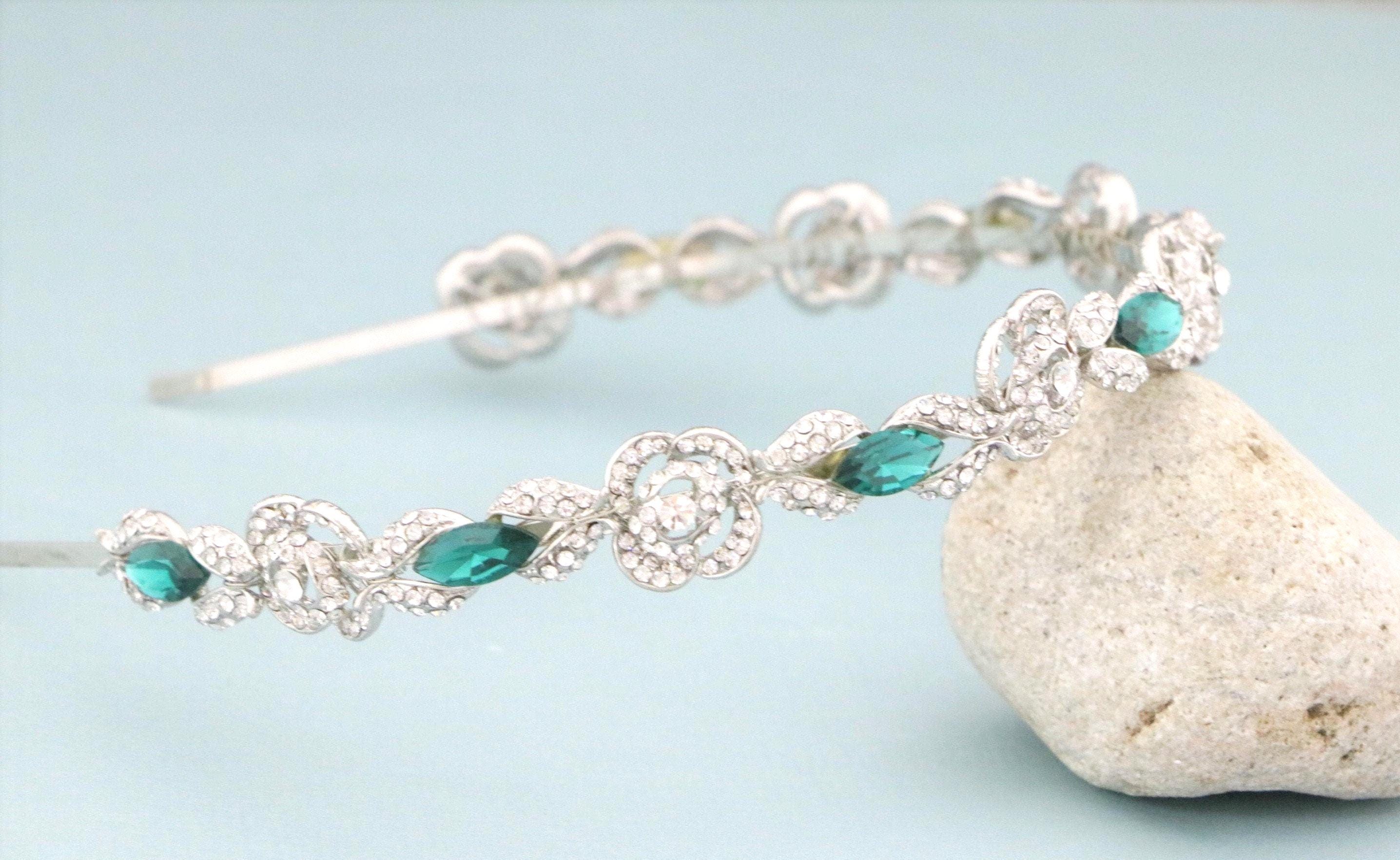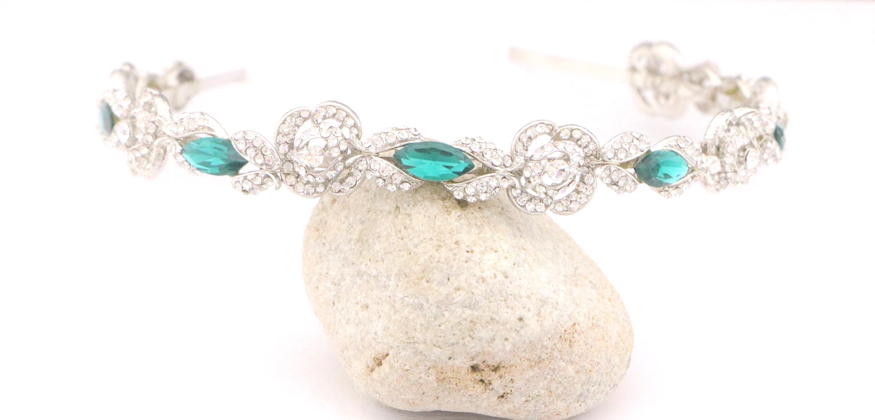 This beautiful Clear rhinestone and Emerald Crystal headband is a perfect compliment for the wedding party and can easily fit into any hair style.