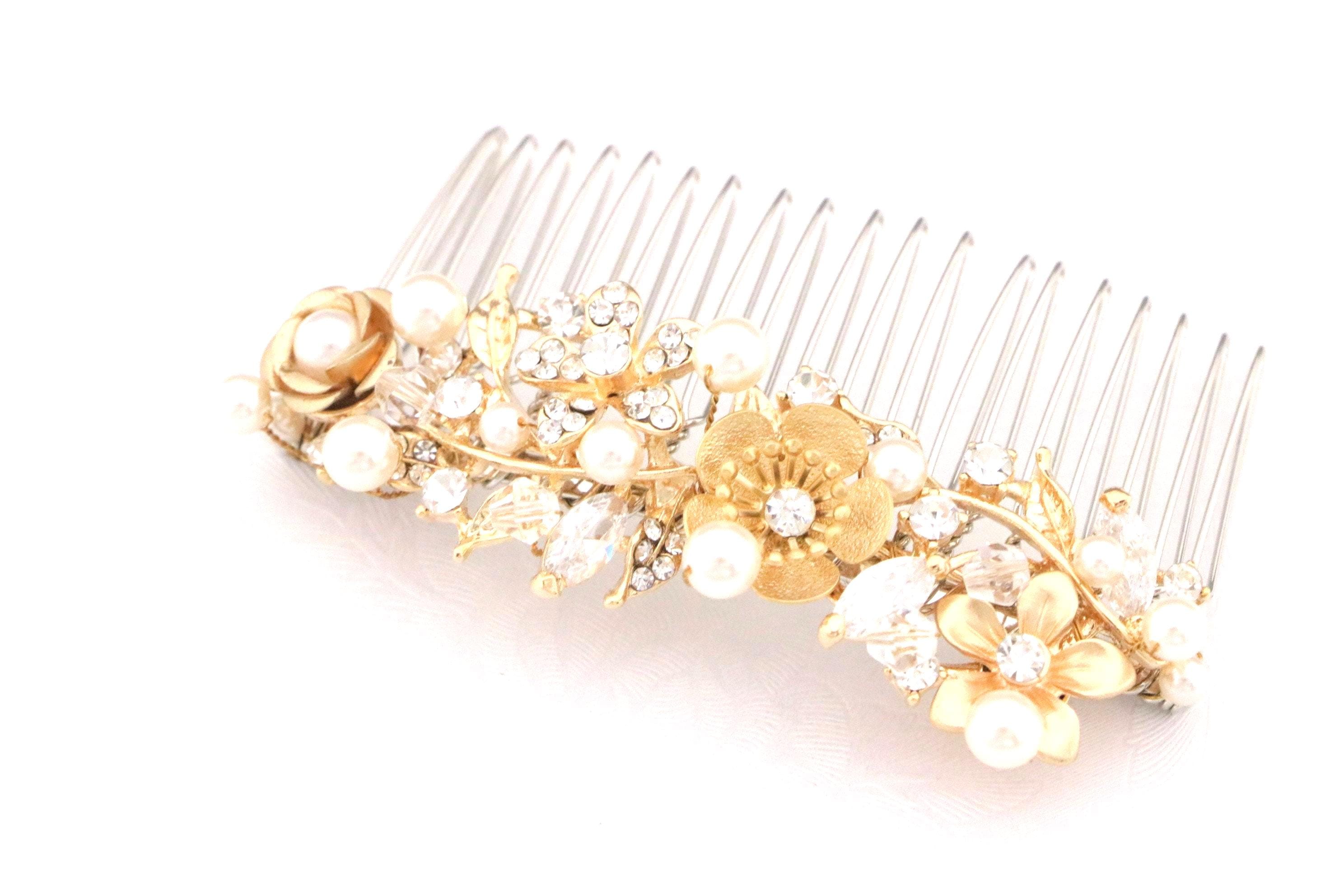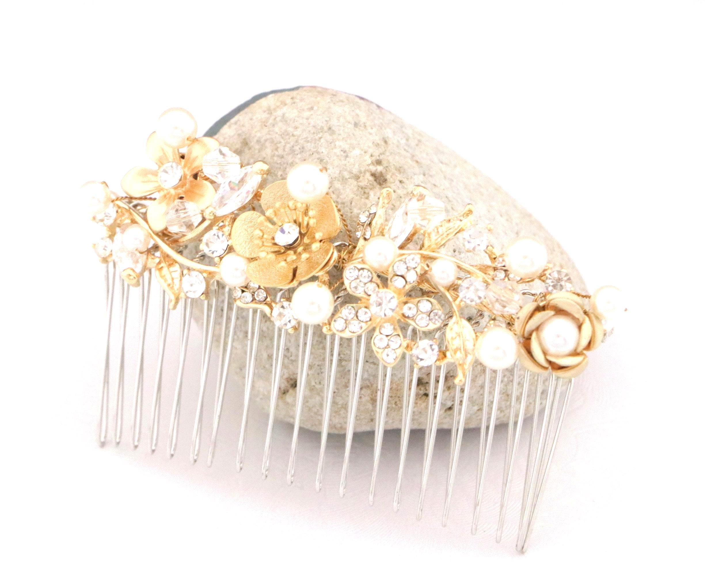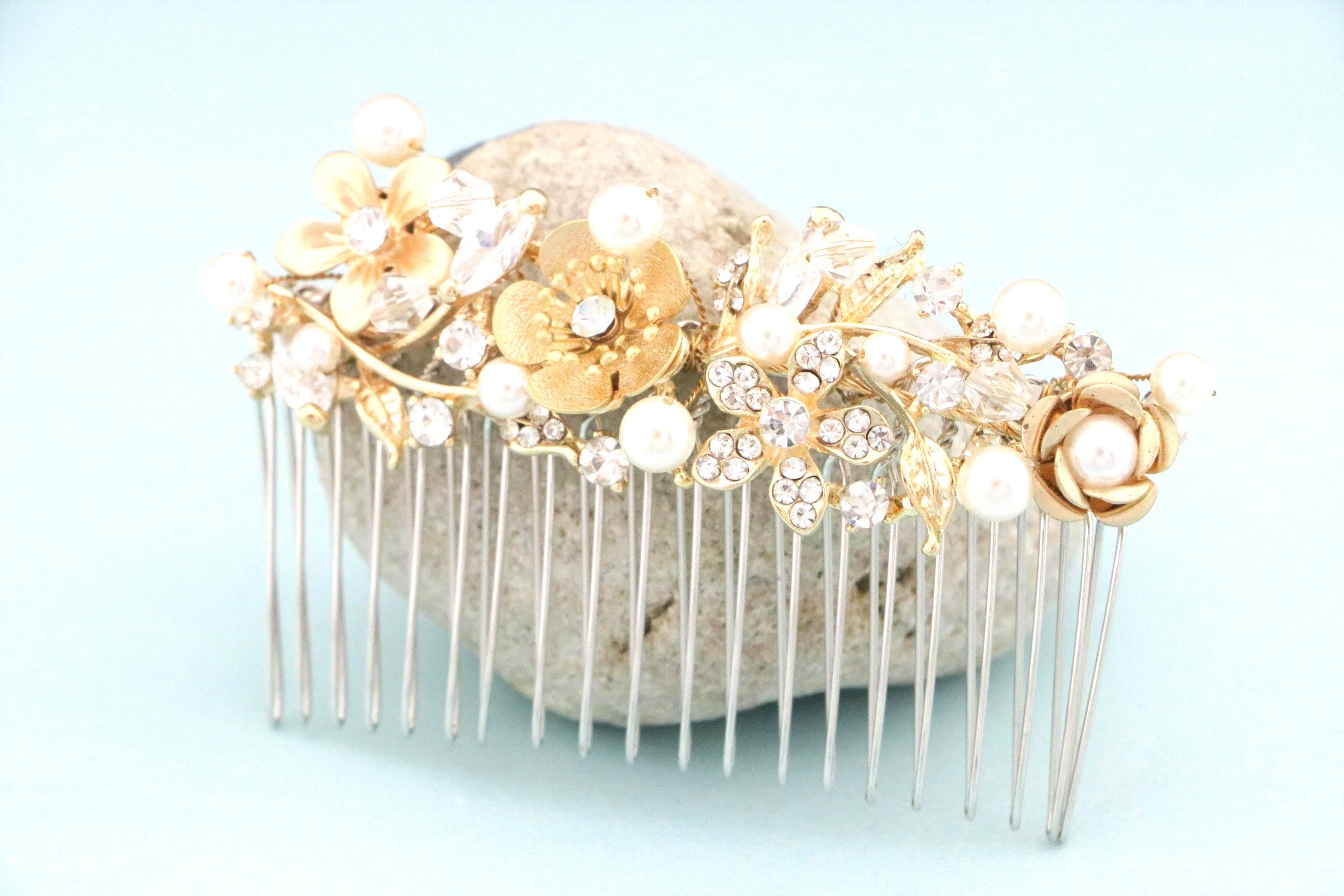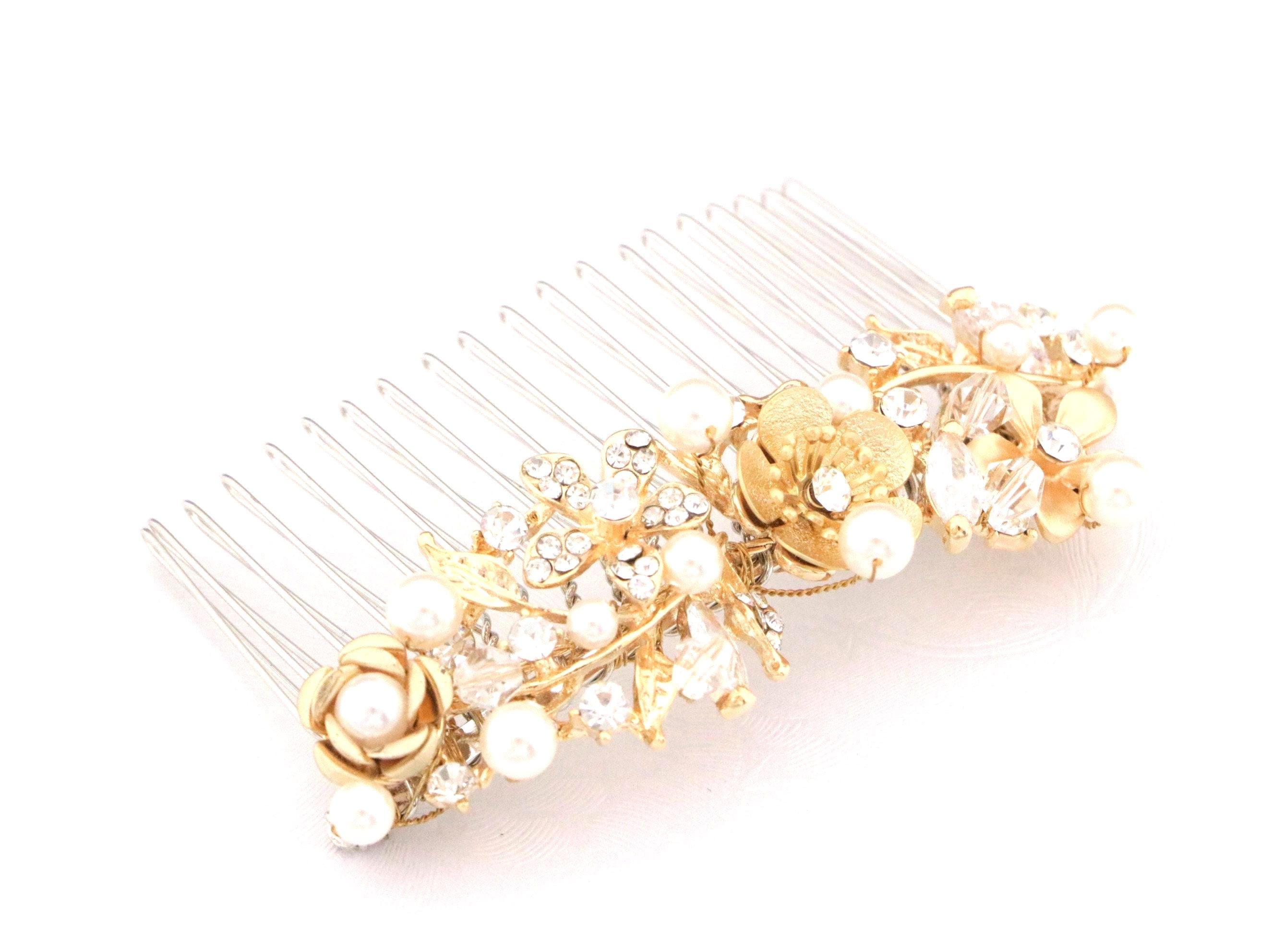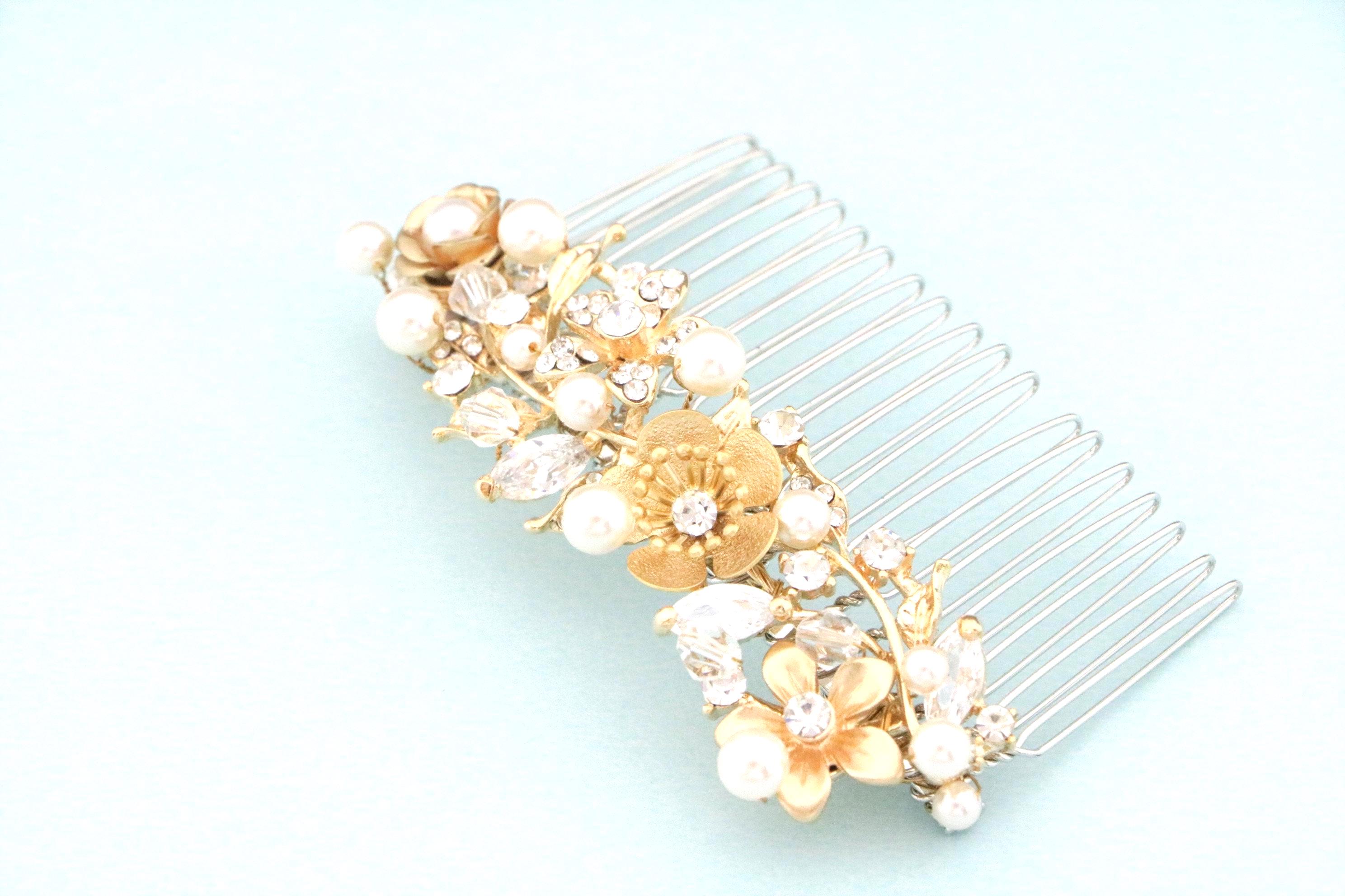 This sparkle Gold rhinestone hair comb features a very beautiful vintage style rhinestone piece and Swarovski pearls. Gold Rhinestone piece and pearls are set on a silver tone metal comb. The rhinestone part measures approximately 3.5 X 1 inches.